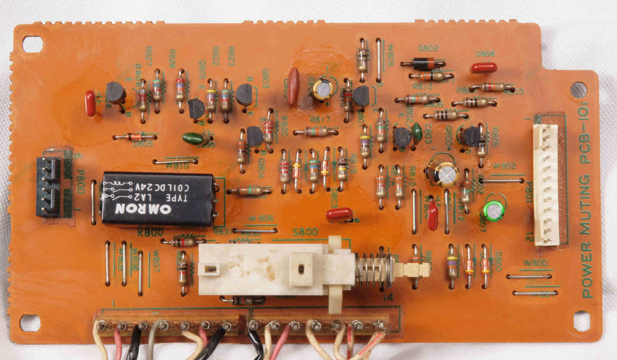 | C72. 修理後 出力ミューティング(プロテクト)基板。 電解コンデンサ−3個、リードリレー1個、フイルムコンデンサー4個交換。 | ||||||||||||||||||||||||||||||||||||||||