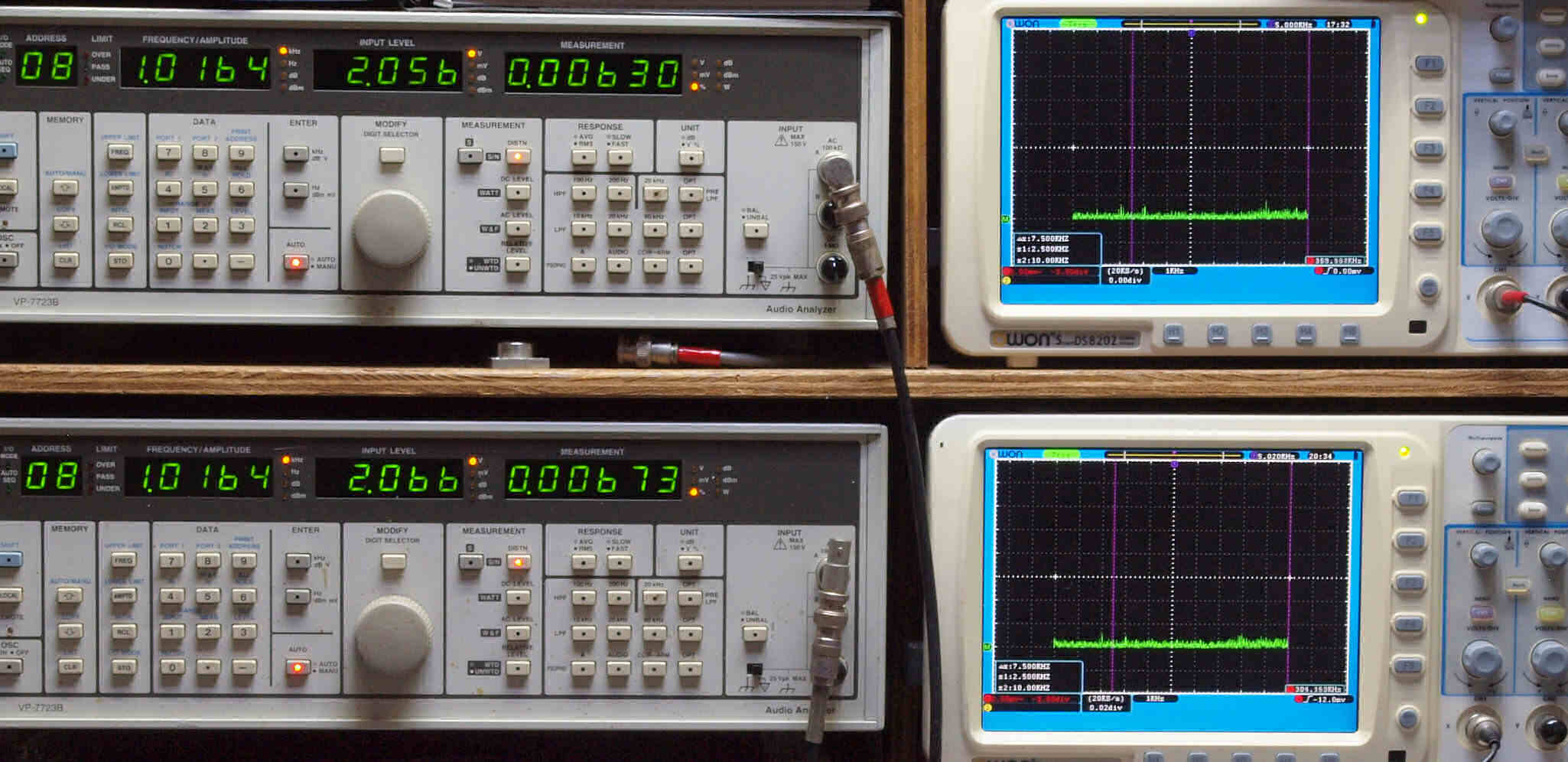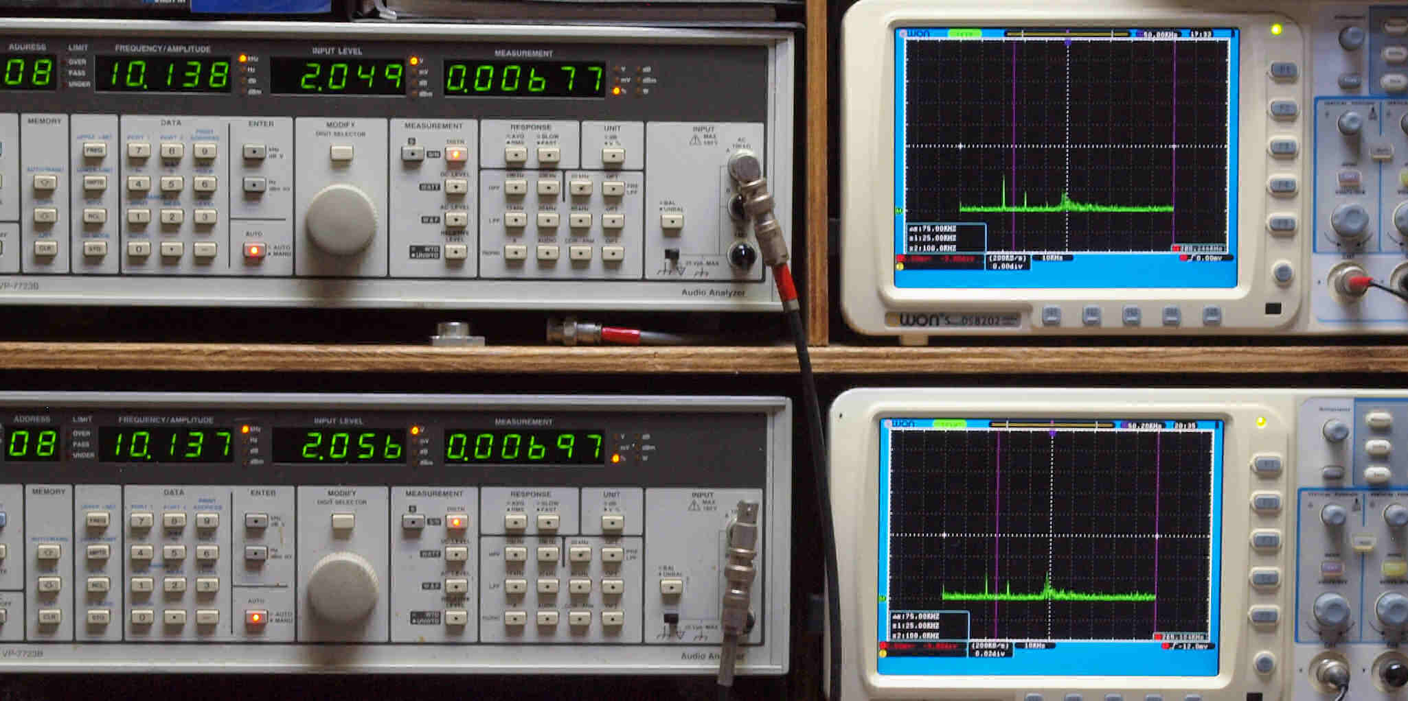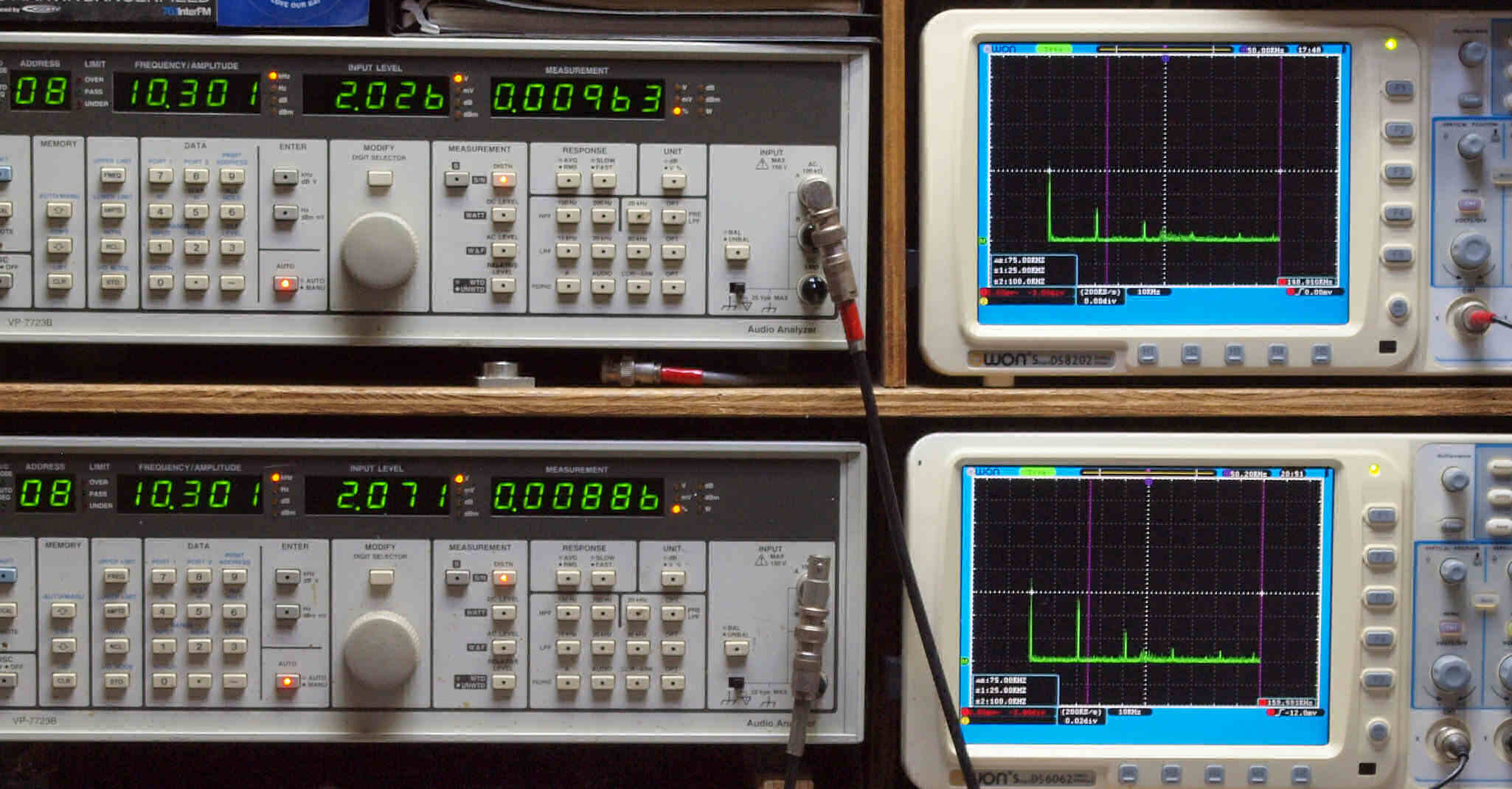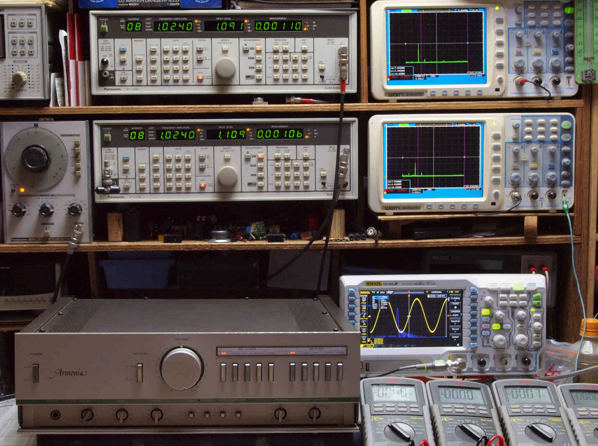 | E. 調整・測定。 画像をクリックすると、大きく(横幅2050ドット)表示されます。 E0. 出力・歪み率測定・調整。 「見方」。 上段中 右側SP出力を「Audio Analyzer Panasonic VP−7723B」により測定。 表示LED、 左端=メモリーNo、 中左=周波数測定、 中右=出力電圧測定、 右端=歪み率測定。 上段右端 VP−7723Bの基本波除去出力を「owon SDS8202(200MHZ)」で「FFT分析」表示。 下段中 左側SP出力を「Audio Analyzer Panasonic VP−7723B」により測定。 表示LED、 左端=メモリーNo、 中左=周波数測定、 中右=出力電圧測定、 右端=歪み率測定。 下段右端 VP−7723Bの基本波除去出力を「owon SDS6062(200MHZ)」で「FFT分析」表示。 下段左端 オーディオ発振器 VP−7201A より50Hz〜100kHzの信号を出し(歪み率=約0.003%)、ATT+分配器を通し、AMPに入力。 よって、ダイアル設定出力レベルより低くなります。測定機器の仕様や整備の様子はこちら、「VP−7723B」「VP−7201A」。 FFT画面の見方はこちら。 |