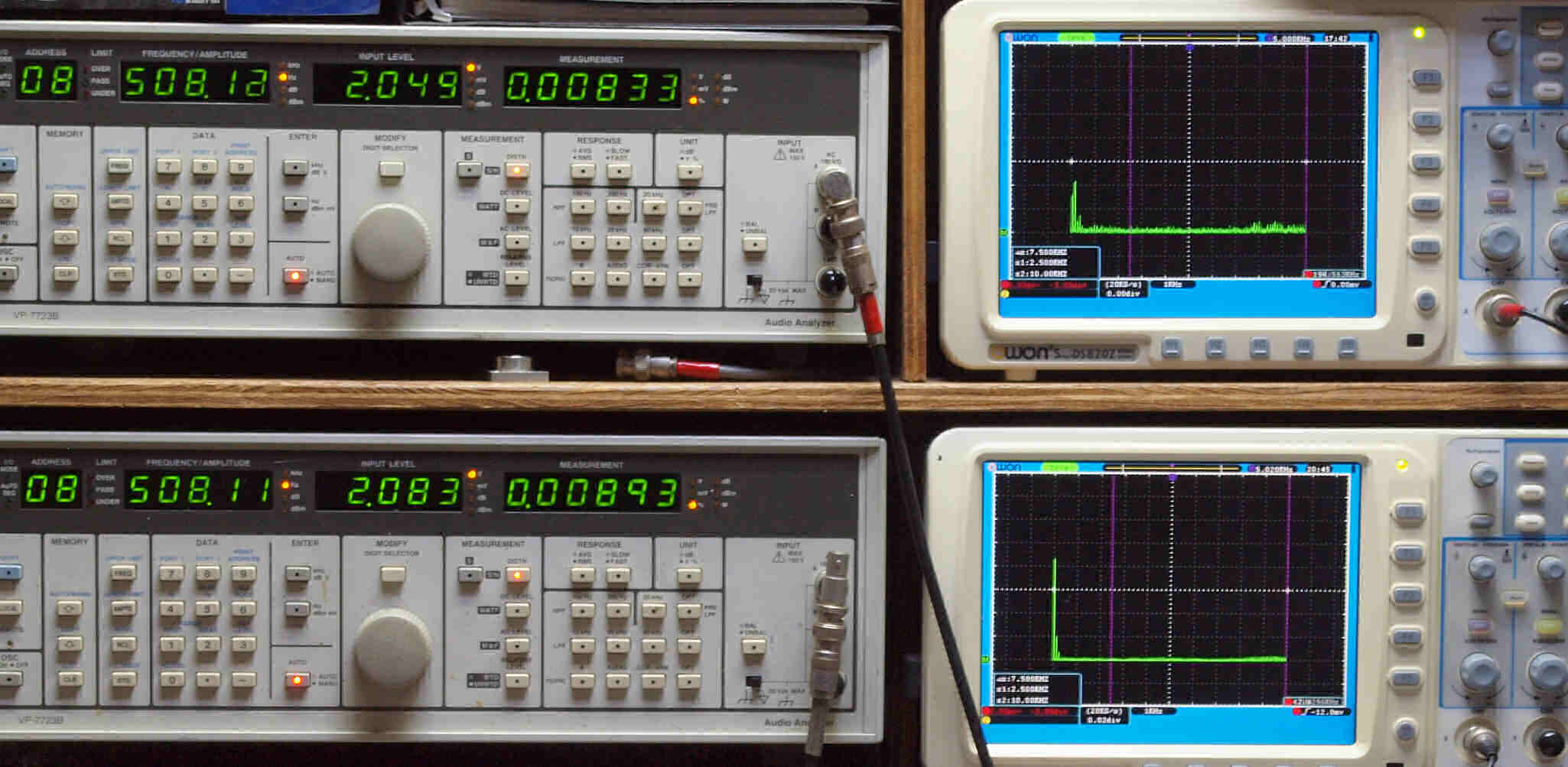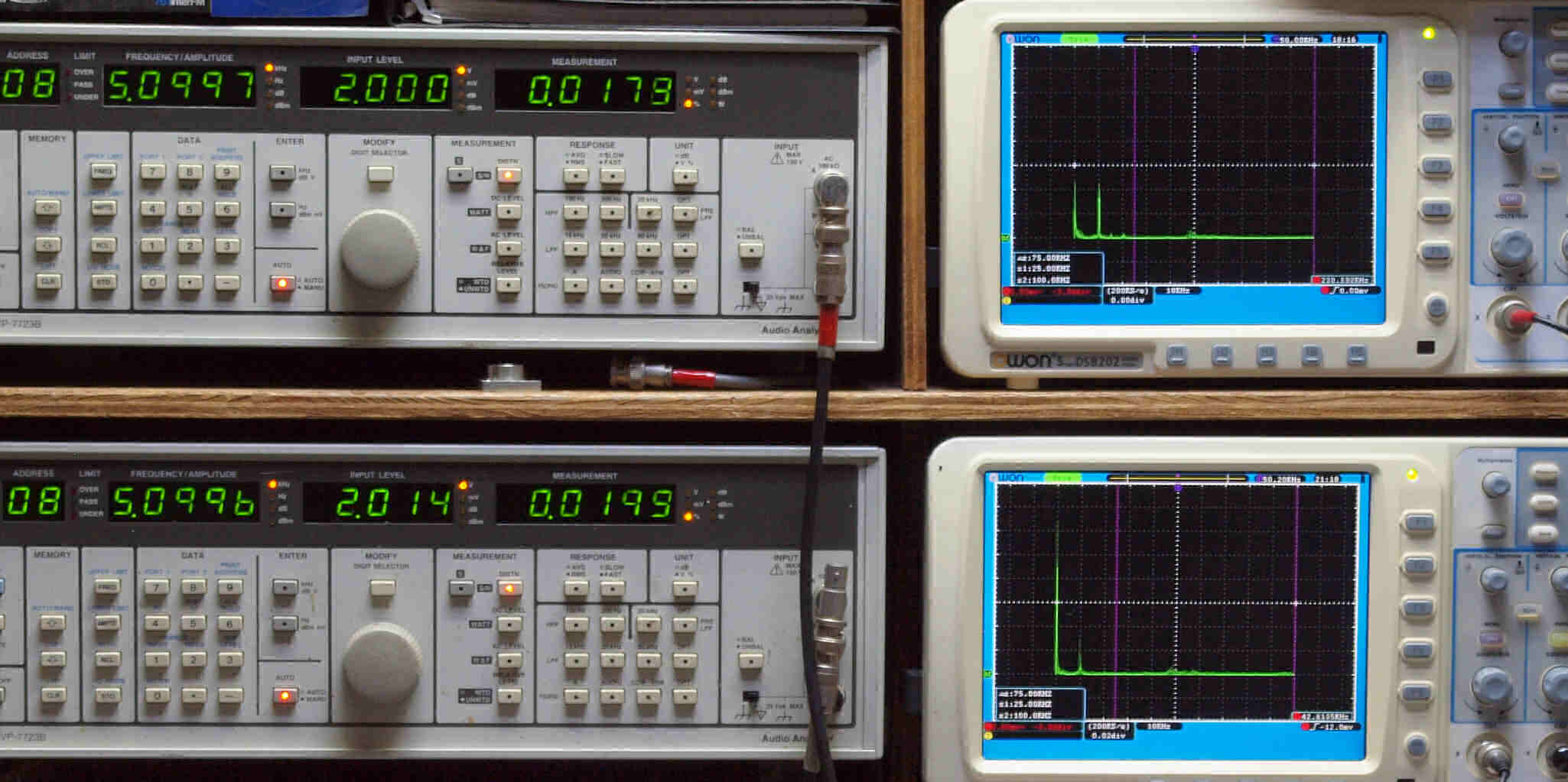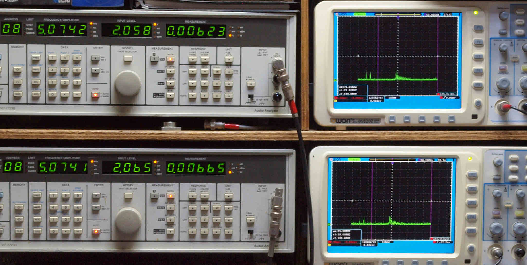 | E. 調整・測定。 画像をクリックすると、大きく(横幅2050ドット)表示されます。 E0. 出力・歪み率測定・調整。 「見方」。 上段中 右側SP出力を「Audio Analyzer Panasonic VP−7723B」により測定。 表示LED、 左端=メモリーNo、 中左=周波数測定、 中右=出力電圧測定、 右端=歪み率測定。 上段右端 VP−7723Bの基本波除去出力を「owon SDS8202(200MHZ)」で「FFT分析」表示。 下段中 左側SP出力を「Audio Analyzer Panasonic VP−7723B」により測定。 表示LED、 左端=メモリーNo、 中左=周波数測定、 中右=出力電圧測定、 右端=歪み率測定。 下段右端 VP−7723Bの基本波除去出力を「owon SDS6062(200MHZ)」で「FFT分析」表示。 下段左端 オーディオ発振器 VP−7201A より50Hz〜100kHzの信号を出し(歪み率=約0.003%)、ATT+分配器を通し、AMPに入力。 よって、ダイアル設定出力レベルより低くなります。測定機器の仕様や整備の様子はこちら、「VP−7723B」「VP−7201A」。 FFT画面の見方はこちら。 |