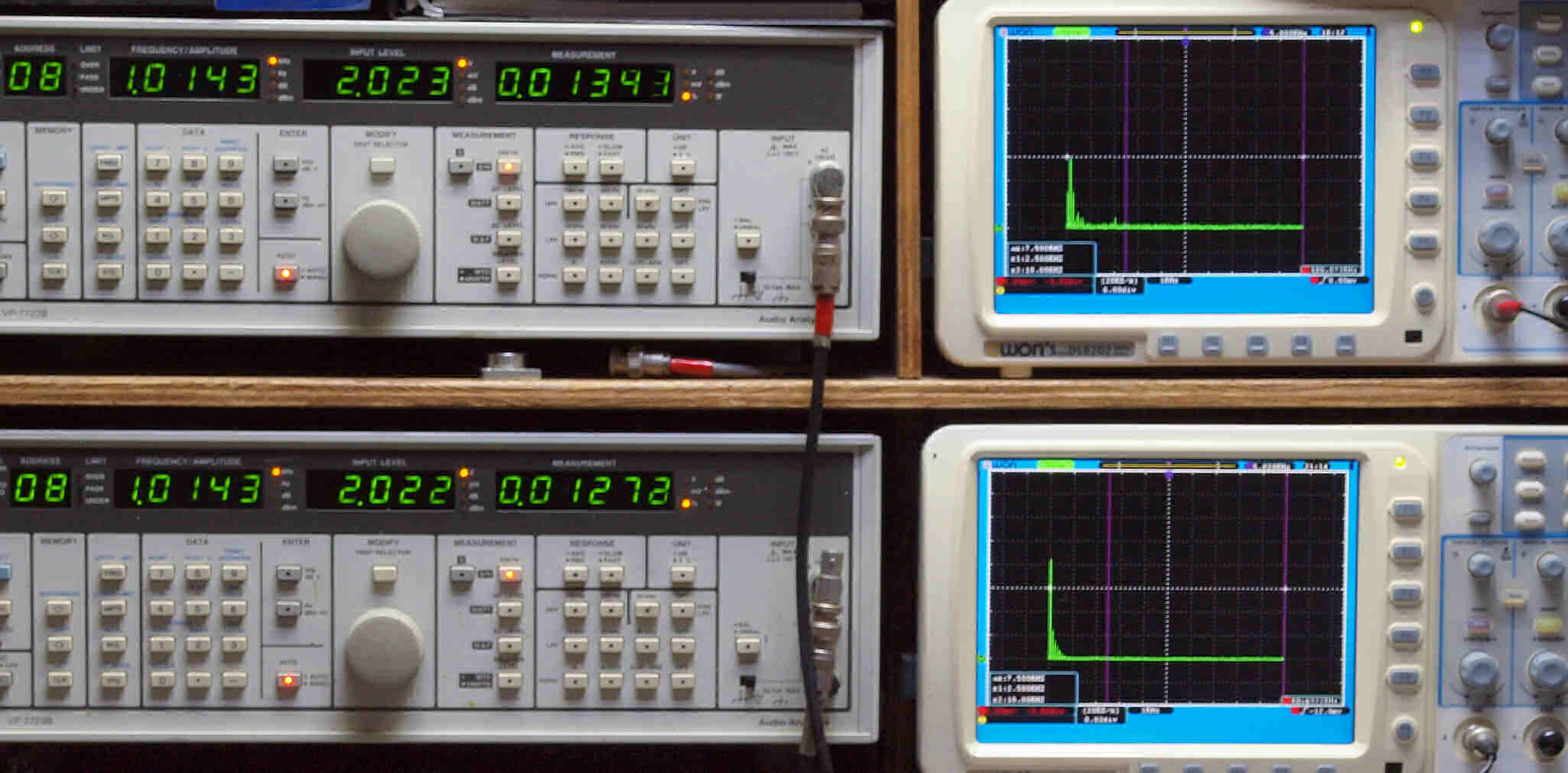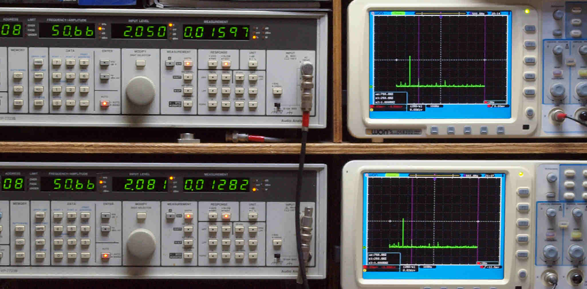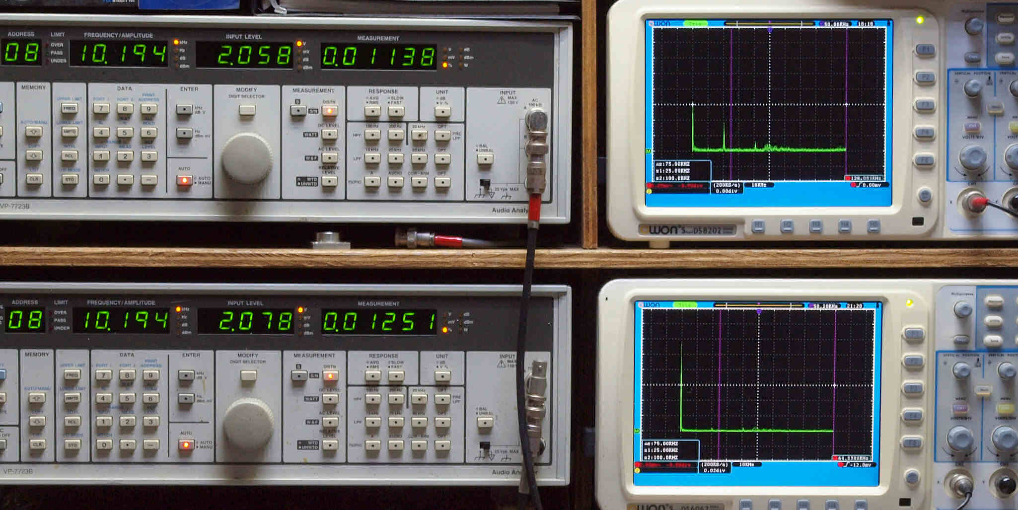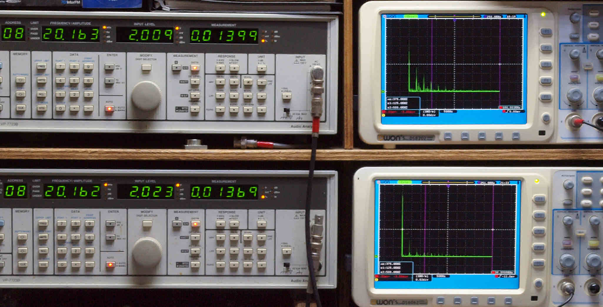 | E. 調整・測定。 画像をクリックすると、大きく(横幅2050ドット)表示されます。 E0. 出力・歪み率測定・調整。 「見方」。 上段中 右側SP出力を「Audio Analyzer Panasonic VP−7723B」により測定。 表示LED、 左端=メモリーNo、 中左=周波数測定、 中右=出力電圧測定、 右端=歪み率測定。 上段右端 VP−7723Bの基本波除去出力を「owon SDS8202(200MHZ)」で「FFT分析」表示。 下段中 左側SP出力を「Audio Analyzer Panasonic VP−7723B」により測定。 表示LED、 左端=メモリーNo、 中左=周波数測定、 中右=出力電圧測定、 右端=歪み率測定。 下段右端 VP−7723Bの基本波除去出力を「owon SDS6062(200MHZ)」で「FFT分析」表示。 下段左端 オーディオ発振器 VP−7201A より50Hz〜100kHzの信号を出し(歪み率=約0.003%)、ATT+分配器を通し、AMPに入力。 よって、ダイアル設定出力レベルより低くなります。測定機器の仕様や整備の様子はこちら、「VP−7723B」「VP−7201A」。 FFT画面の見方はこちら。 |