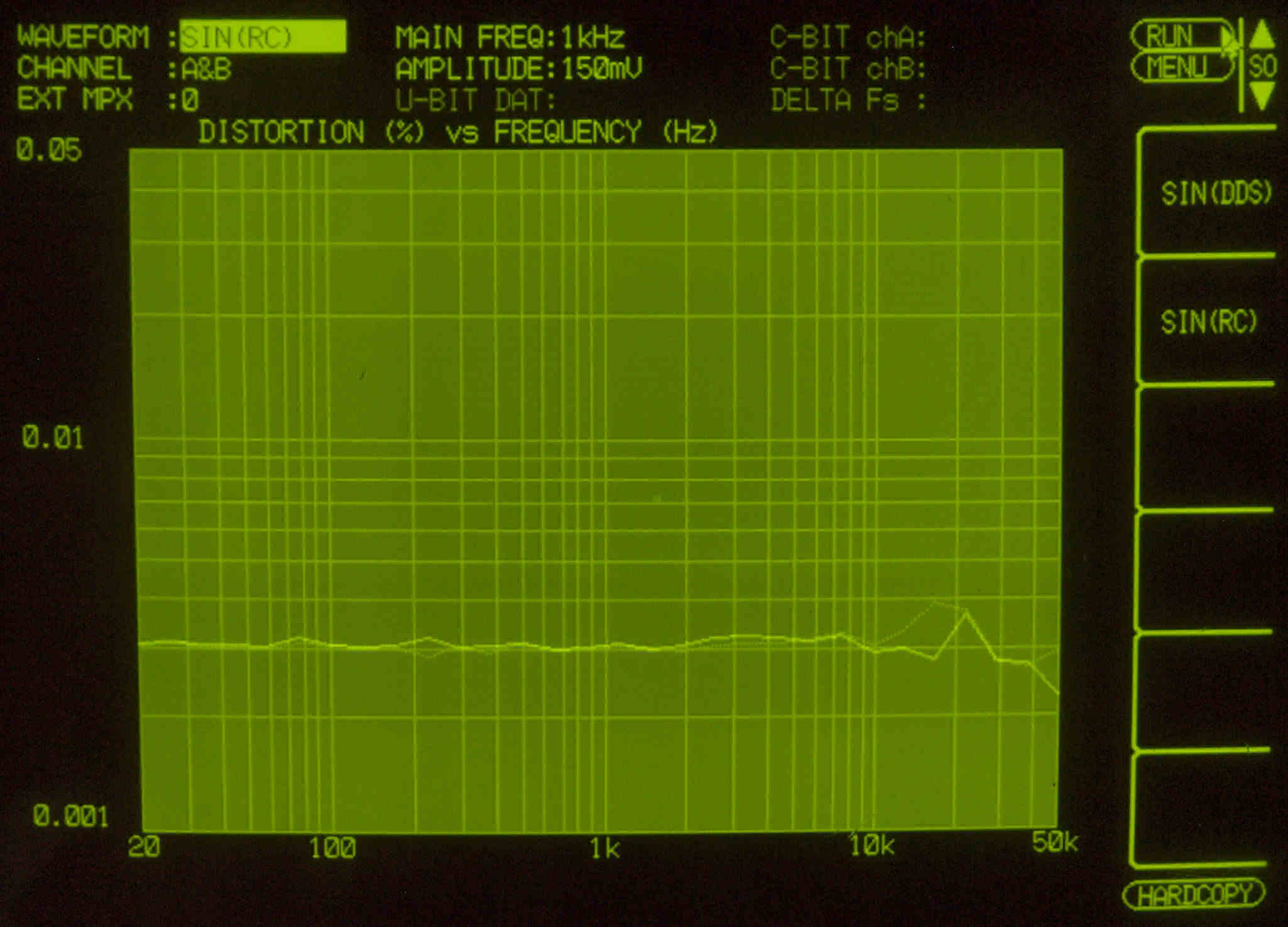| E31. MC_50Hz入力、 R側出力電圧=2V、 0.01597%歪み。 PHONO_1入力、 L側出力電圧=2V、 0.01282%歪み。 「FFT分析」のオシロのカーソル周波数、左=250Hz、右=1kHz。 |