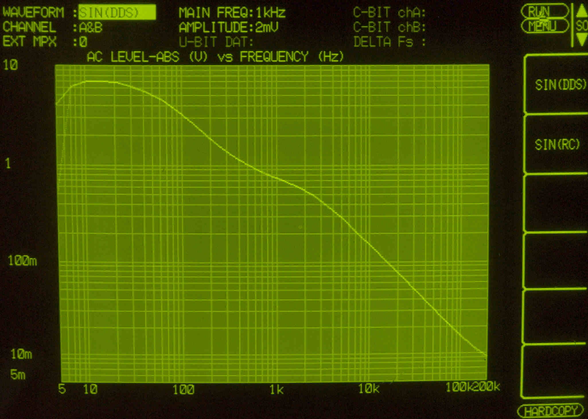 | F5. 入出力特性測定(MM入力)=PHONO−2 MC入力端子へ2mV入力 VRはmax 左出力=薄(細い)色 右出力=濃い(太い)色 |