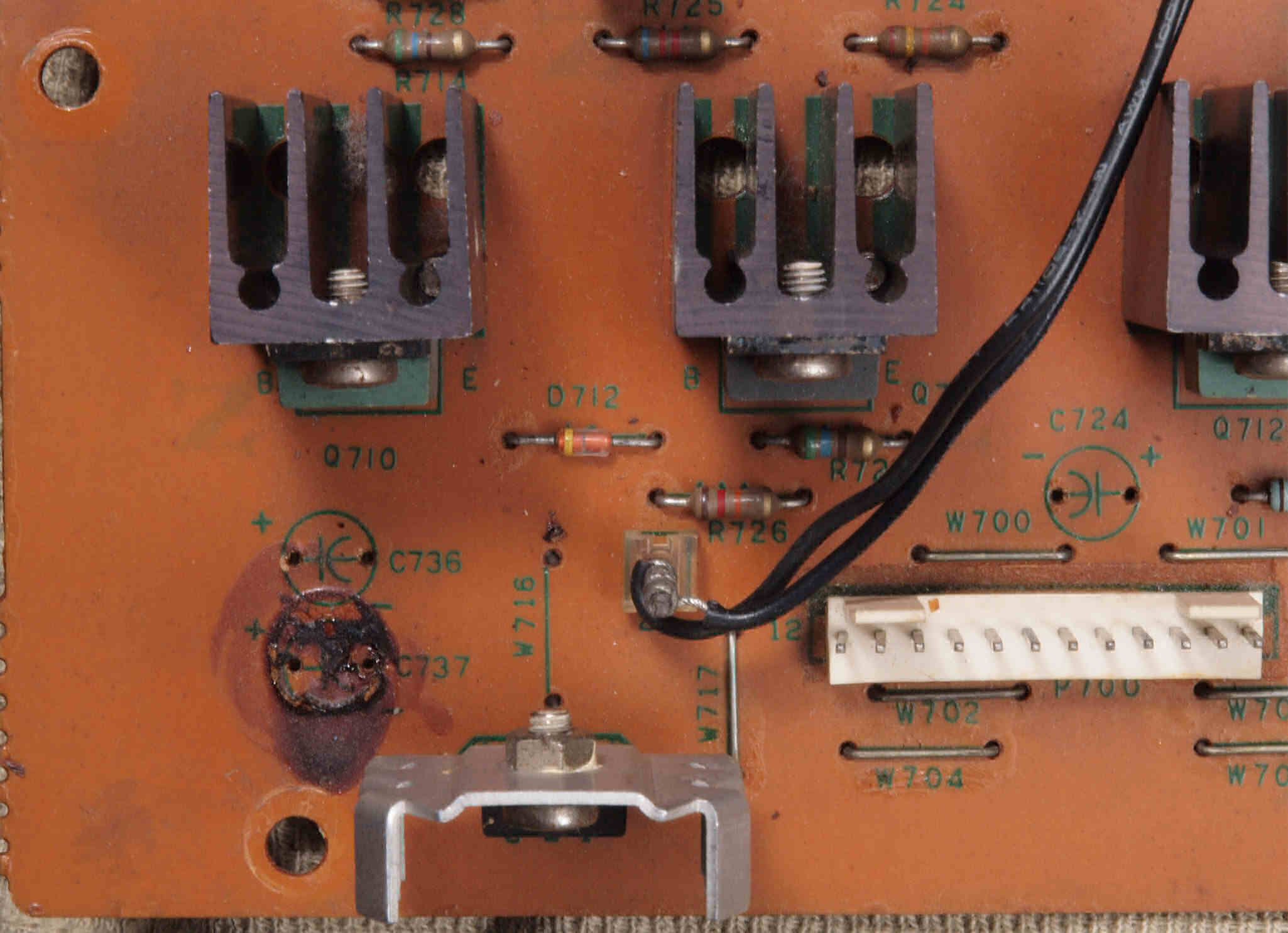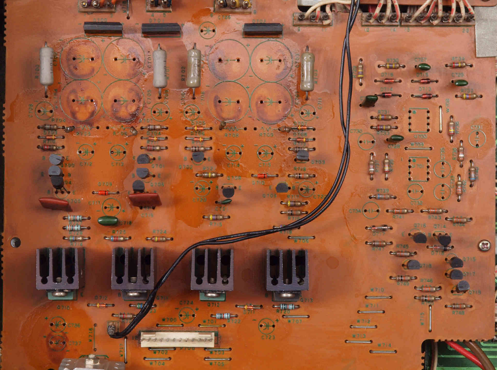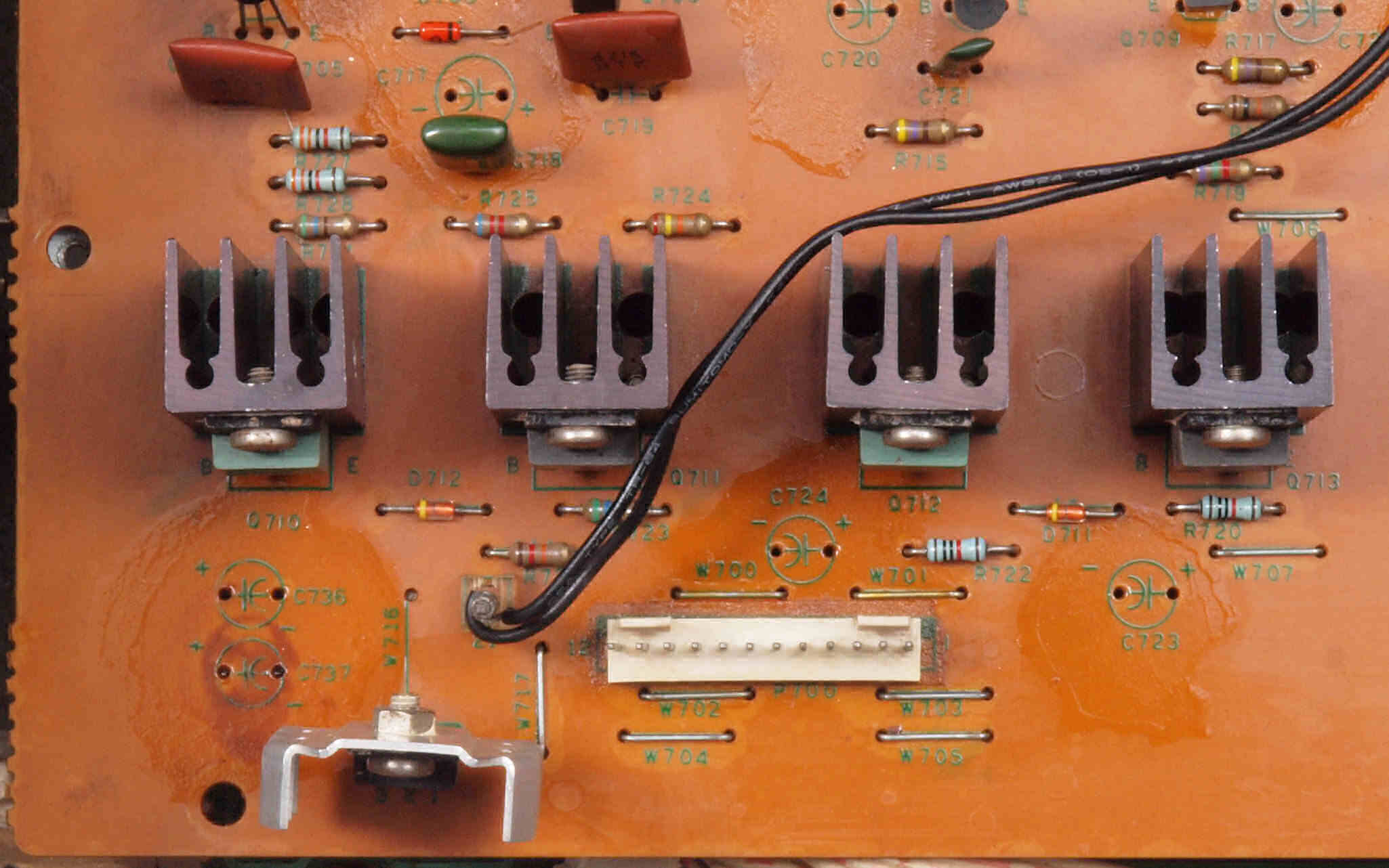 | C712. 修理中 出力ミューティング(プロテクト)基板。電解コンデンサー固定するトルエン溶媒の接着剤を取り去り、コートを塗布後。 | ||||||||||||||||||||||||||||||||||||||||