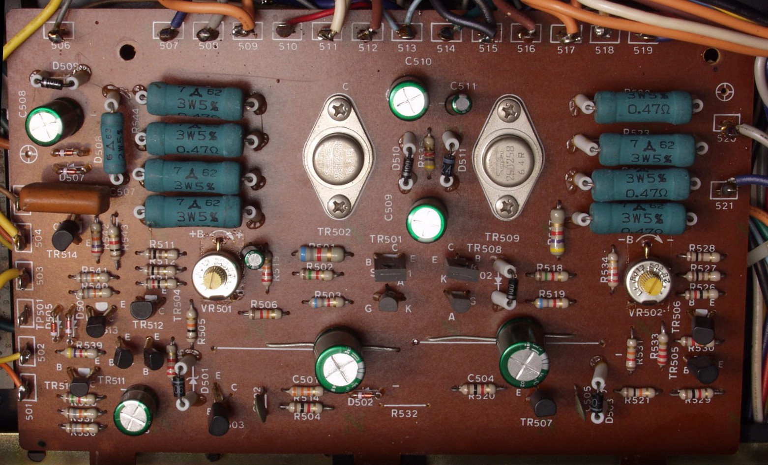 C2B. 修理後 Lドライブ基板 初段TR(トランジスター)2個、バランス/バイアス調整用半固定VR2個、