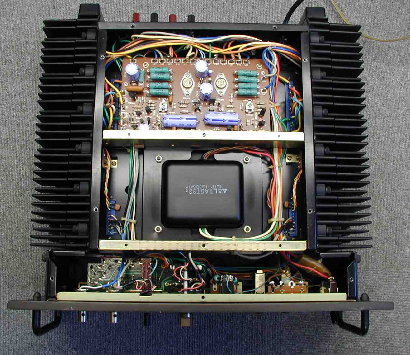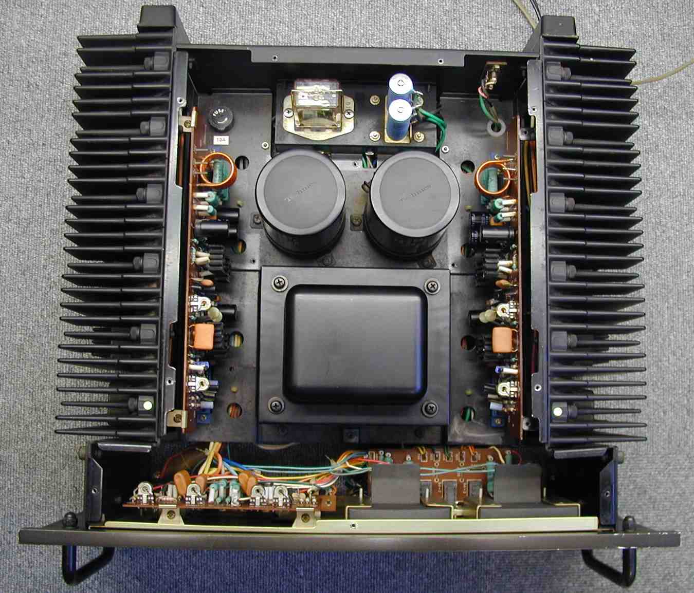 | 寸評 終段TR(トランジスタ−)の供給電圧まで安定化した理想的なAMPです。 途中で基盤改造がありますので、未対策器は修理した方が良いです(対作品は「2a」のシールが添付) 高域の発振対策を施し、安全の為、フューズを挿入した |