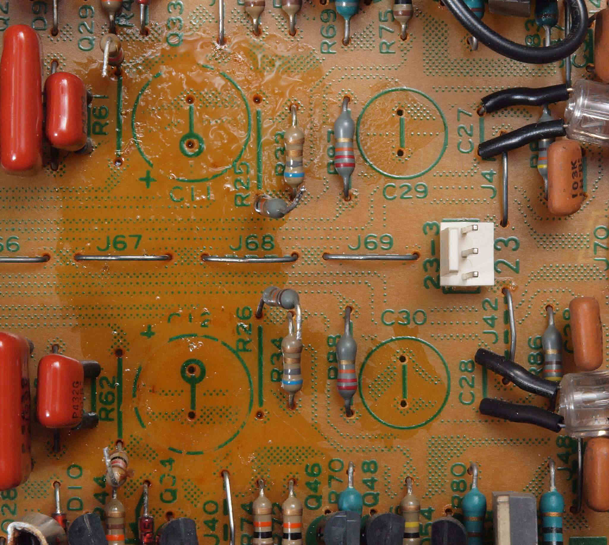 | C514. 修理中 EQ−AMP(equalize-amplifier)基板、 トルエン溶媒の接着剤を取り去り、コートを塗布後。 | ||||||||||||||||||||||||||||||||||||||||||||||||