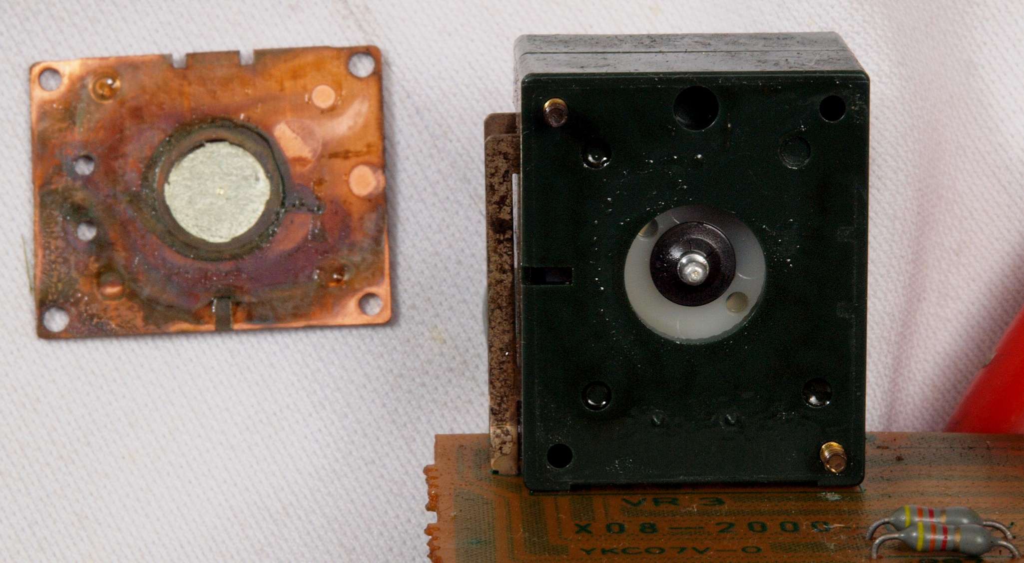| C75. VR点検中、カシメ構造なのでこれまで。 多量の接点復活材の使用でベタベタ。 これだけ多用すると、やがて、軸のグリスを溶け込み、接点の上に皮膜となる。 |