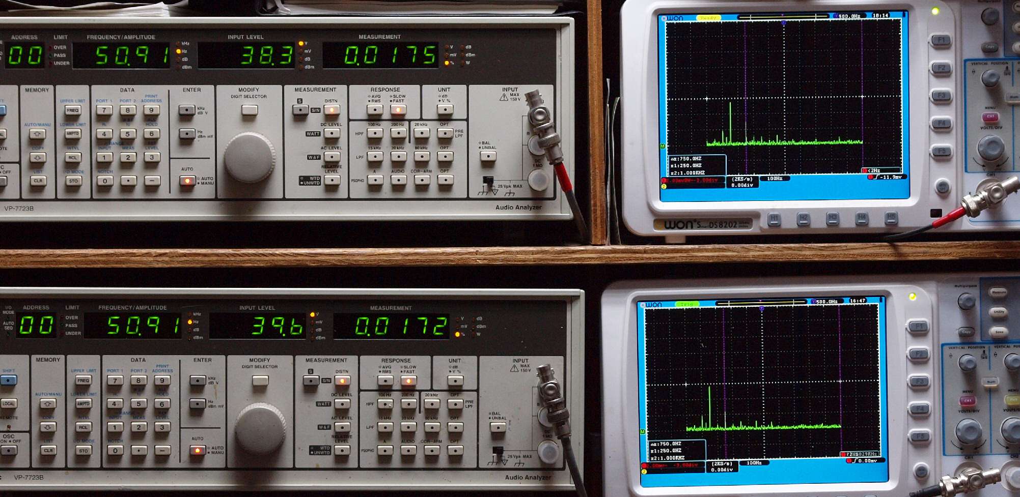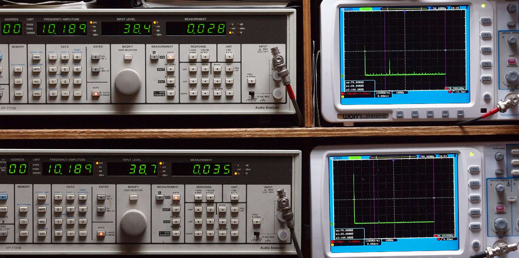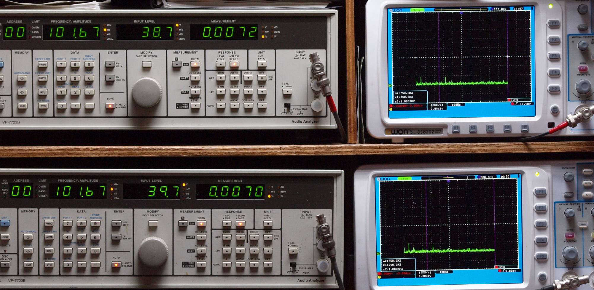 | E. 測定・調整。 画像をクリックすると、大きく(横幅2050ドット)表示されます。 E1. 出力・歪み率測定・調整 「見方」。 上段中 右側SP出力を「Audio Analyzer Panasonic VP−7723B」により測定。 表示LED、 左端=メモリーNo、 中左=周波数測定、 中右=出力電圧測定、 右端=歪み率測定。 上段右端 VP−7723Bの基本波除去出力を「owon SDS8202(200MHZ)」で「FFT分析」表示。 下段中 左側SP出力を「Audio Analyzer Panasonic VP−7723B」により測定。 表示LED、 左端=メモリーNo、 中左=周波数測定、 中右=出力電圧測定、 右端=歪み率測定。 下段右端 VP−7723Bの基本波除去出力を「owon SDS6062(200MHZ)」で「FFT分析」表示。 下段左端 オーディオ発振器 VP−7201A より50Hz〜100kHzの信号を出し(歪み率=約0.003%)、ATT+分配器を通し、AMPに入力。 よって、ダイアル設定出力レベルより低くなります。測定機器の仕様や整備の様子はこちら、「VP−7723B」「VP−7201A」。 FFT画面の見方はこちら。 |