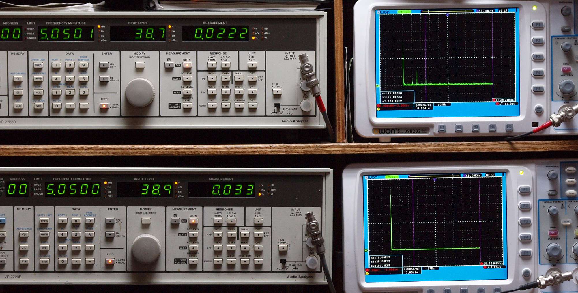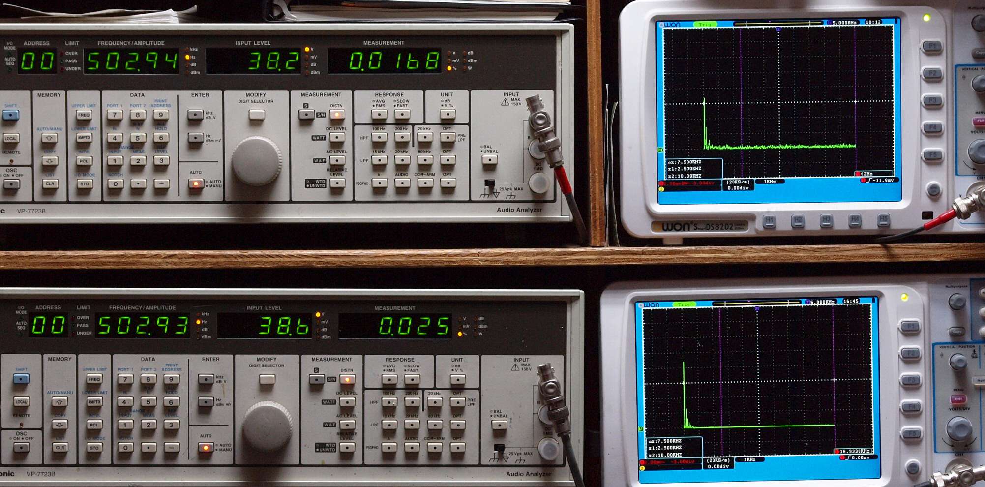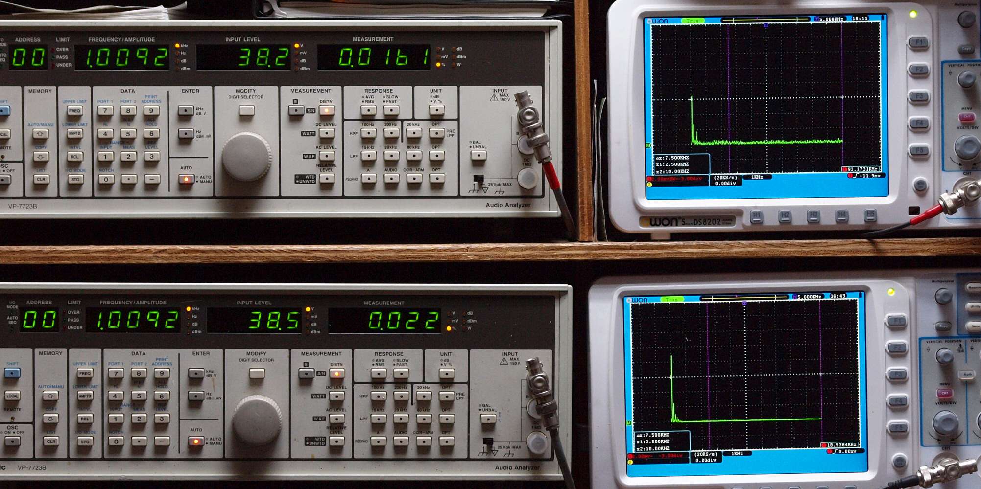 | E. 測定・調整。 画像をクリックすると、大きく(横幅2050ドット)表示されます。 E1. 出力・歪み率測定・調整 「見方」。 上段中 右側SP出力を「Audio Analyzer Panasonic VP−7723B」により測定。 表示LED、 左端=メモリーNo、 中左=周波数測定、 中右=出力電圧測定、 右端=歪み率測定。 上段右端 VP−7723Bの基本波除去出力を「owon SDS8202(200MHZ)」で「FFT分析」表示。 下段中 左側SP出力を「Audio Analyzer Panasonic VP−7723B」により測定。 表示LED、 左端=メモリーNo、 中左=周波数測定、 中右=出力電圧測定、 右端=歪み率測定。 下段右端 VP−7723Bの基本波除去出力を「owon SDS6062(200MHZ)」で「FFT分析」表示。 下段左端 オーディオ発振器 VP−7201A より50Hz〜100kHzの信号を出し(歪み率=約0.003%)、ATT+分配器を通し、AMPに入力。 よって、ダイアル設定出力レベルより低くなります。測定機器の仕様や整備の様子はこちら、「VP−7723B」「VP−7201A」。 FFT画面の見方はこちら。 |