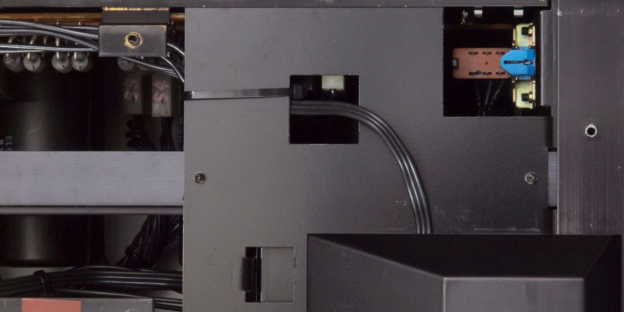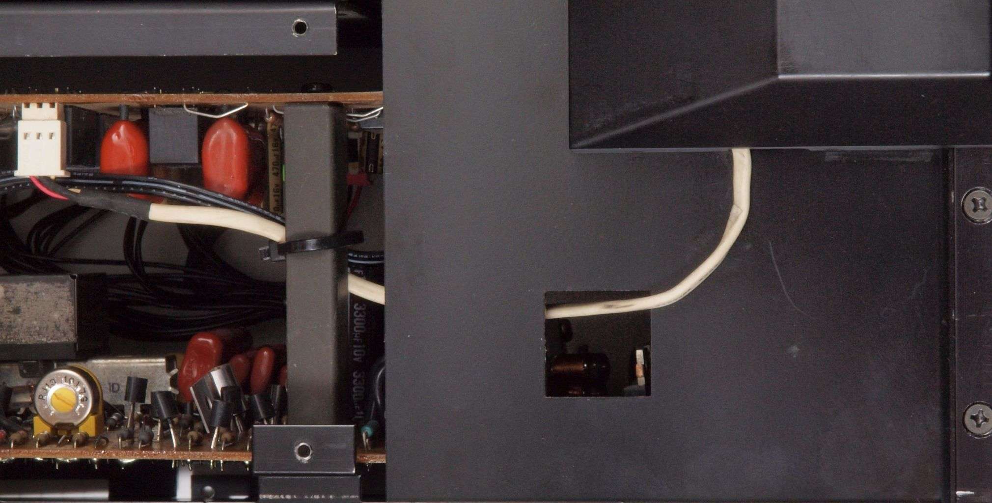 A254. 点検中 下蓋を取り下から見る、 AUX入力のケーブルを噛んでいる。