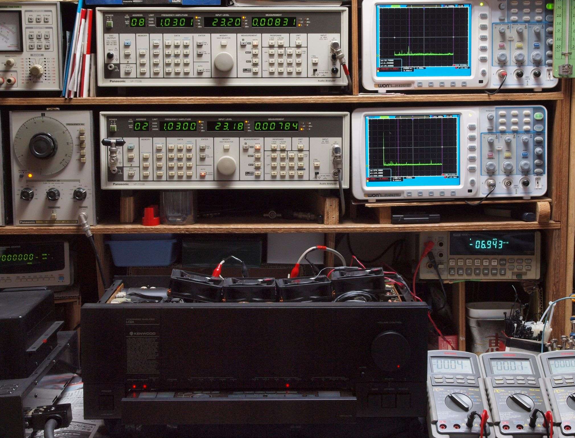 下段左端 オーディオ発振器 VP−7201A より50Hz〜100kHzの信号を出し(歪み率=約0.003%)、ATT+分配器を通し、AMPに入力。