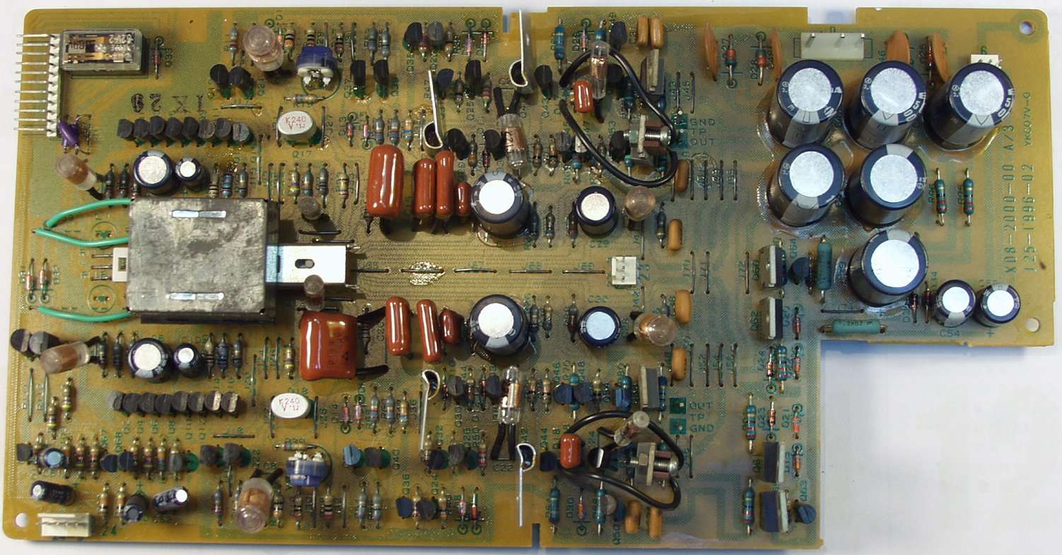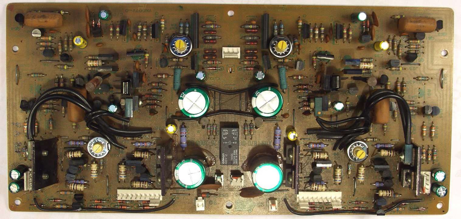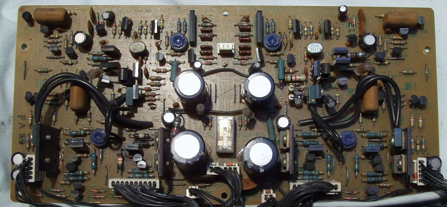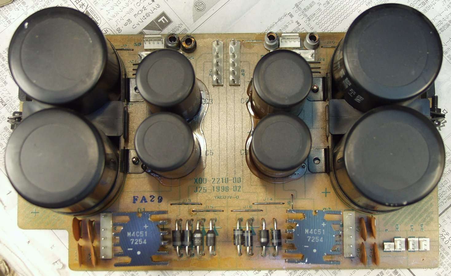 • 熱、経年変化の為終段TR(トランジスター)短絡、それにより前段のTR(トランジスター)、抵抗が多数焼損。