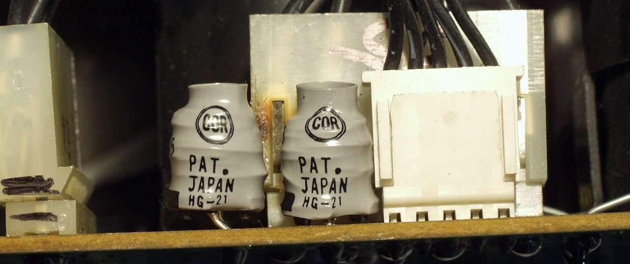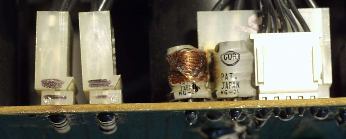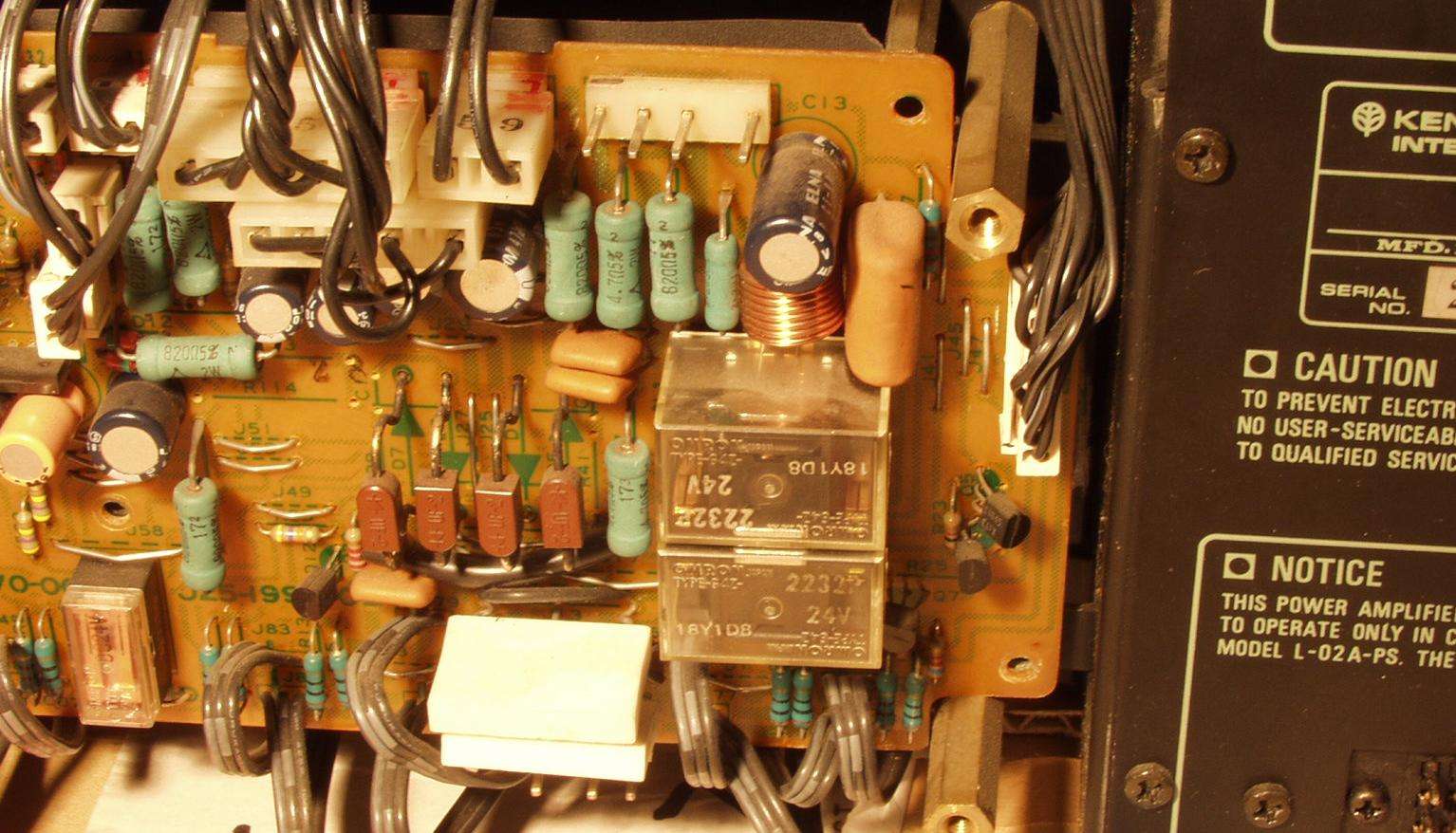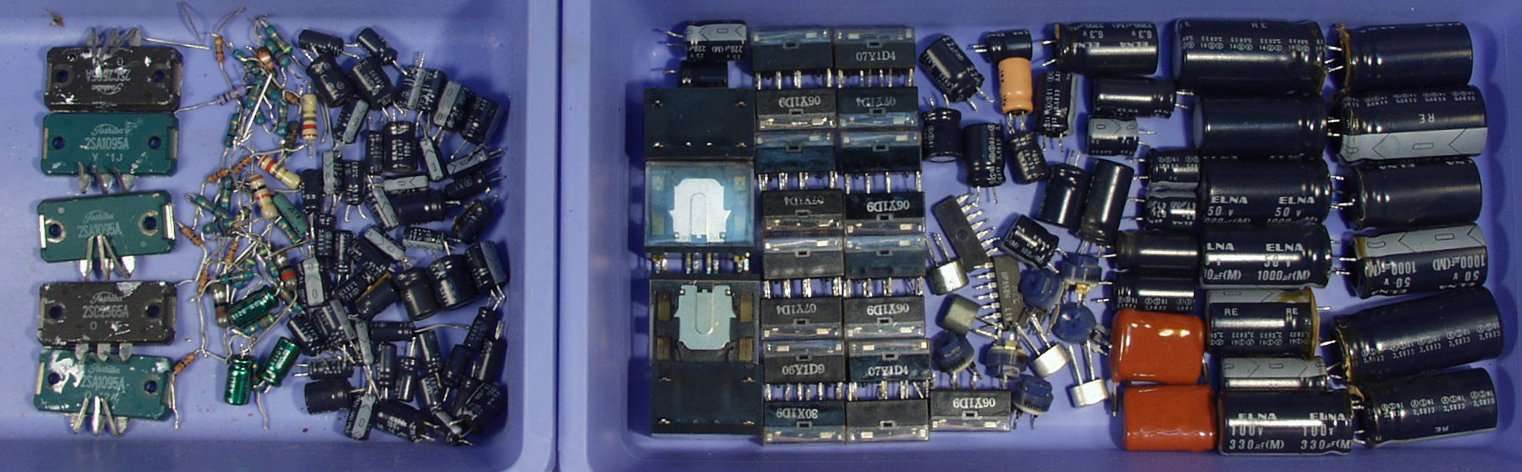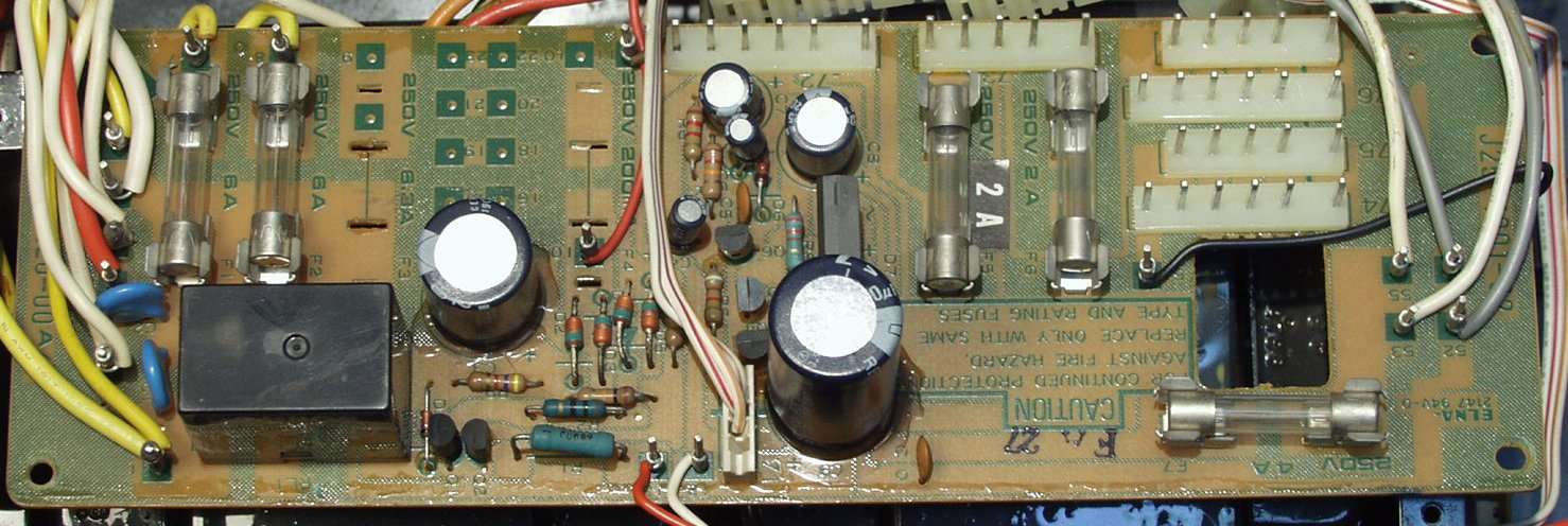 • 熱、経年変化の為終段TR(トランジスター)短絡、それにより前段のTR(トランジスター)、抵抗が多数焼損。
