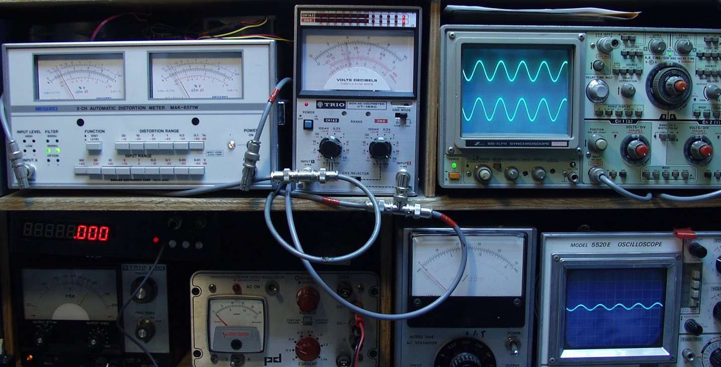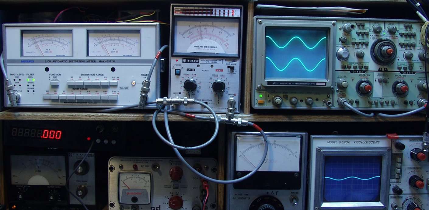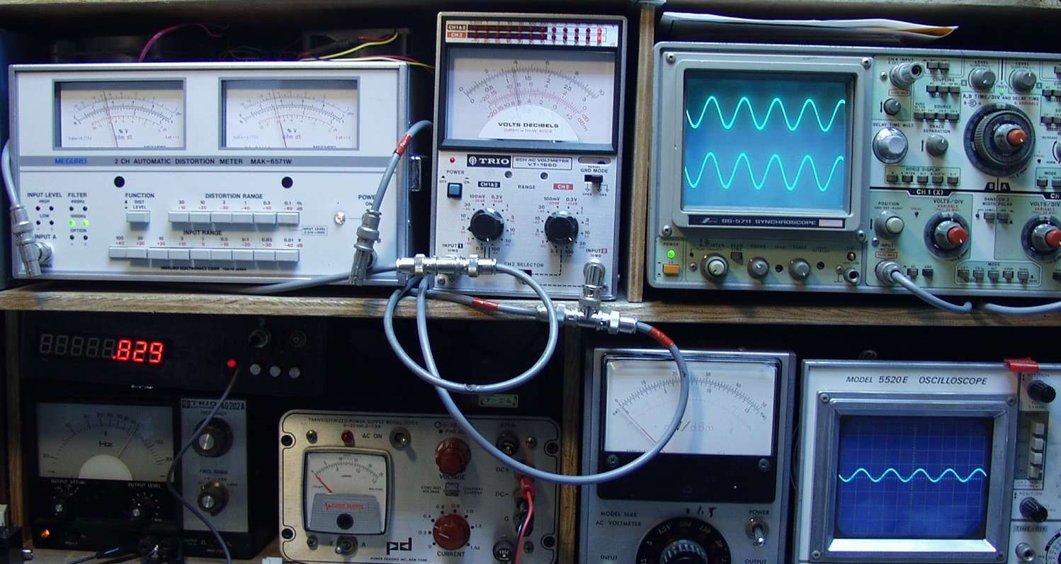 左=歪率計 中=電圧計 右=出力波形 右下=入力波形
