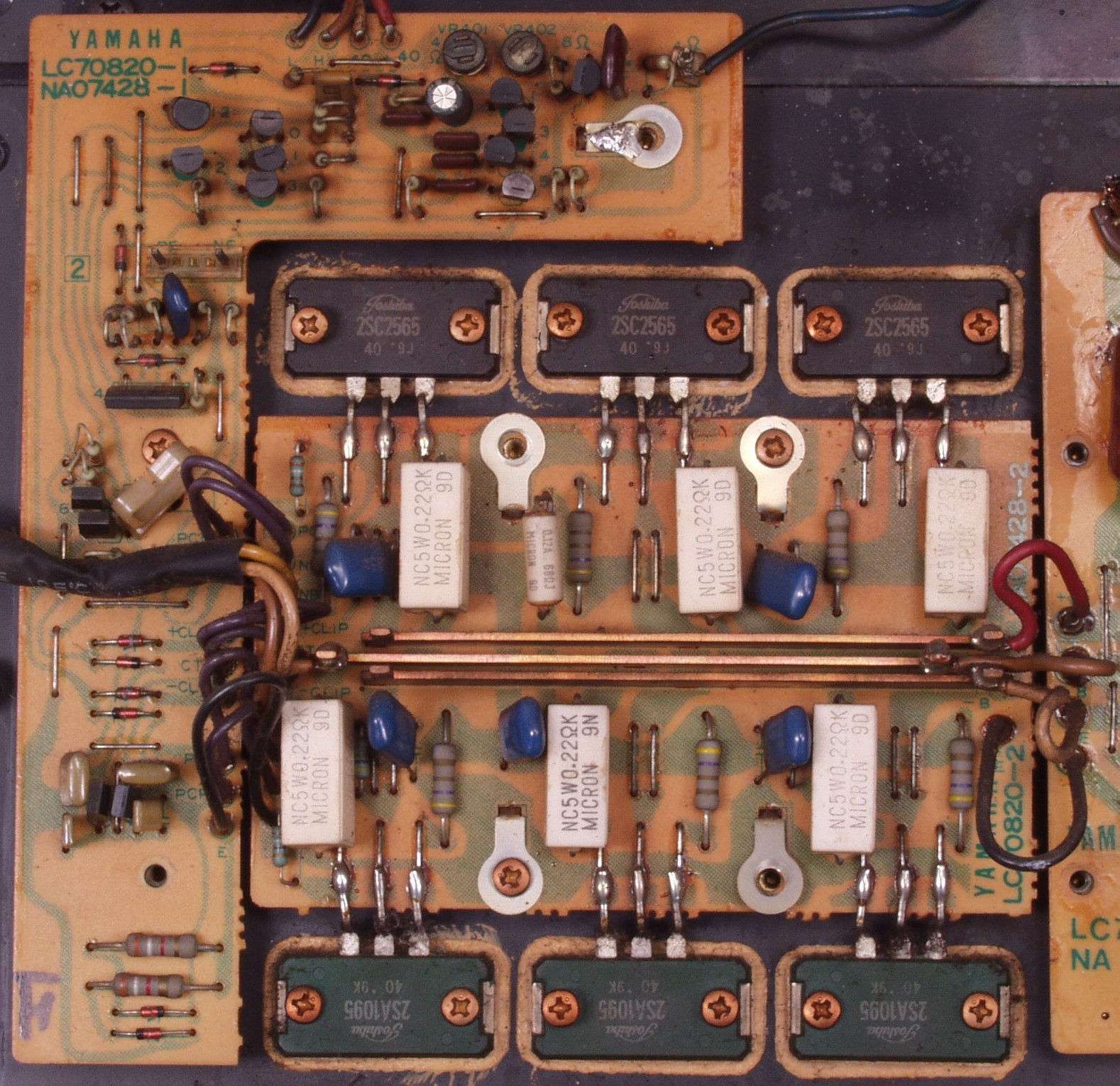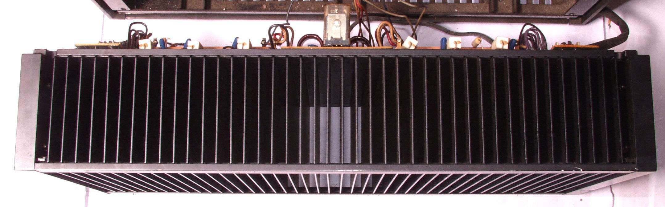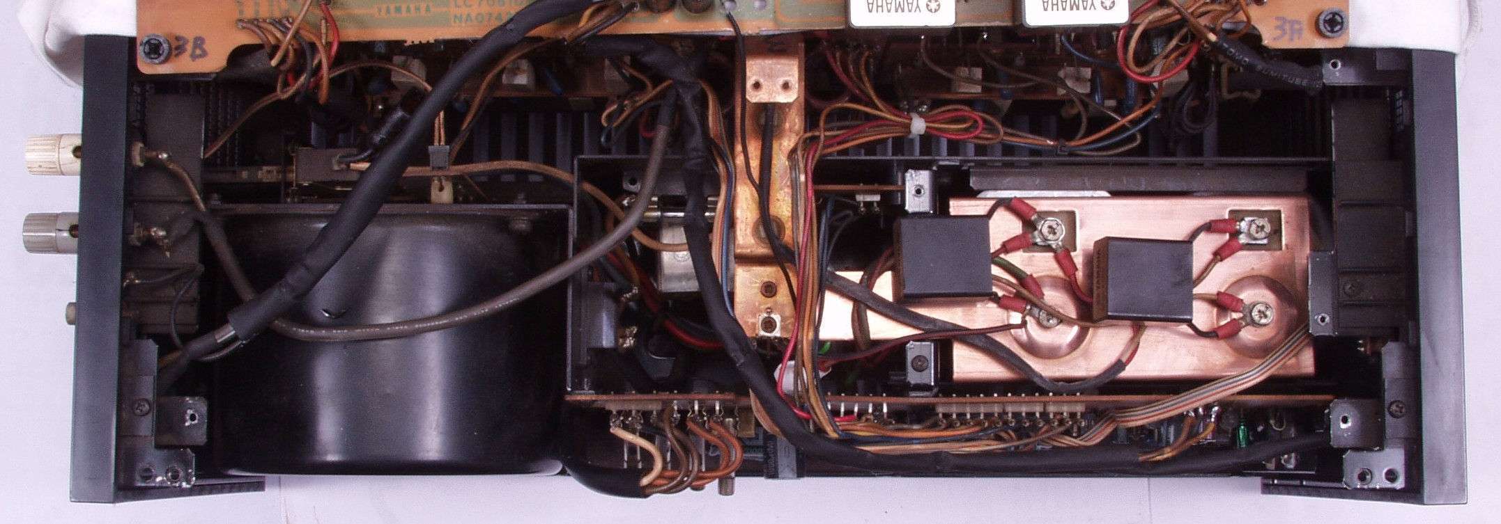 | A8C. 点検中 B側終段基板。 基板上で電源と出力ラインは銅板使用、 上・右はバイアス・リミッター基板。 | ||||||||||||||||||||||||||||||||||||||