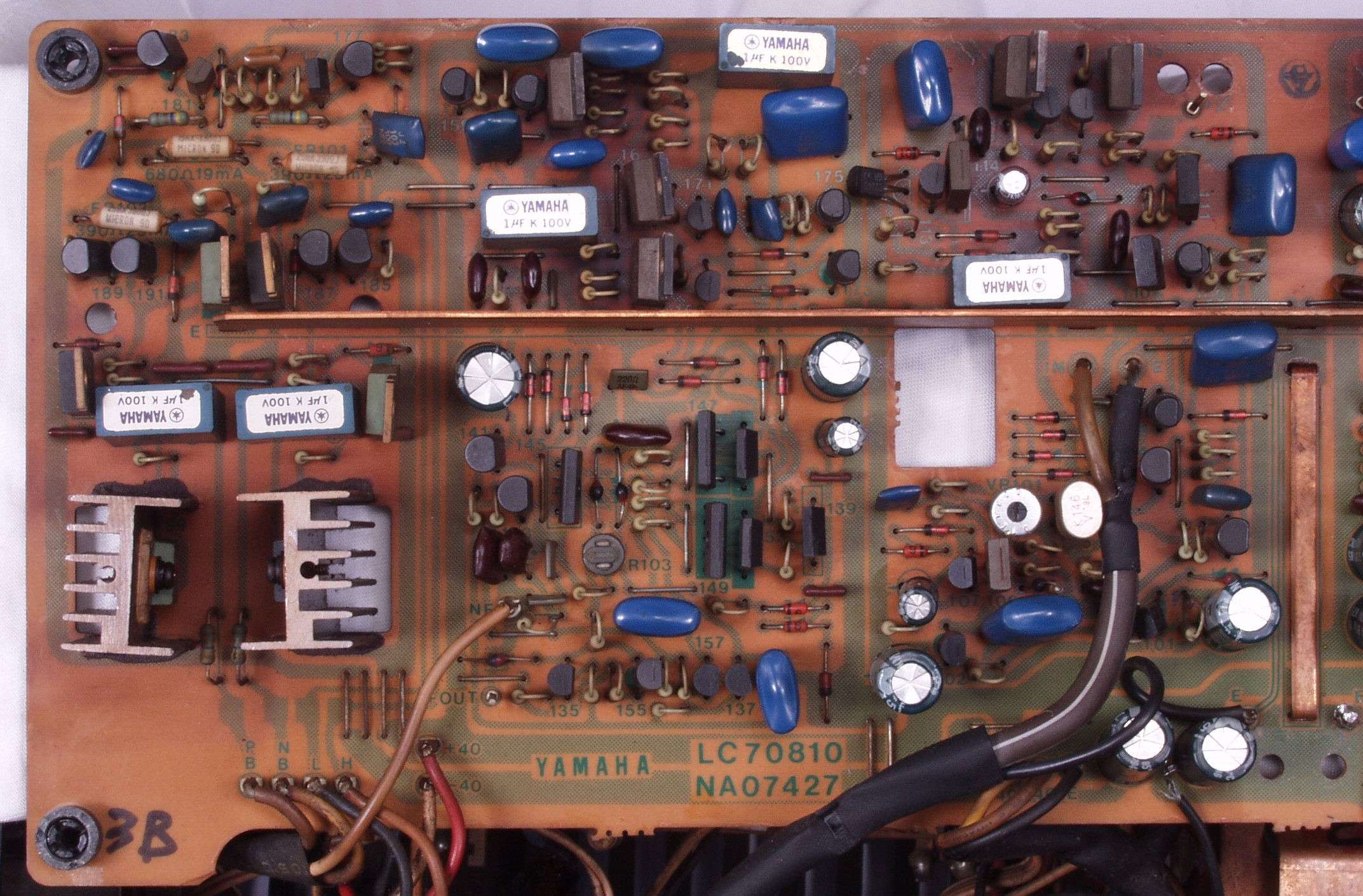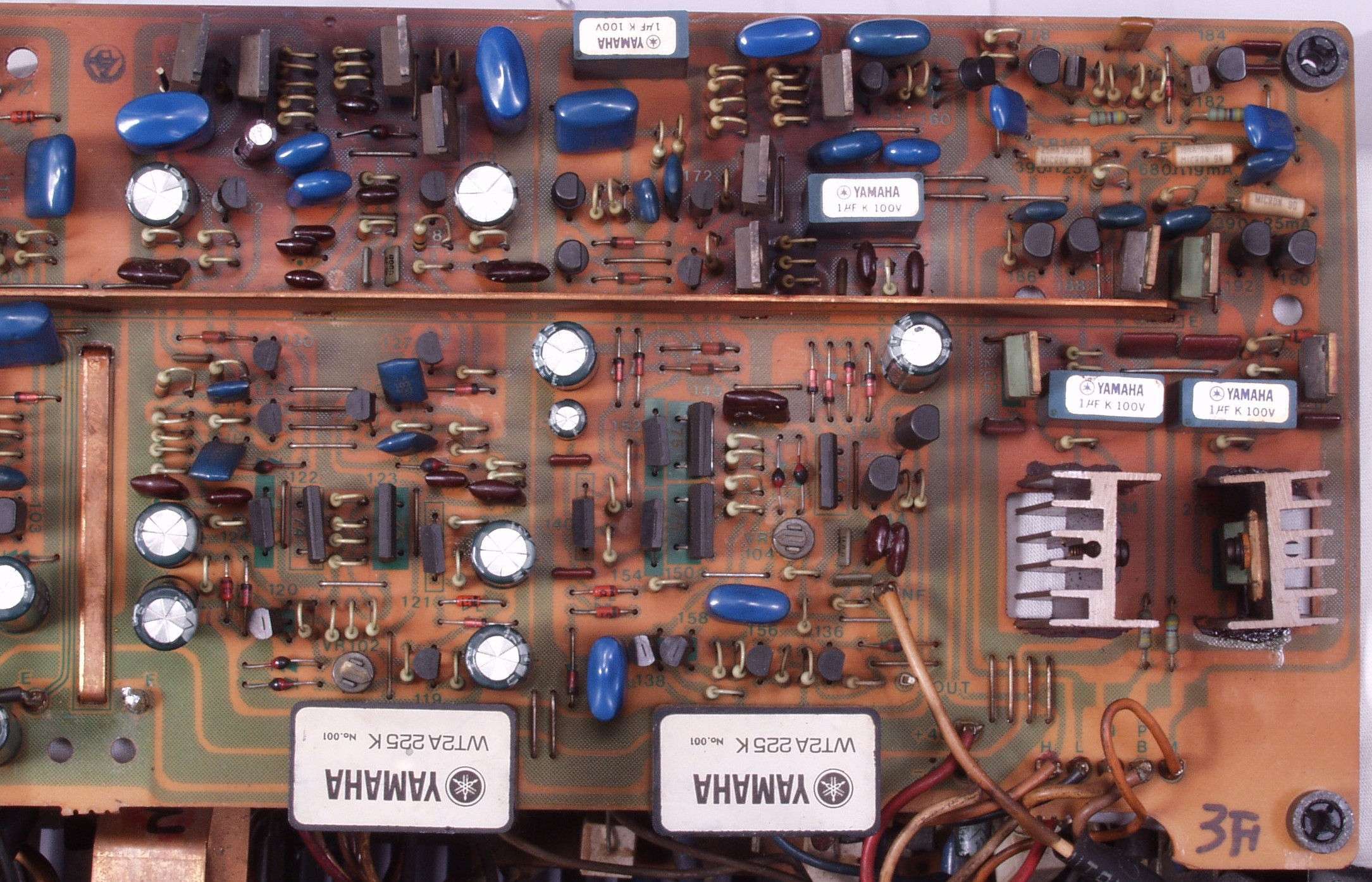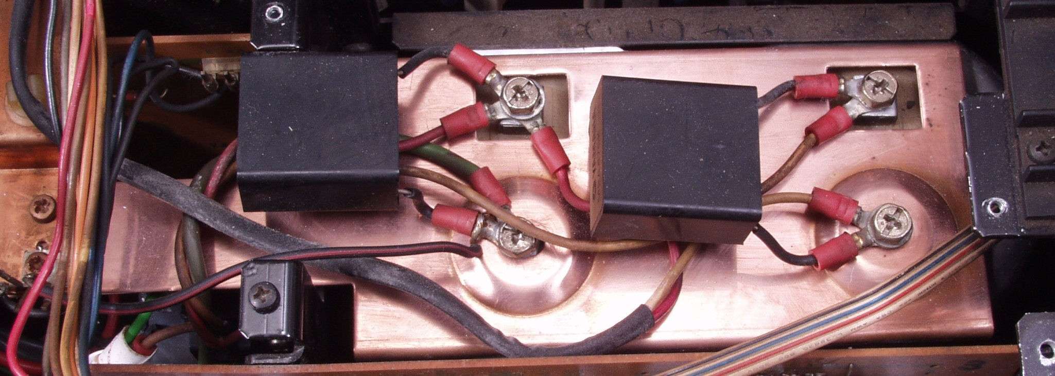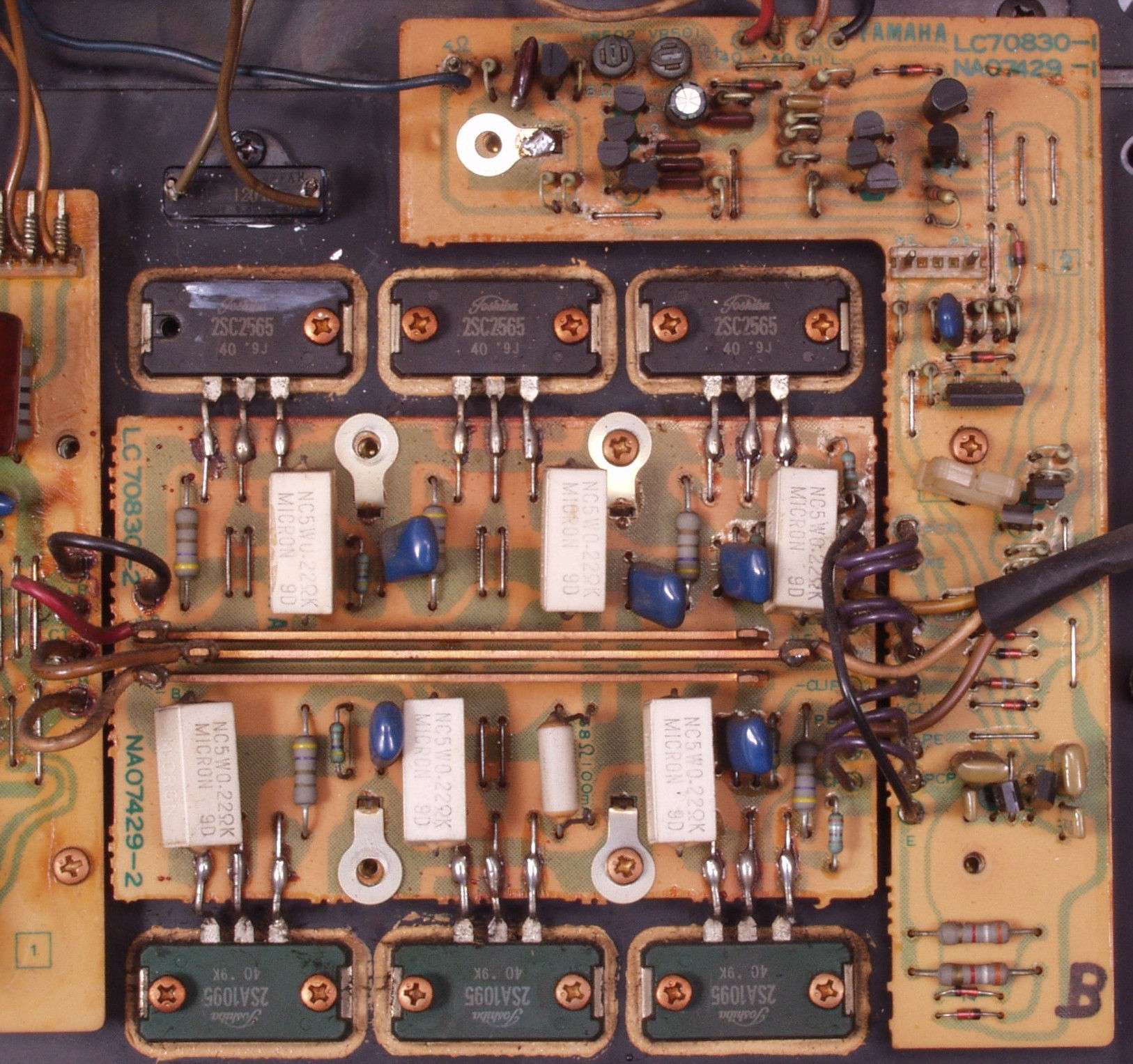 | A8C. 点検中 B側終段基板。 基板上で電源と出力ラインは銅板使用、 上・右はバイアス・リミッター基板。 | ||||||||||||||||||||||||||||||||||||||