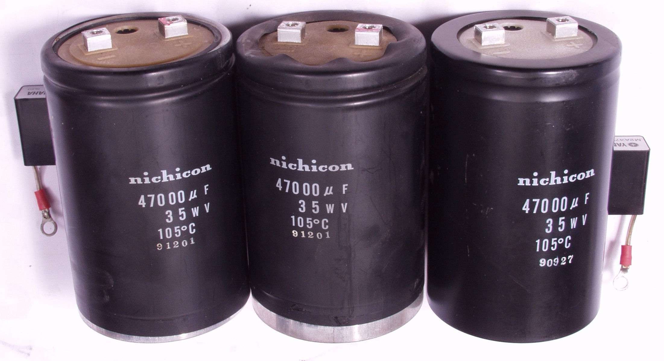 | A7A. 点検中 取り出した電解コンデンサー。 左・中=取り出した物、右=1号機の短絡から免れた物。 | ||||||||||||||||||||||||||||||||||||||