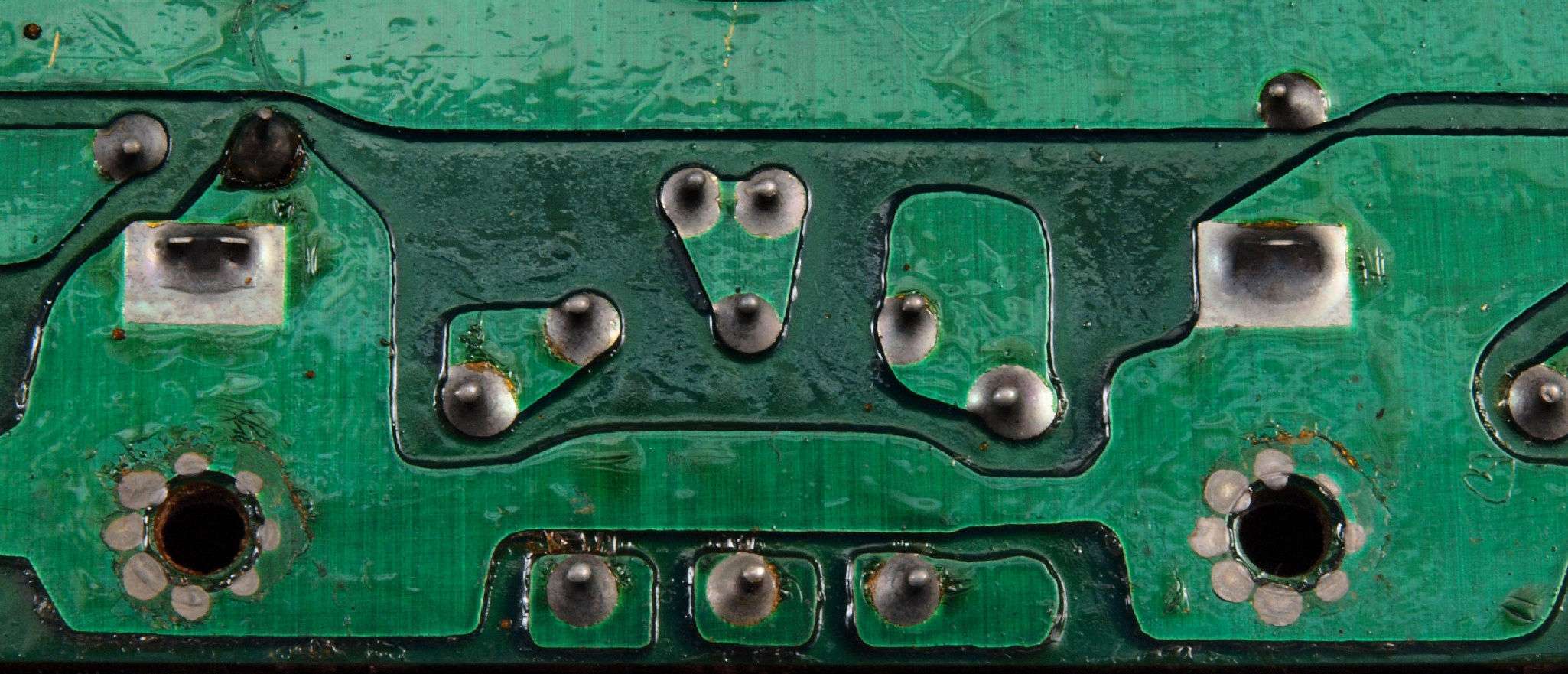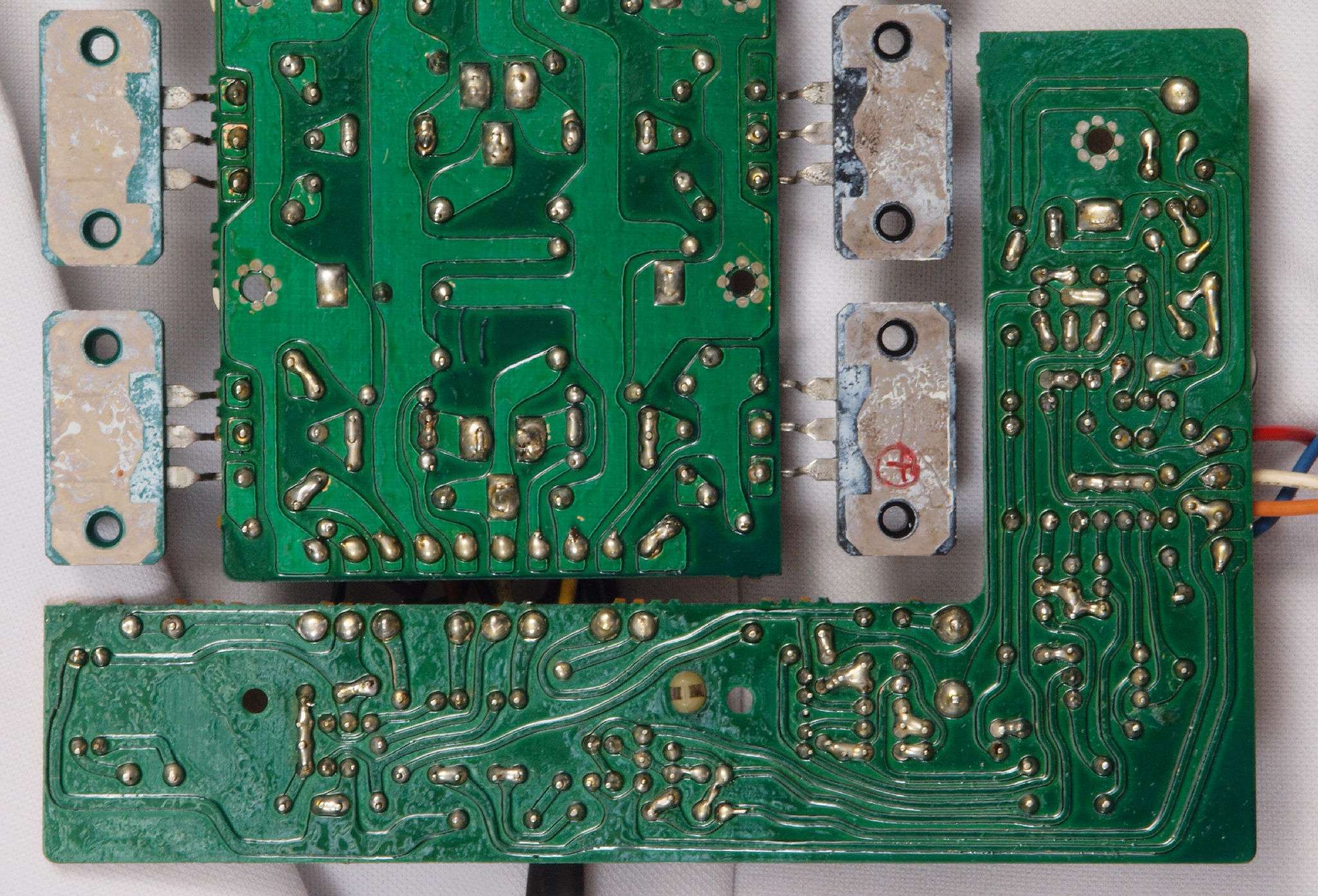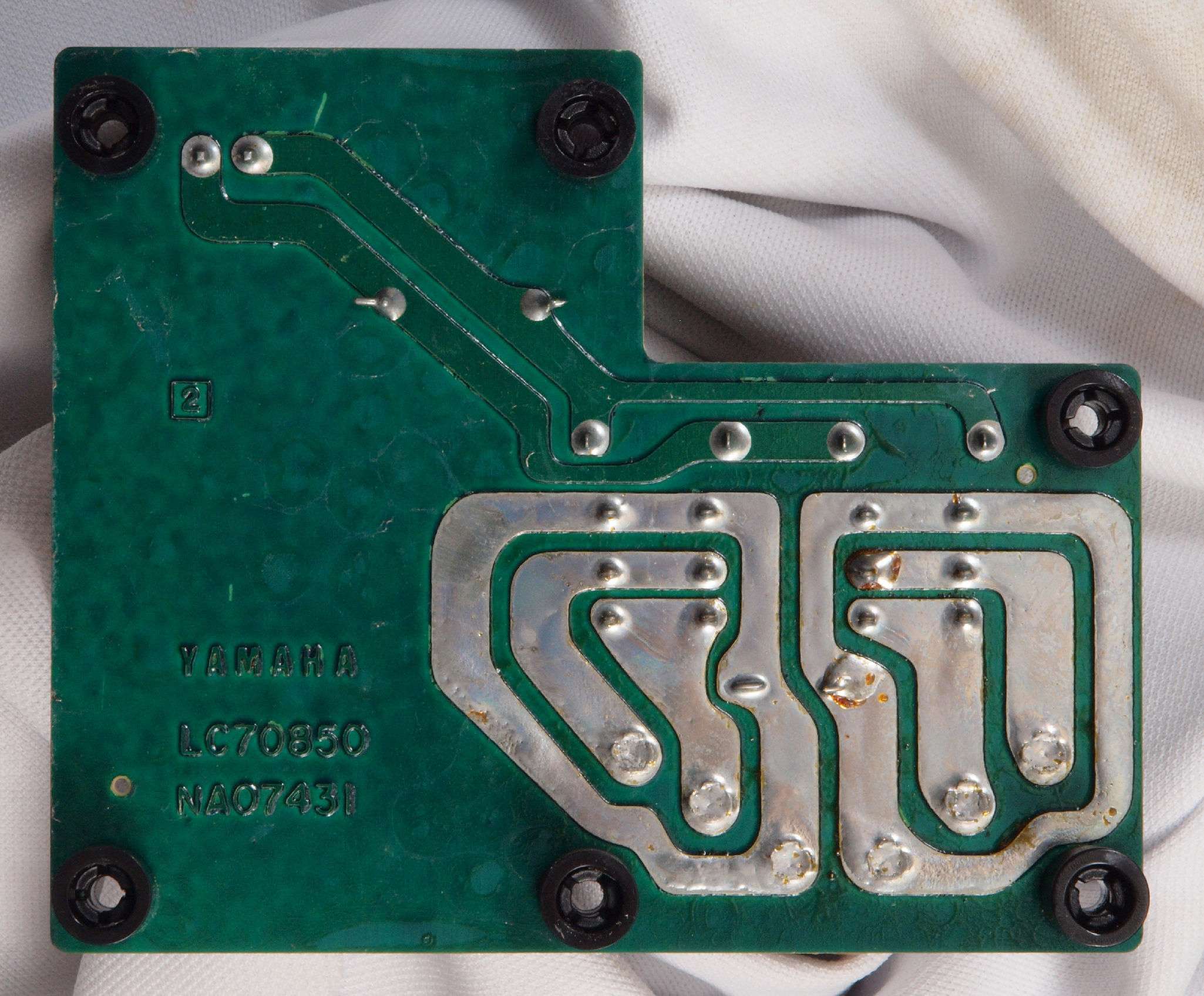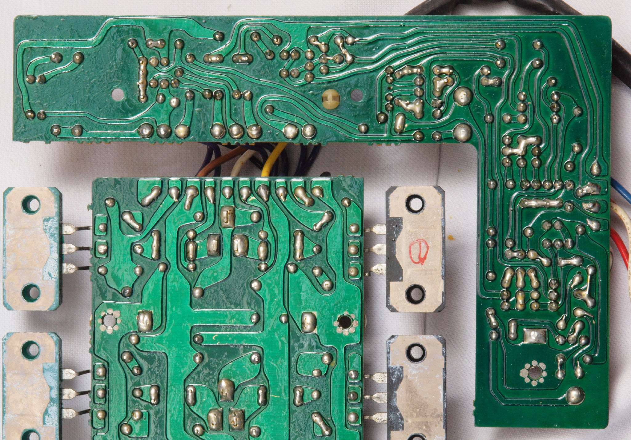 | C732. 修理中 −側バッファー・ドライブ基板裏。 定電圧TR(トランジスター)の足の銅箔を広げる。 | ||||||||||||||||||||||||||||||||||||||