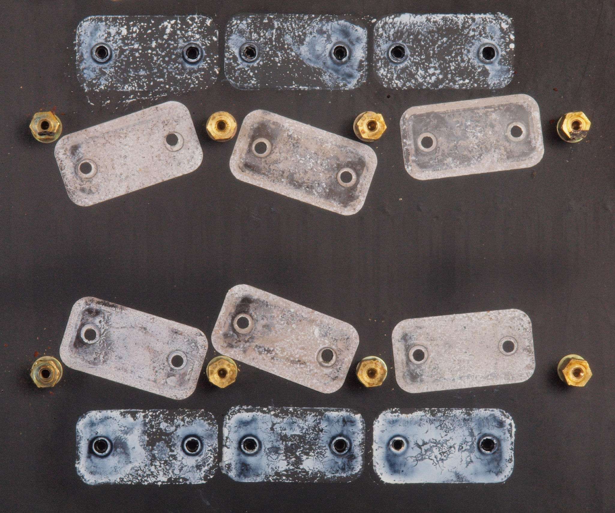 | C213. 修理中 −側終段基板。 終段TR(トランジスター)のマイカー板に放熱シリコンを塗布。 1部終段TR(トランジスター)は未塗布。 |