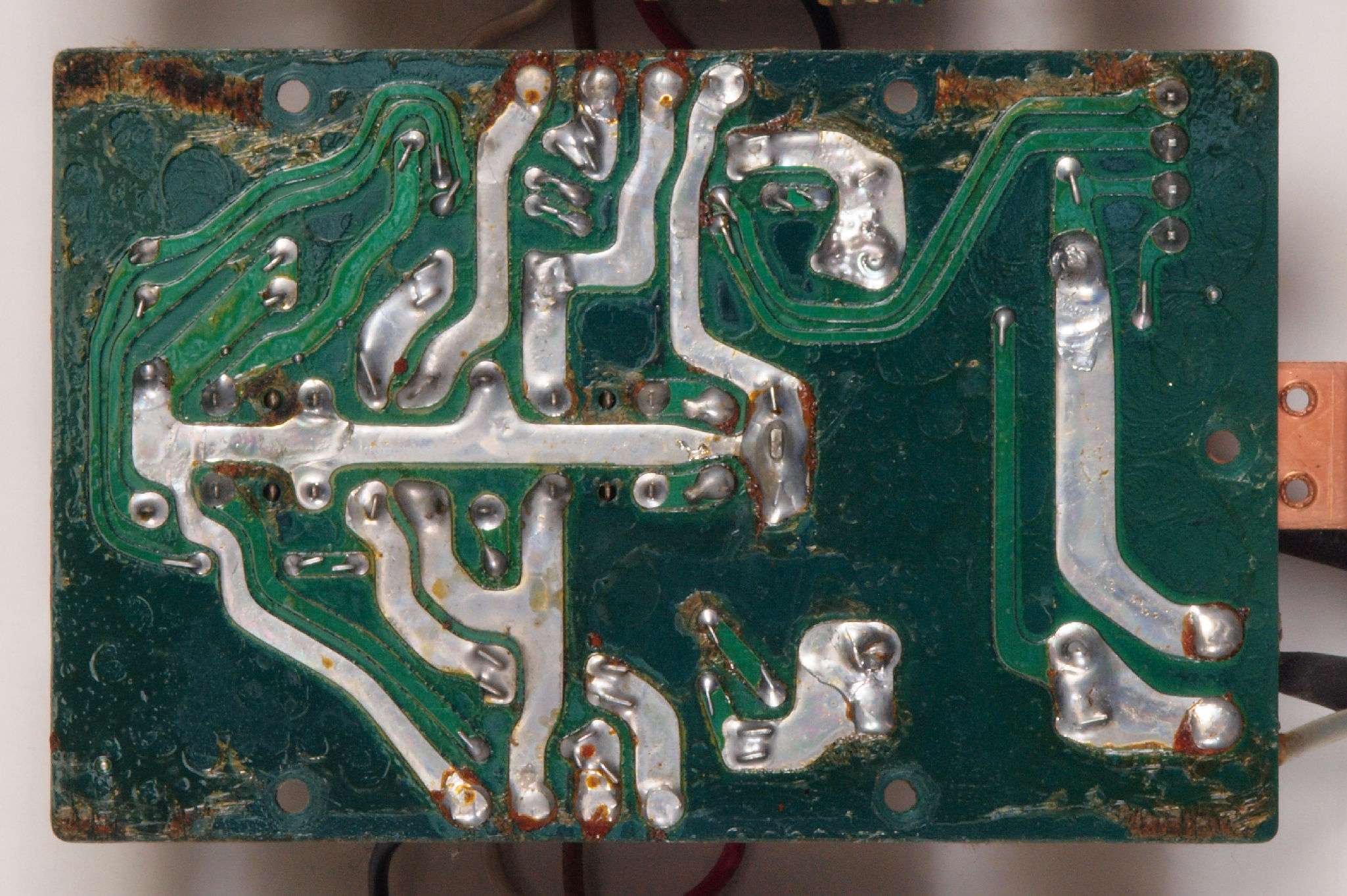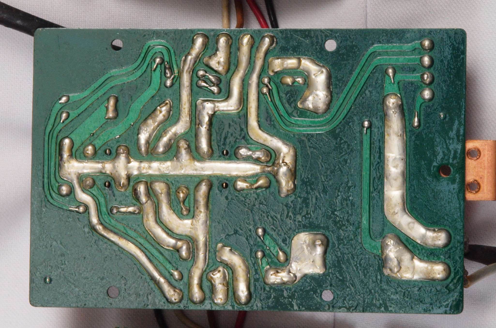 | C632. 修理中 +側バッファー・ドライブ基板裏。 定電圧TR(トランジスター)の足の銅箔を広げる。 | ||||||||||||||||||||||||||||||||||||||