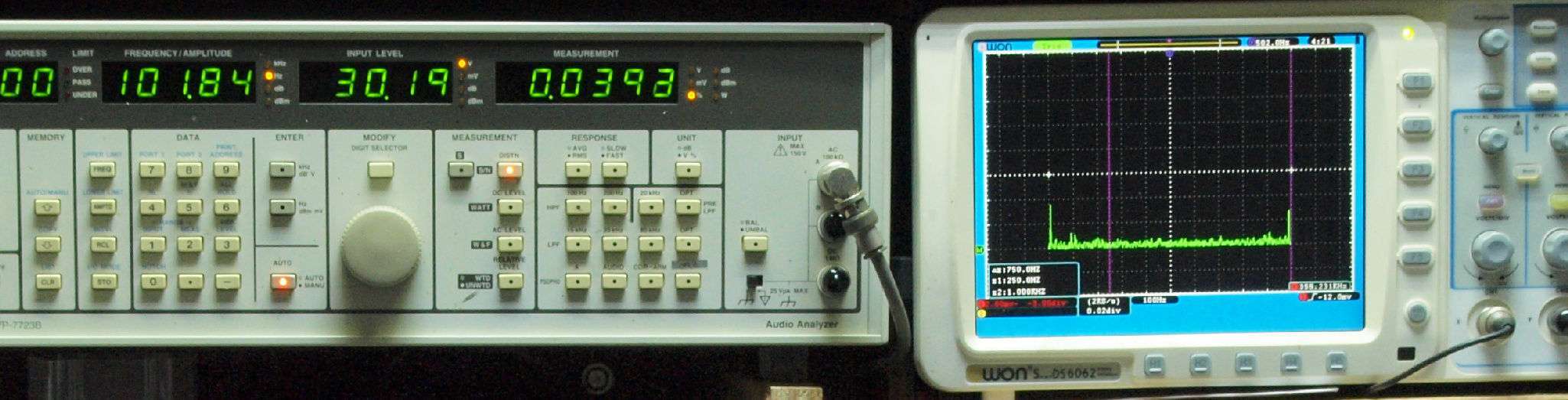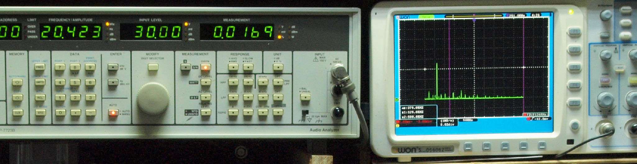 | E. 測定・調整。 画像をクリックすると、大きく(横幅2050ドット)表示されます。 E0. 出力・歪み率測定・調整 「見方」。 中=SP出力を「Audio Analyzer Panasonic VP−7723B」により測定。 表示LED、 左端=メモリーNo、 中左=周波数測定、 中右=出力電圧測定、 右端=歪み率測定。 右端=VP−7723Bの基本波除去出力を「owon SDS8202(200MHZ)」で「FFT分析」表示。 左端=オーディオ発振器 VP−7201A より50Hz〜100kHzの信号を出し(歪み率=約0.003%)、ATT+分配器を通し、AMPに入力。 よって、ダイアル設定出力レベルより低くなります。測定機器の仕様や整備の様子はこちら、「VP−7723B」「VP−7201A」。 FFT画面の見方はこちら。 |