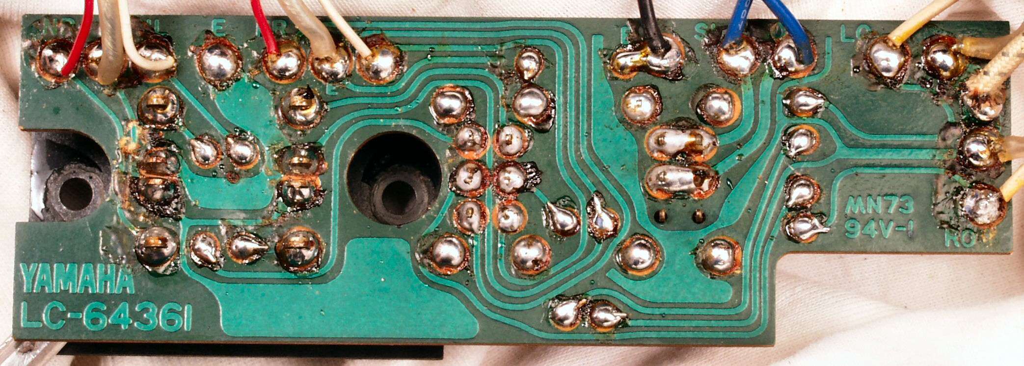 CAF. 修理(半田補正)後 電源投入SW基板裏。 全ての半田をやり修す。