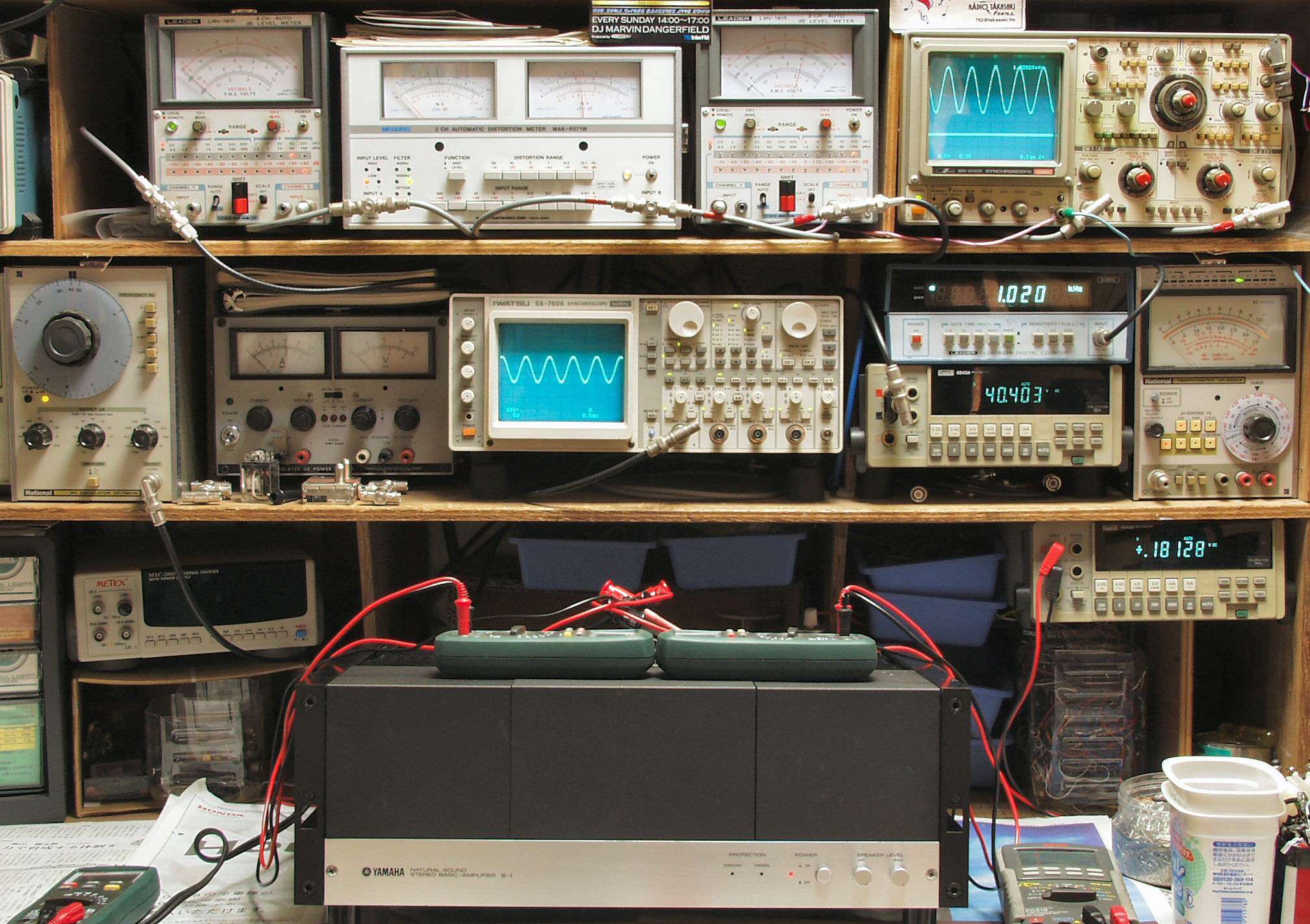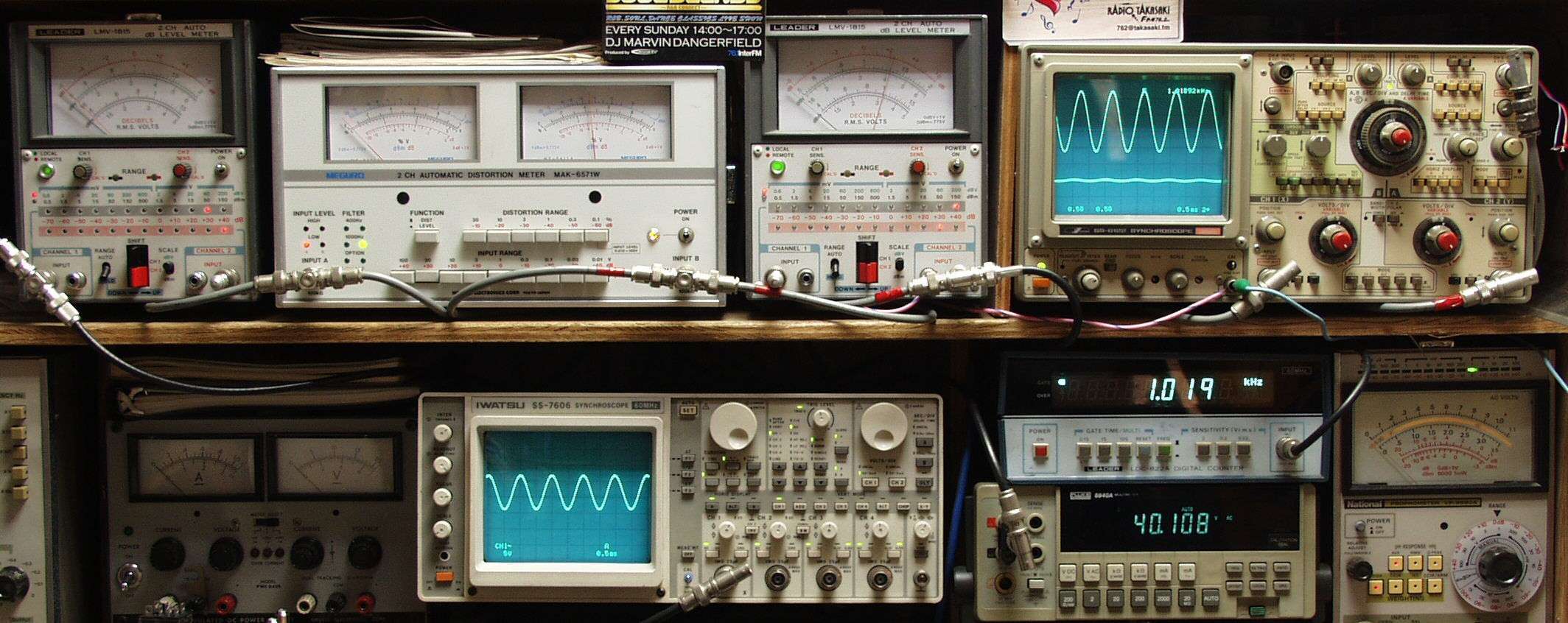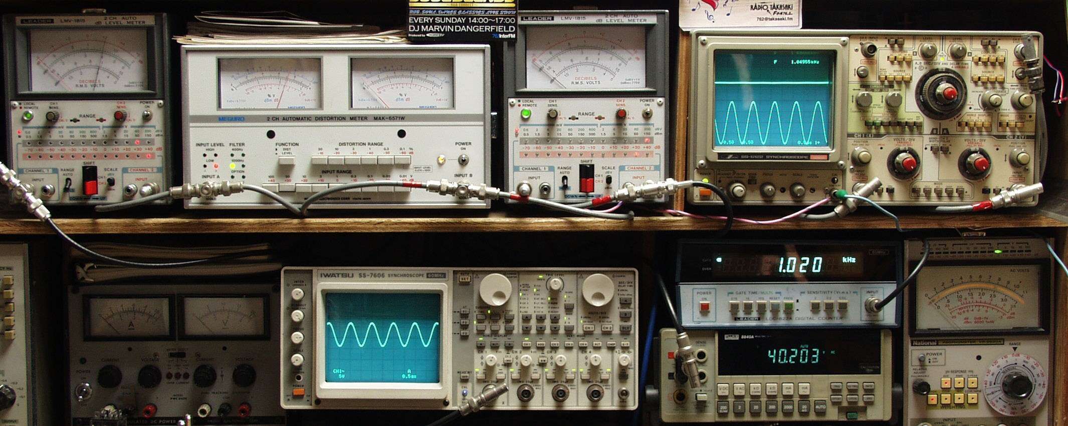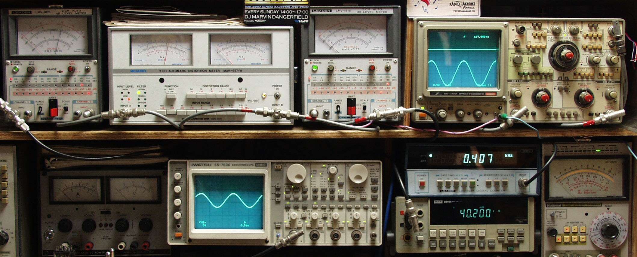 下左オーディオ発振器より400HZ・1KHZの信号を出し(歪み率=約0.003%)これをAMPに入力し、SPからの出力を測定   下中オシロ=入力波形(オーディオ発振器のTTLレベル)