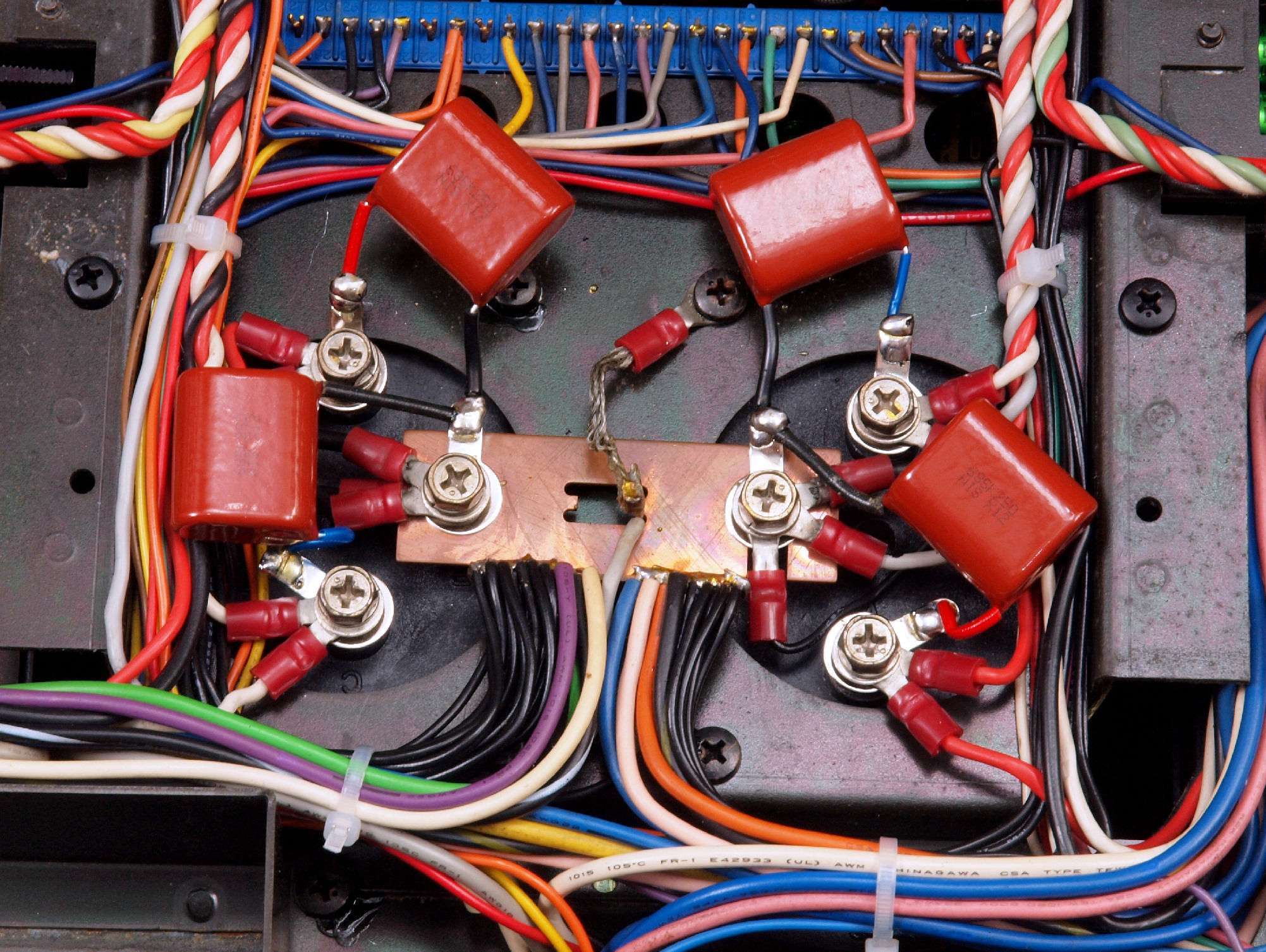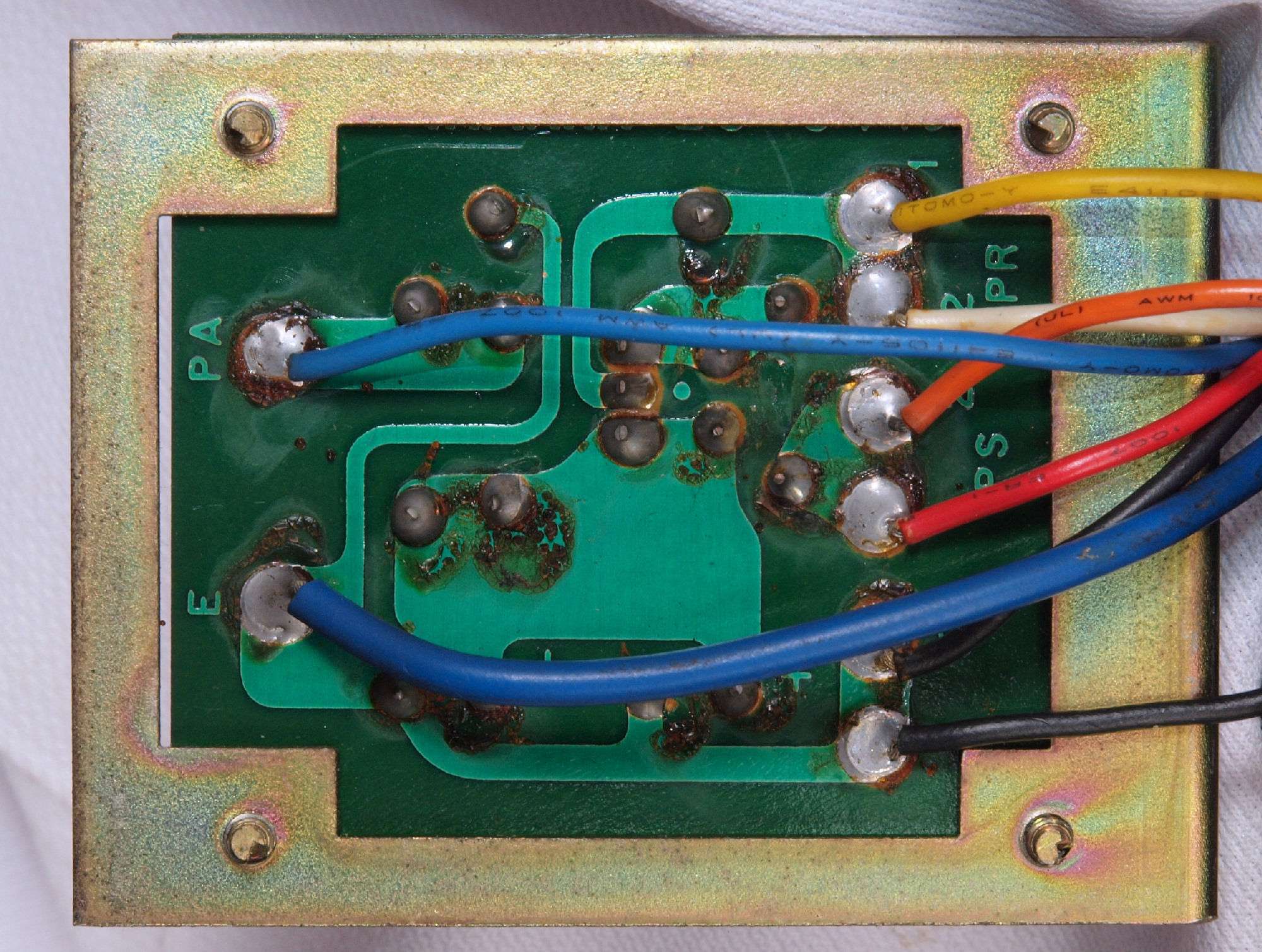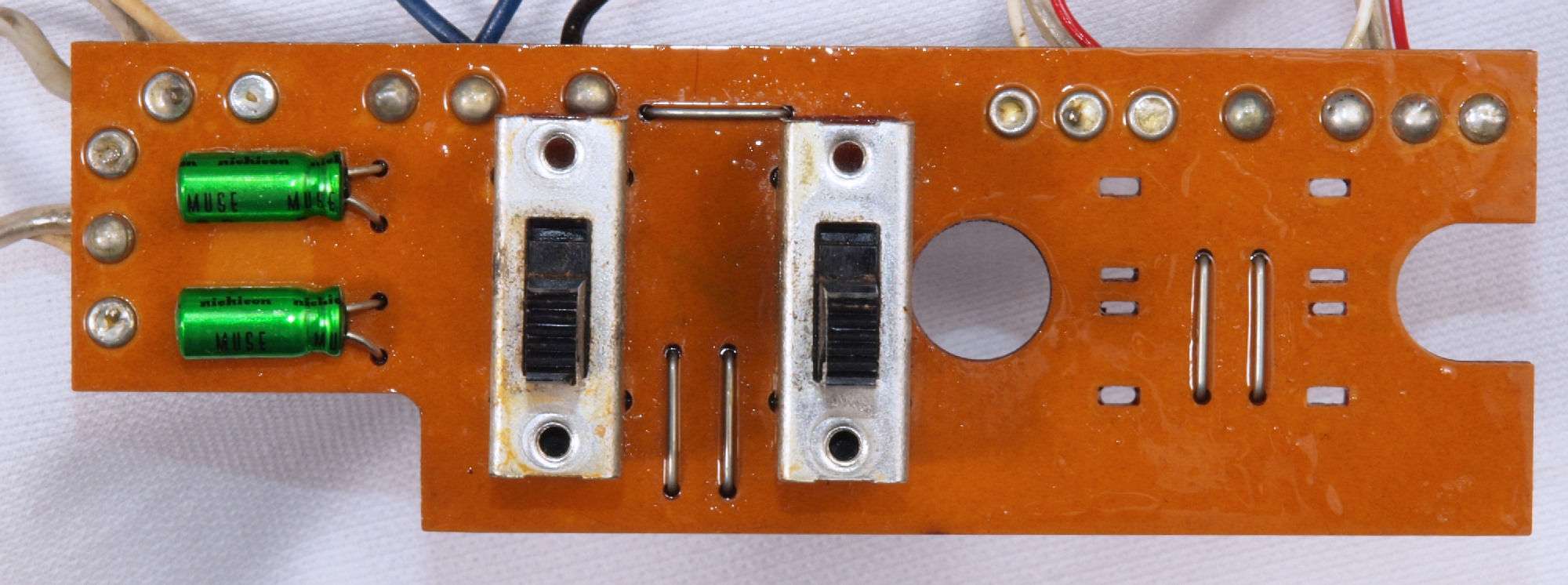 CB4. 修理(半田補正)後 RCA端子基板裏、フイルムコンデンサー2個追加。 全ての半田をやり修す。