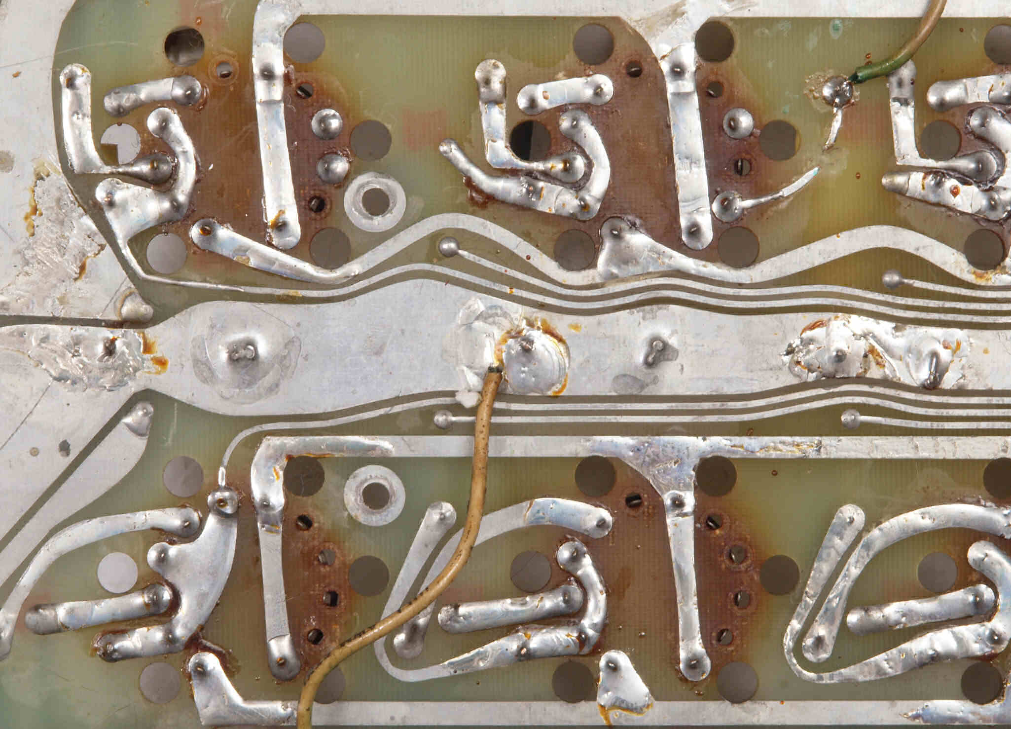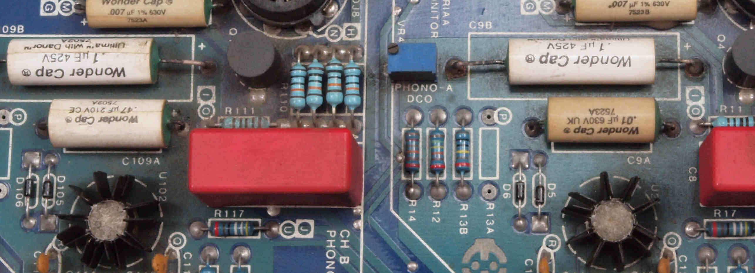 | CounterPoint SA−5000 EQアンプの左右カップリングコンデンサーの容量が異なる。左=0.47μ/210VW、右=0.1μ/630WV。 |