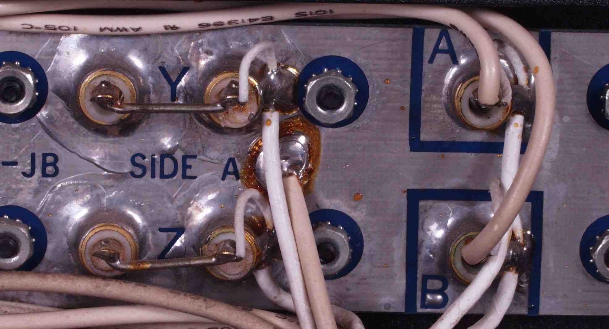 C45. 修理後 入力RCA端子基板裏 白くなっているのは、瞬間接着剤を使用した為(梅雨時は湿度が高いので)