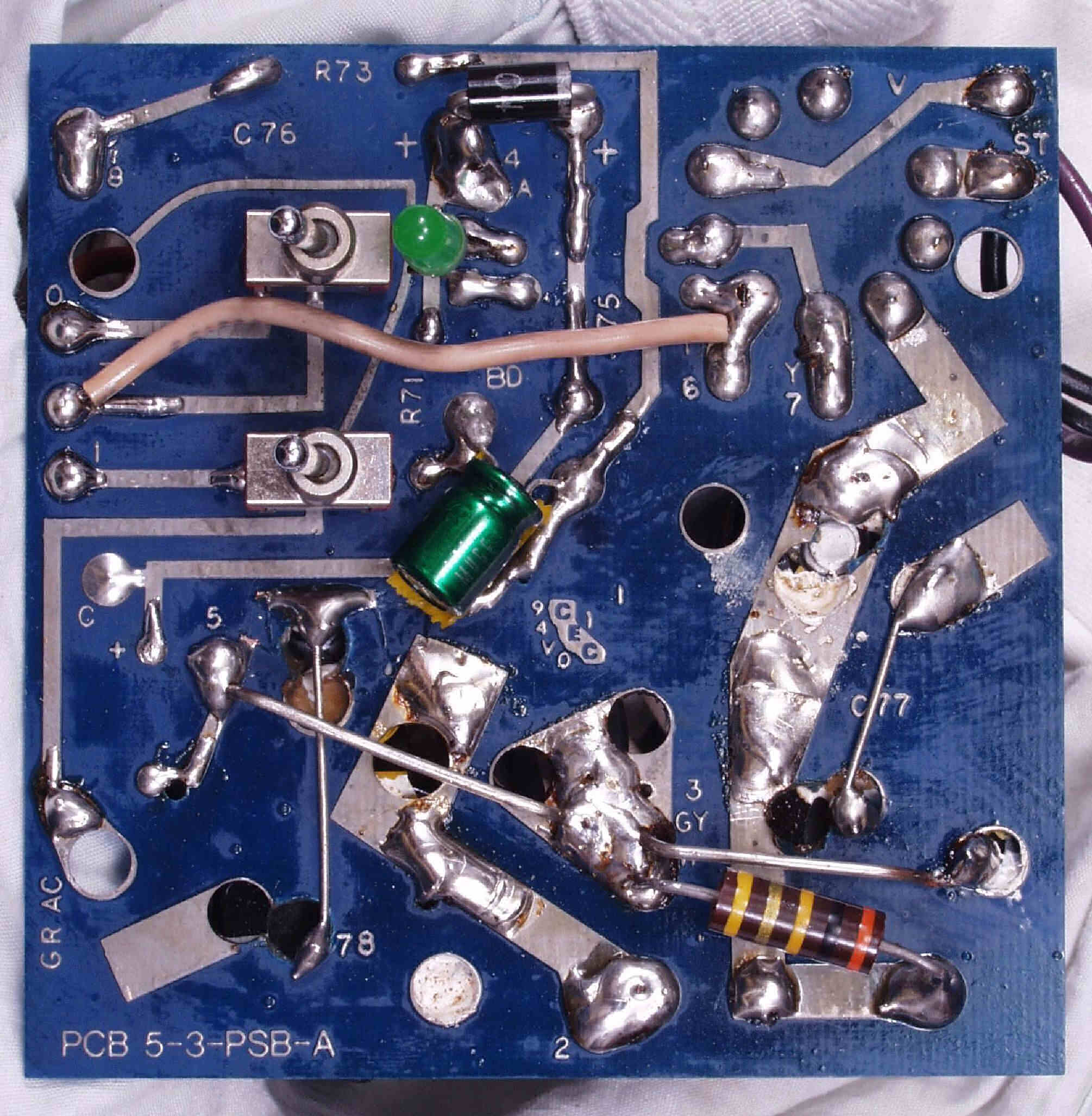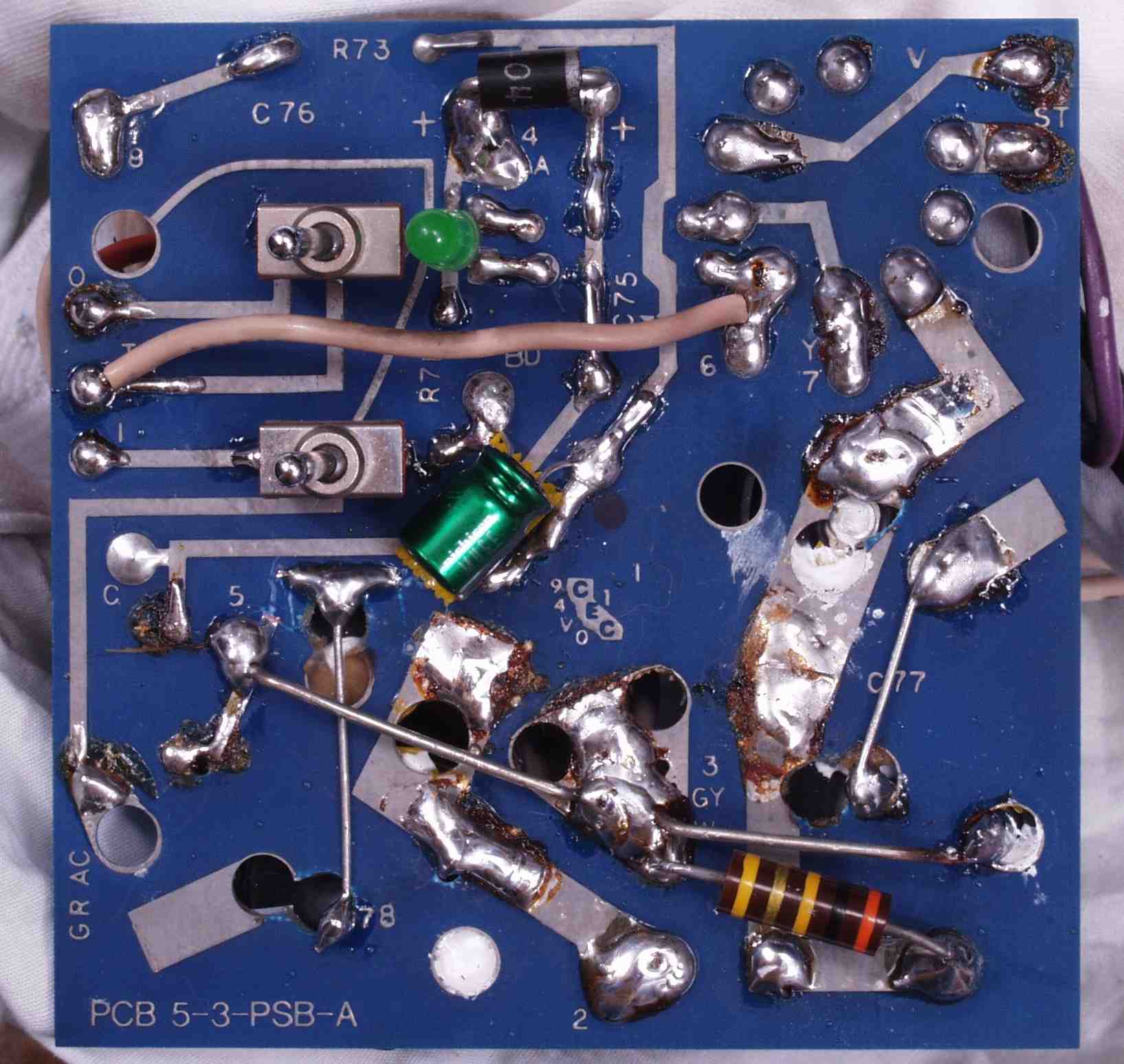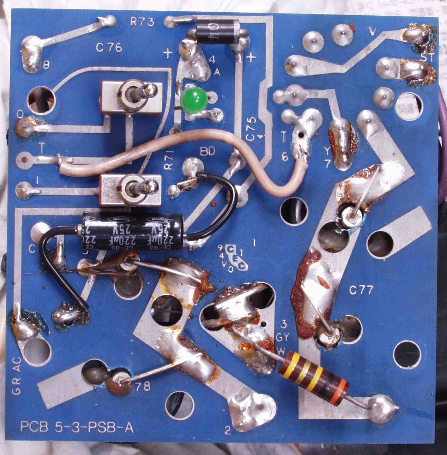 C71. 修理前 整流基板 電解コンデンサーの引き出し線が電飾(?)で切れそう