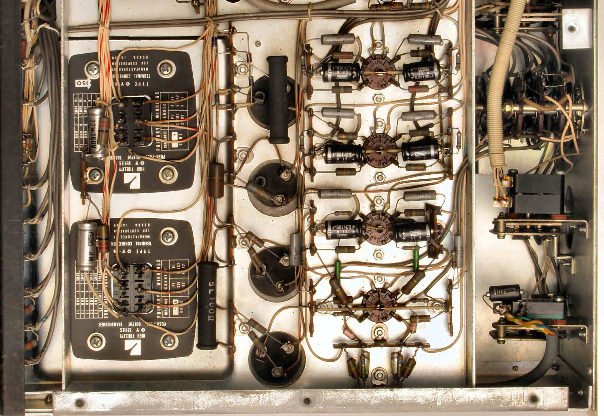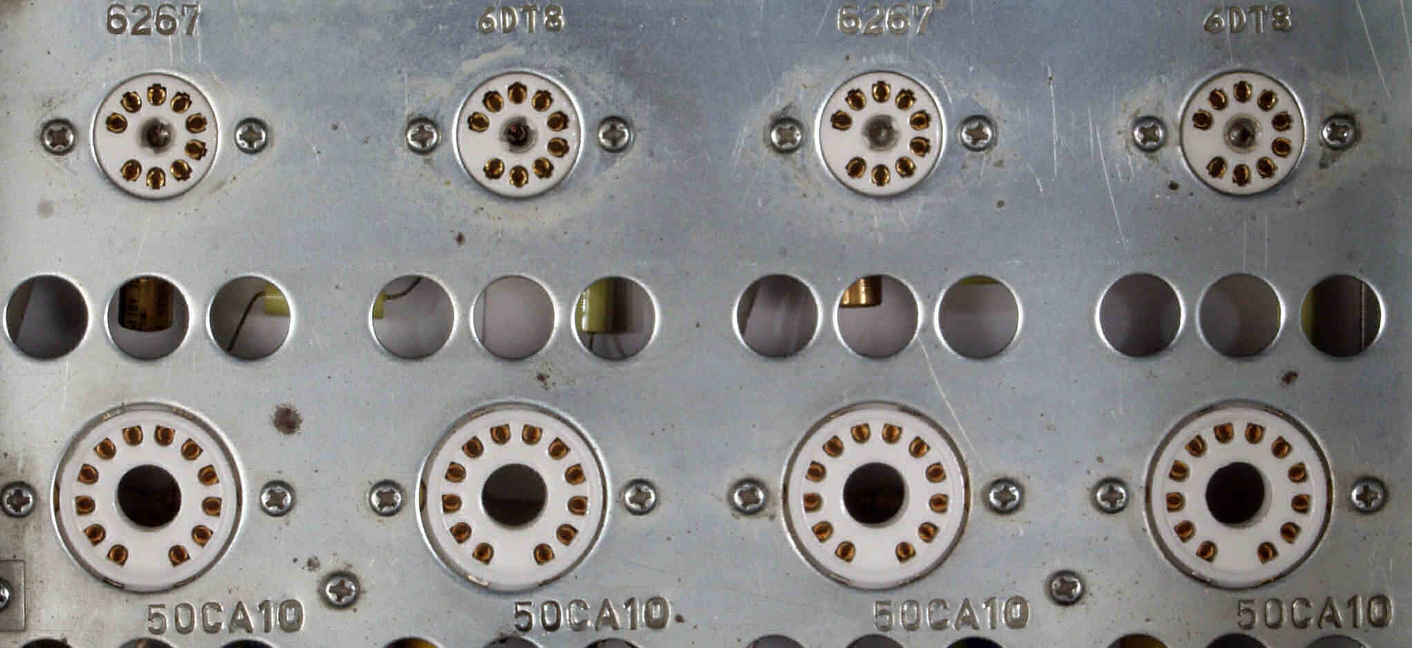 C5A. 修理前、出力真空管50CA10、前段真空管6DT8・6267のソケット。