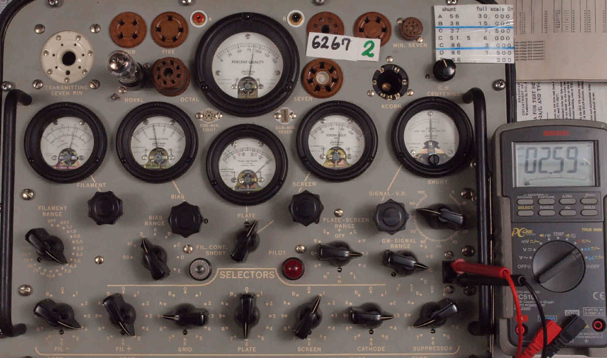 | U21. 付属1本目「6267」。 Gm測定=1600μmho、IP=3.25mA。 測定条件、「Ep=250V、Esg=150V、Eg1=−2V」。 RangeSW=C、FullScale=3000μmho |