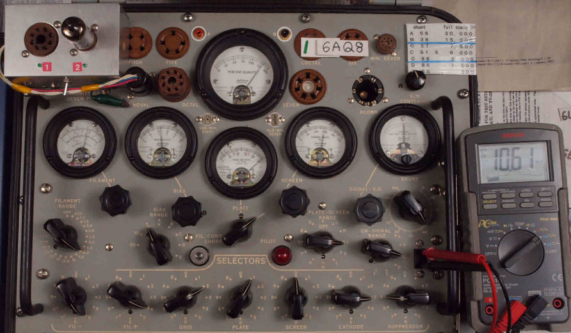 | U311. 付属1本目「6AQ8」ユニット1。 Gm測定=6500μmho、IP=10.61mA。 測定条件、「Ep=250V、Eg1=−2.3V」。 RangeSW=C、FullScale=7500μmho |