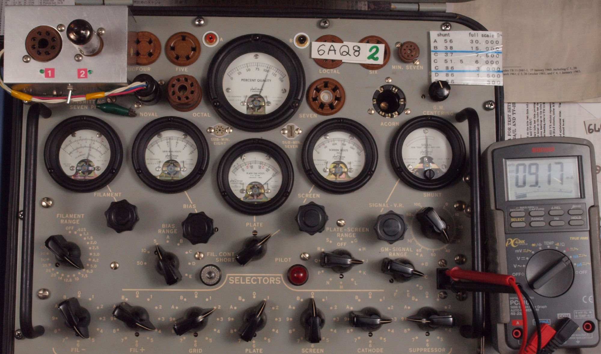 | U321. 付属2本目「6AQ8」ユニット1。 Gm測定=5050μmho、IP=9.17mA。 測定条件、「Ep=250V、Eg1=−2.3V」。 RangeSW=C、FullScale=7500μmho |