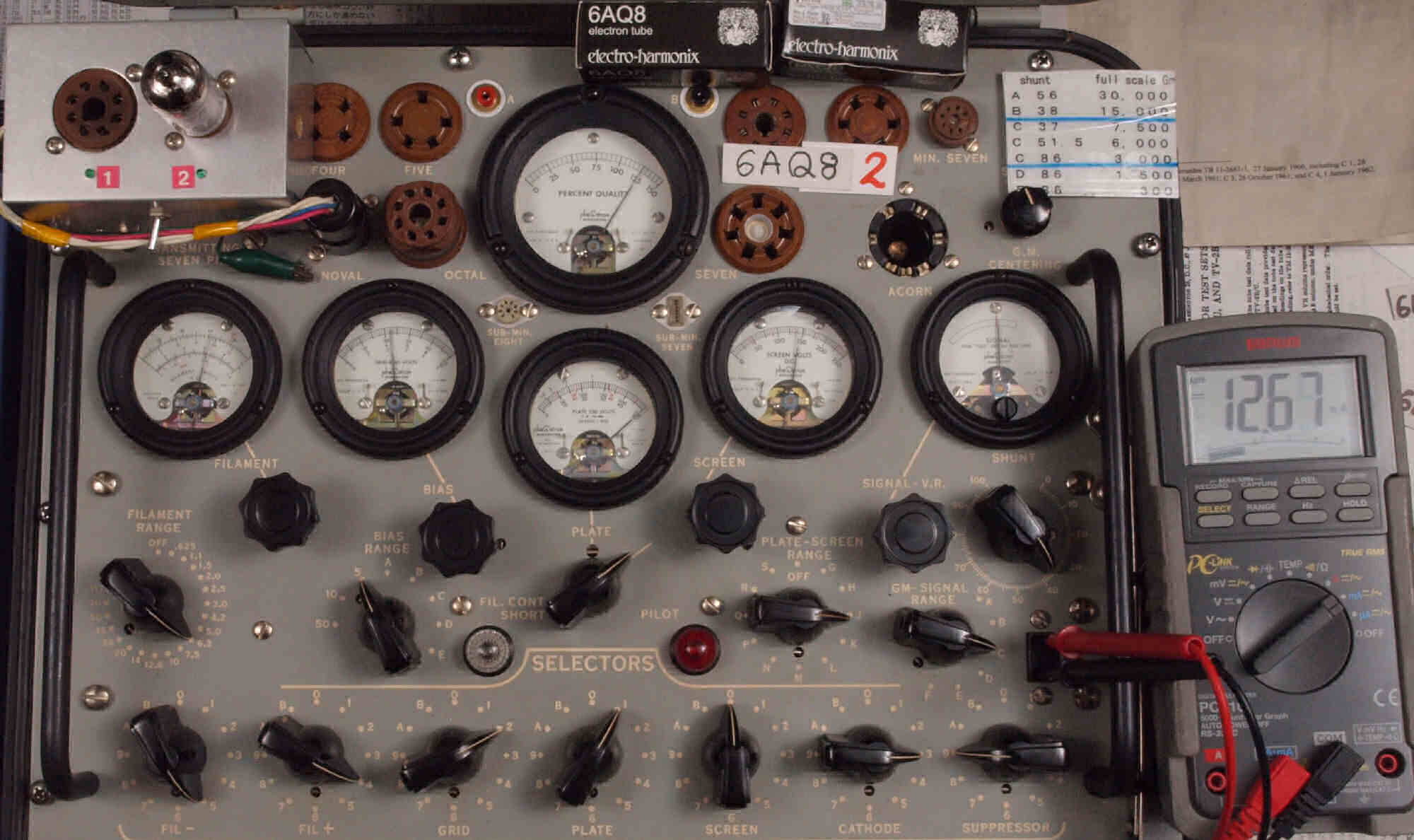 | V312. 購入1本目「6AQ8」ユニット2。 Gm測定=7500μmho、IP=12.59mA。 |