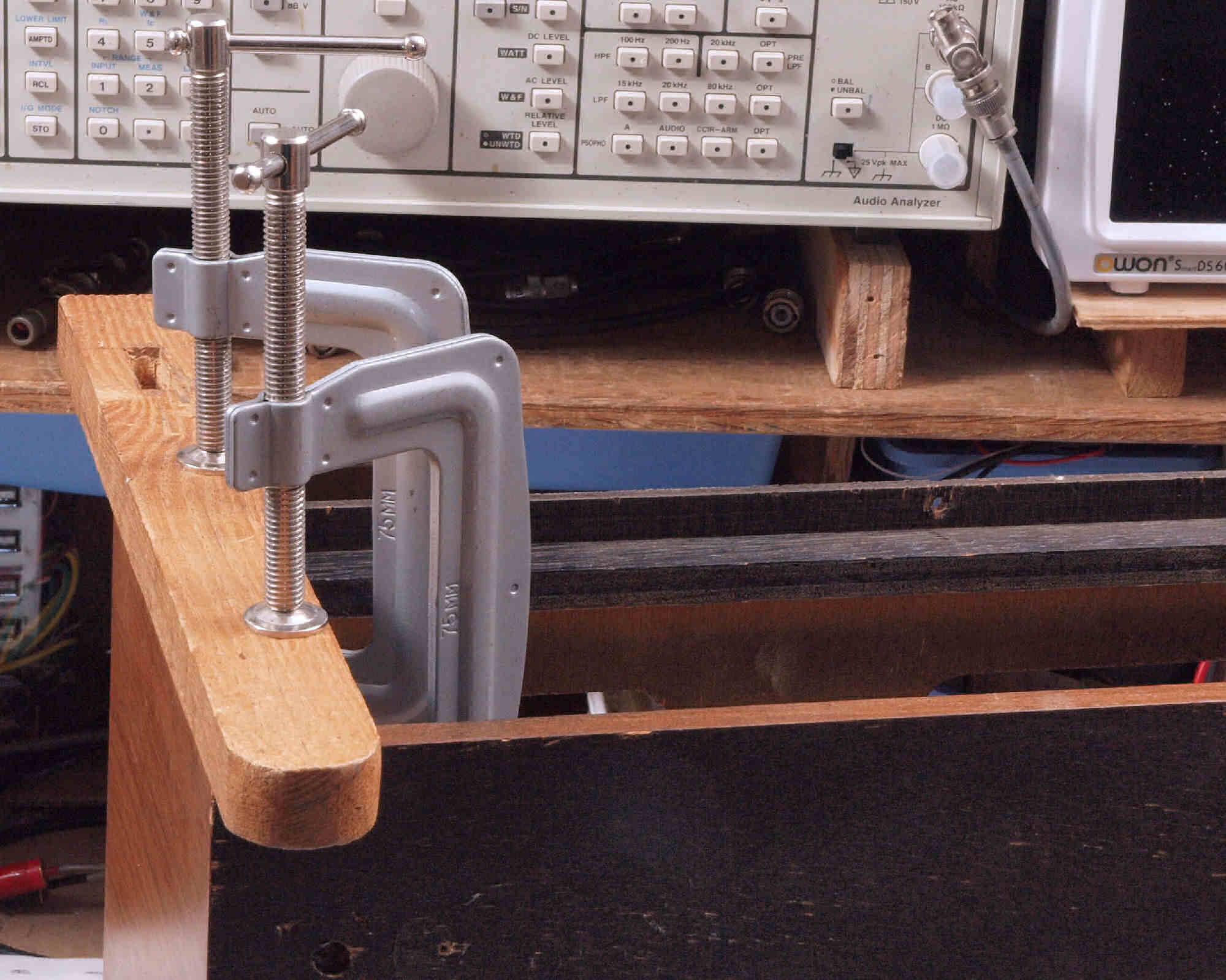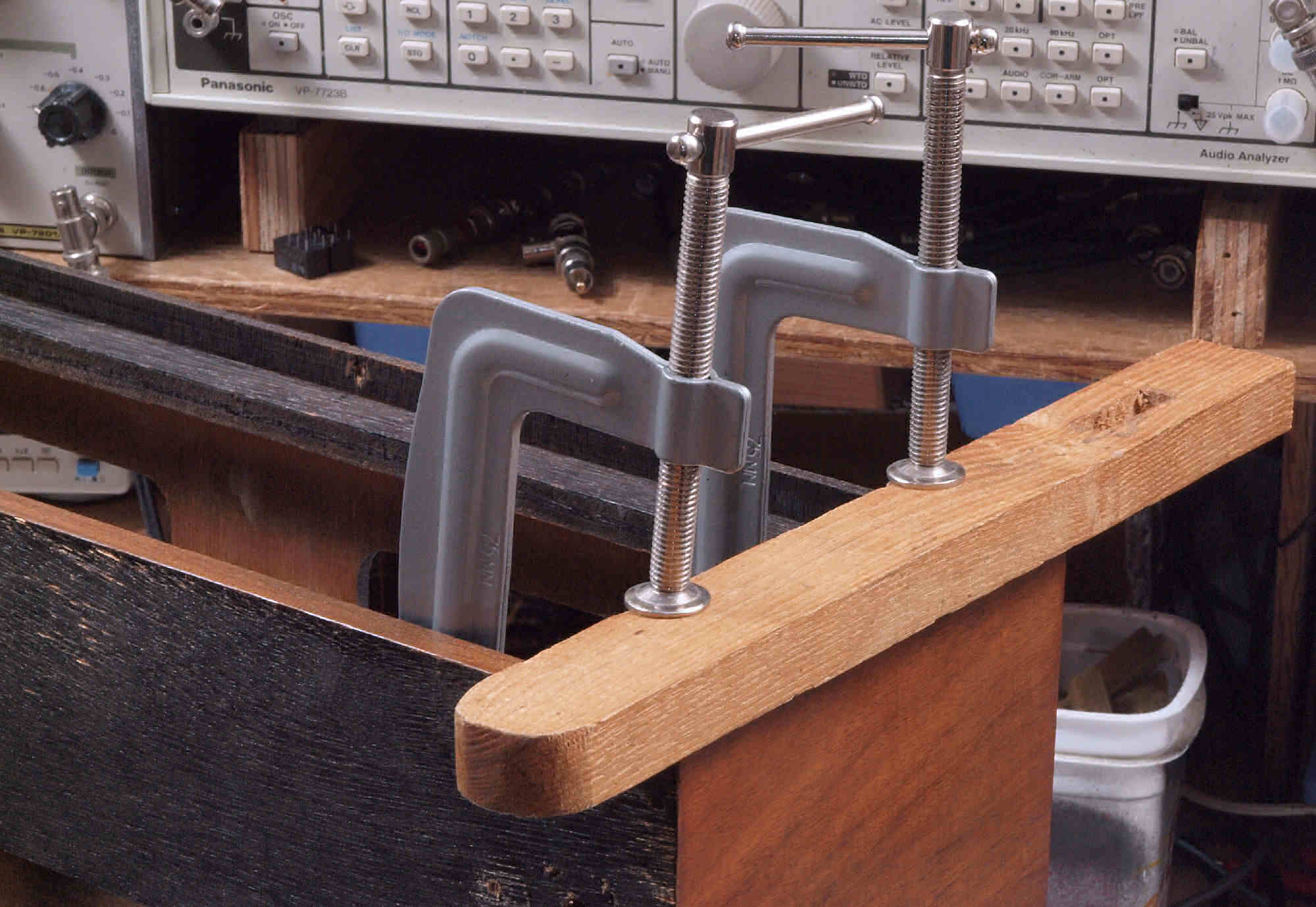 | K04. 修理中 シャコ万力で押さえ、接着する。 |