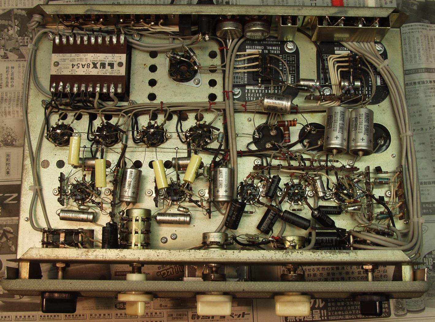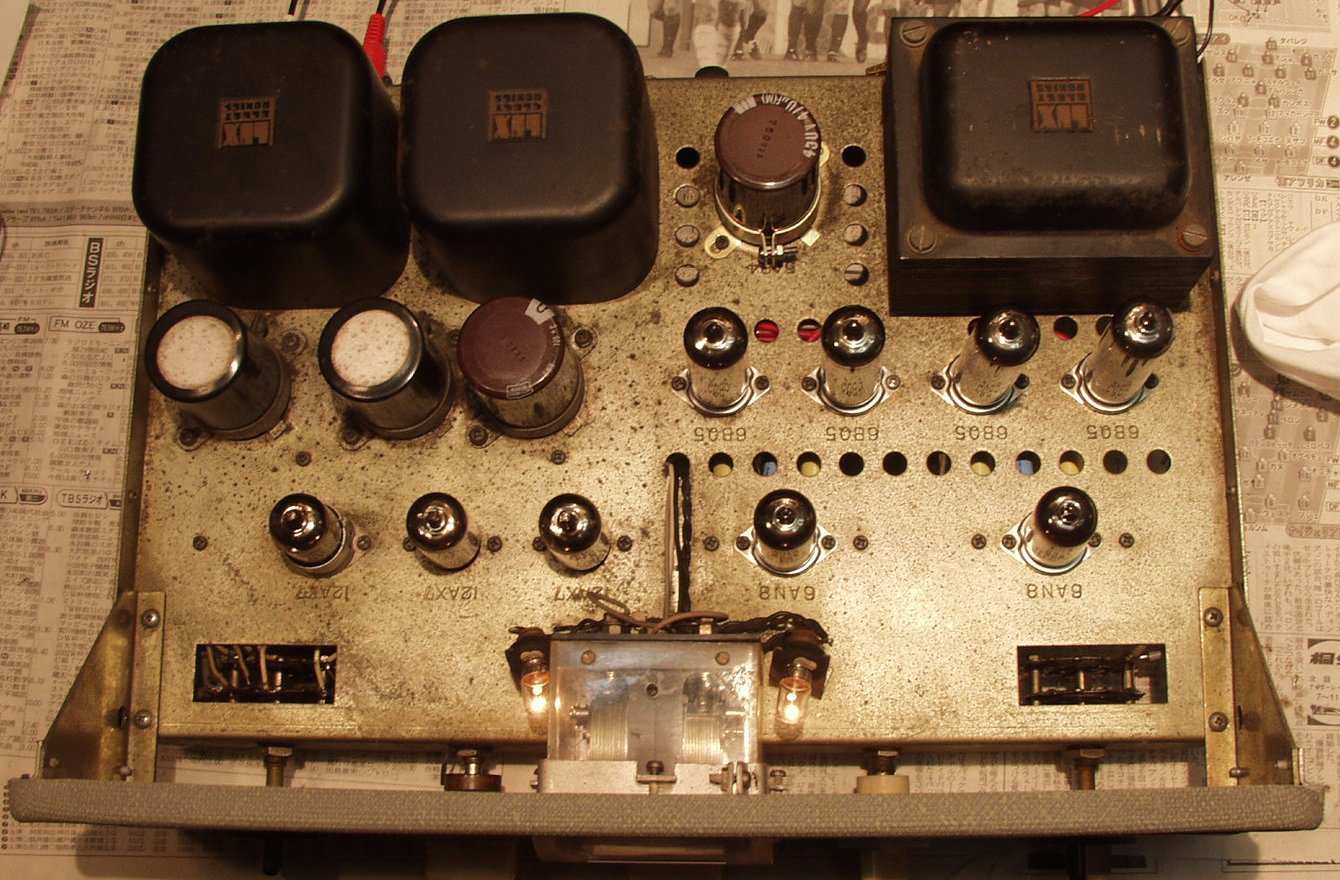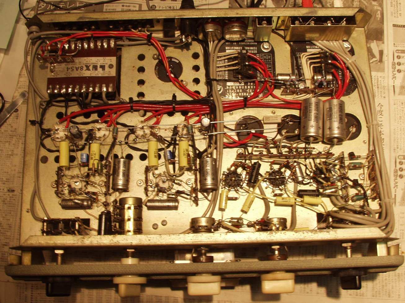 | A−3. 修理前 液漏れのコンデンサー、真空管6BQ5のソケットはガタガタ |