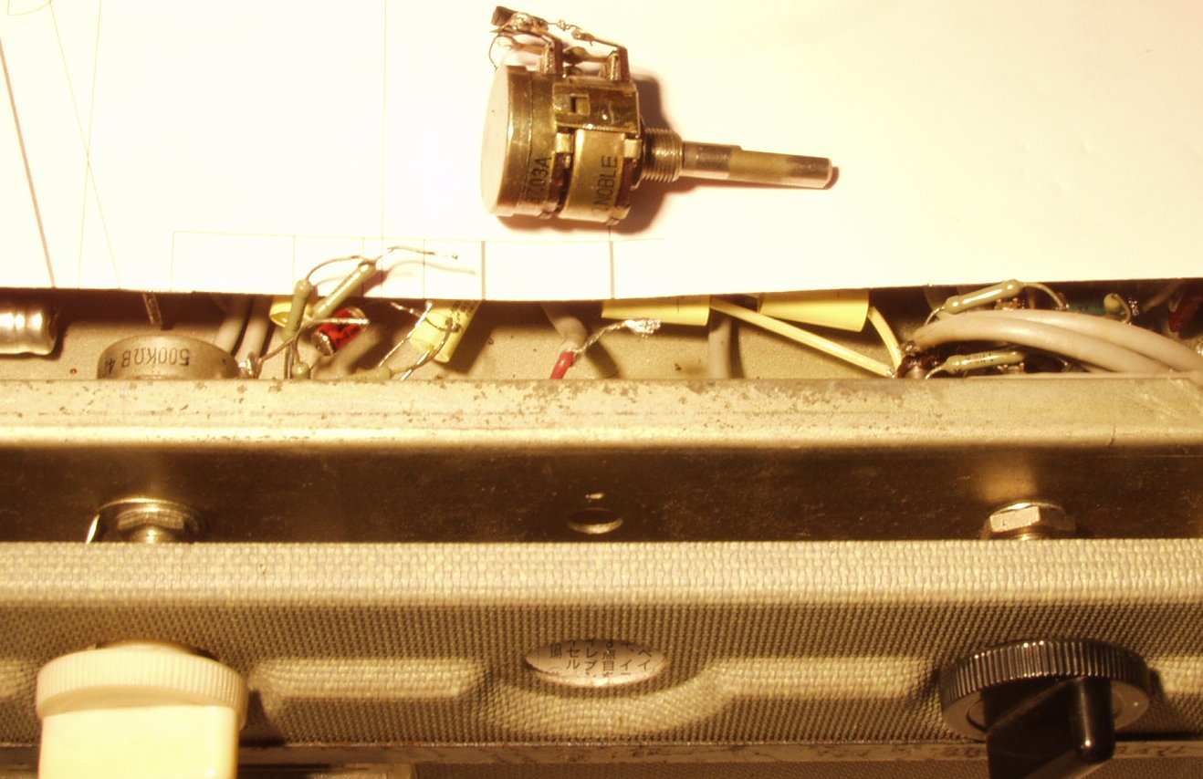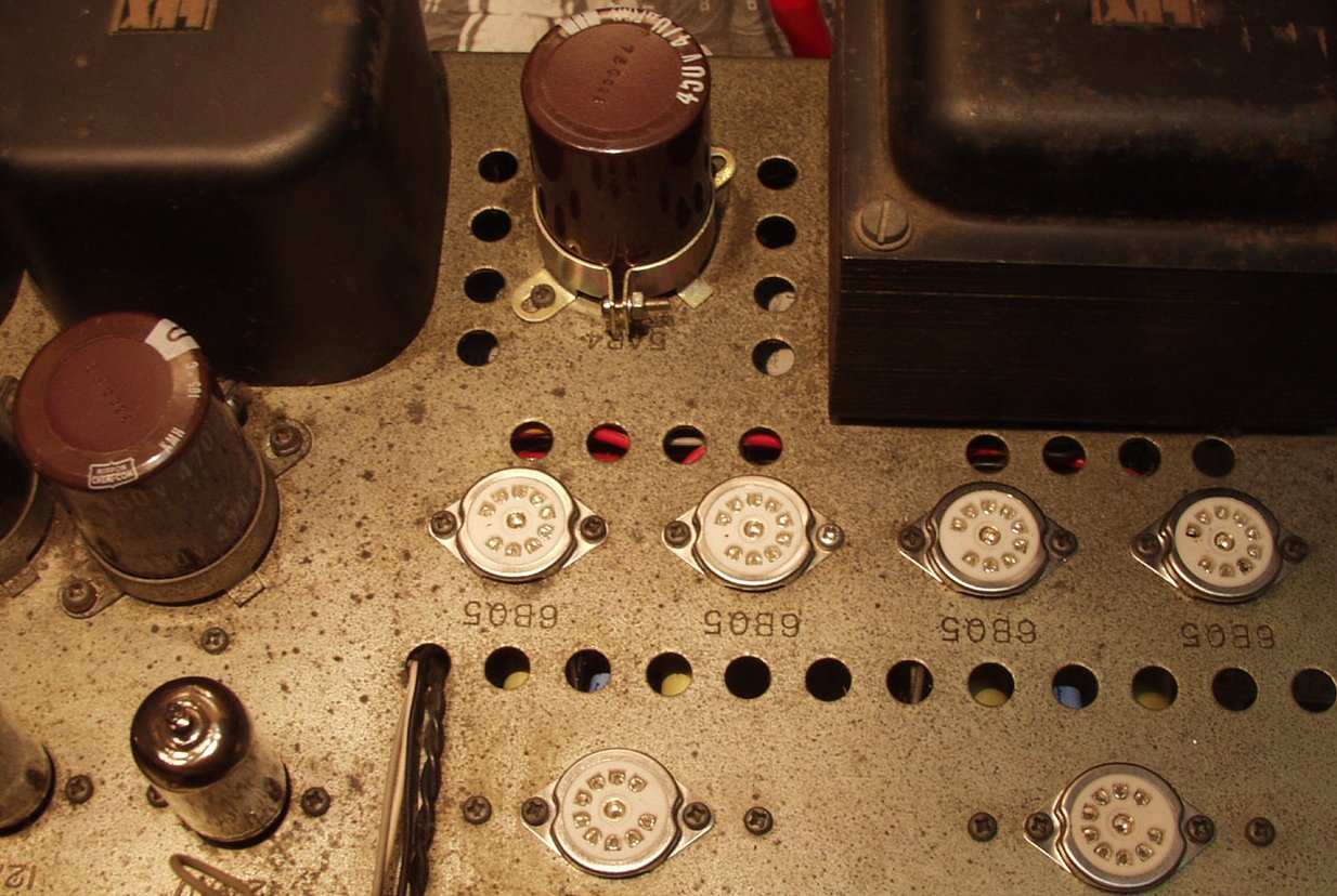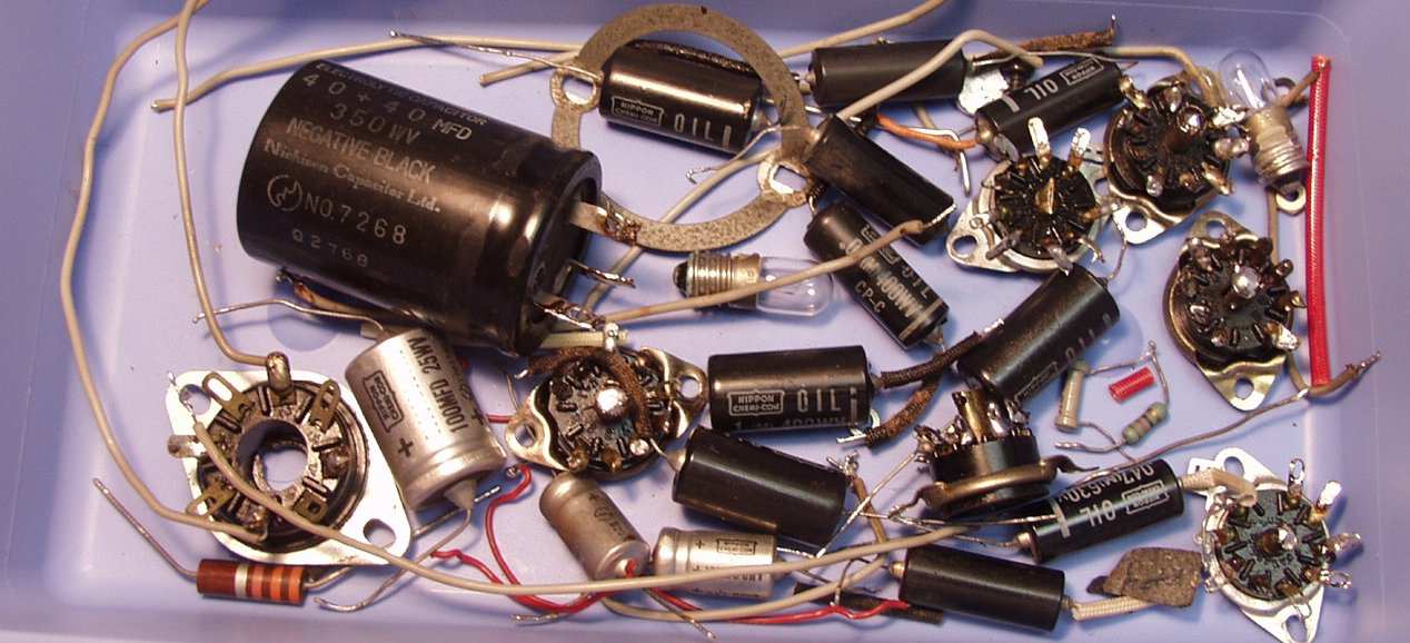 | A−3. 修理前 液漏れのコンデンサー、真空管6BQ5のソケットはガタガタ |