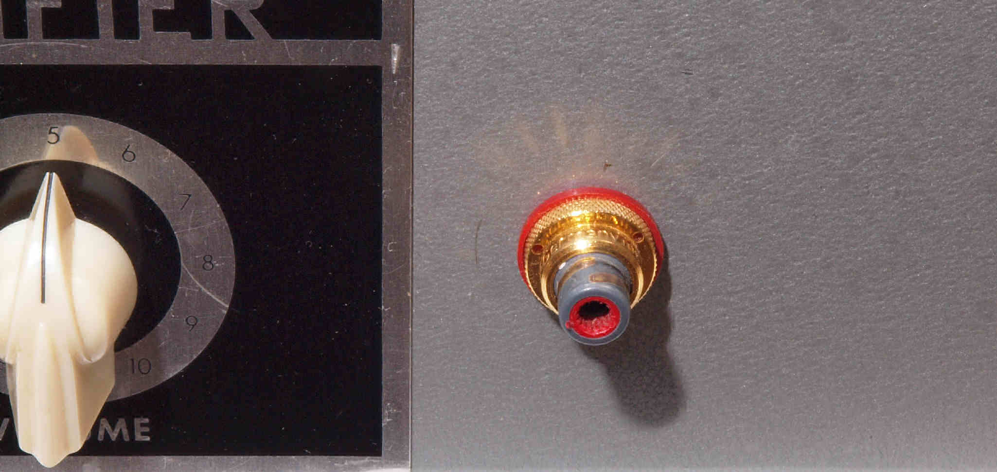 | A12. 点検中 前から見る。 高級なWBTのRCA端子に交換されているが、固定方法が悪くRCAコネクターを回転させると本体が回ってしまう。 | ||||||||||||||||||||||
