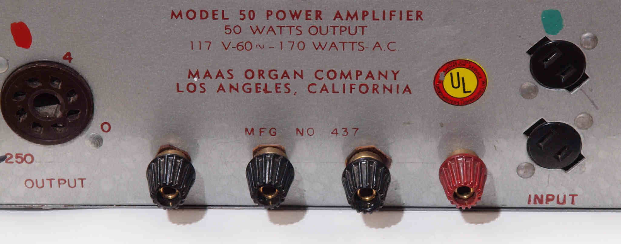 P. 電源トランス点検 T. バラック修理後点検測定 F. 見積・点検、バラック修理費 25,000円。 特別にHP製作。 S. Maas Organ Model 50 の仕様(カタログ・マニアルより) |