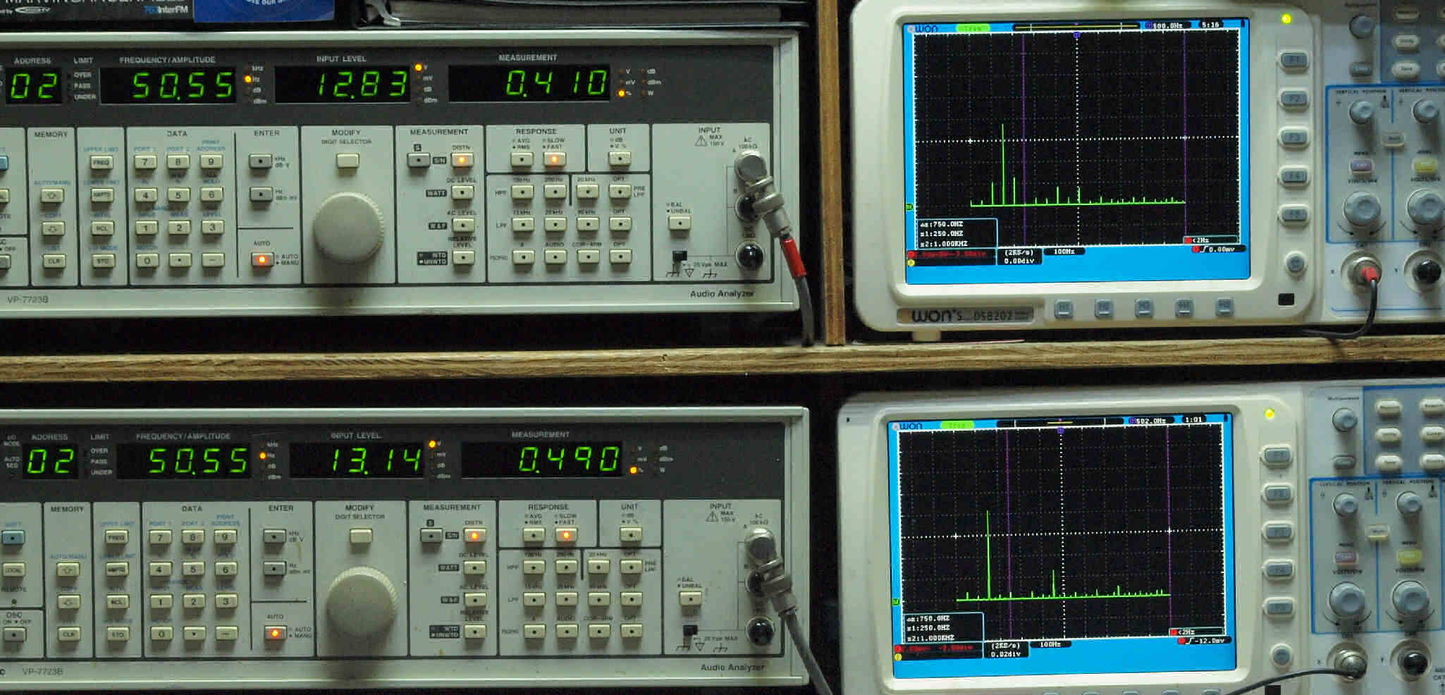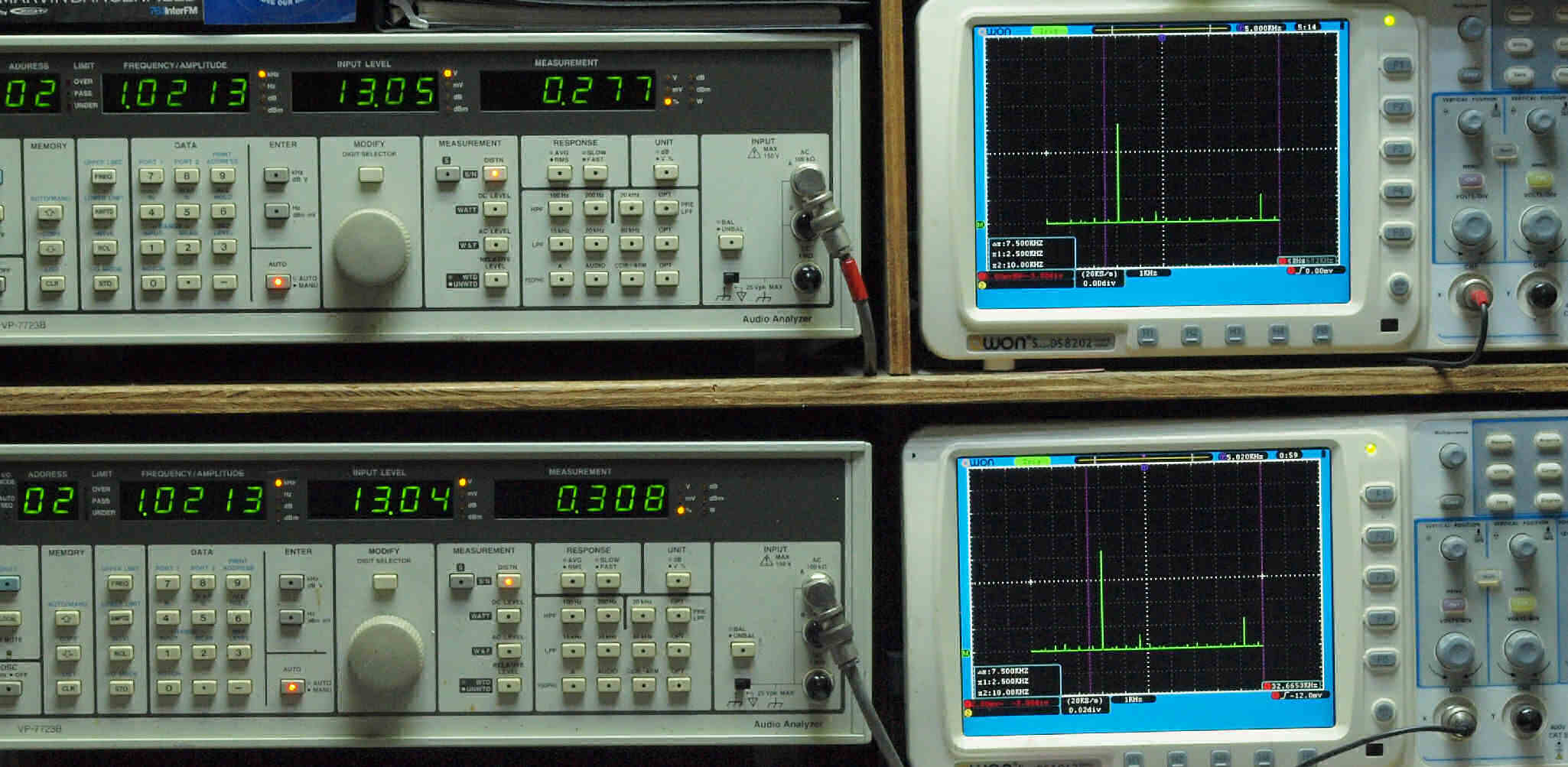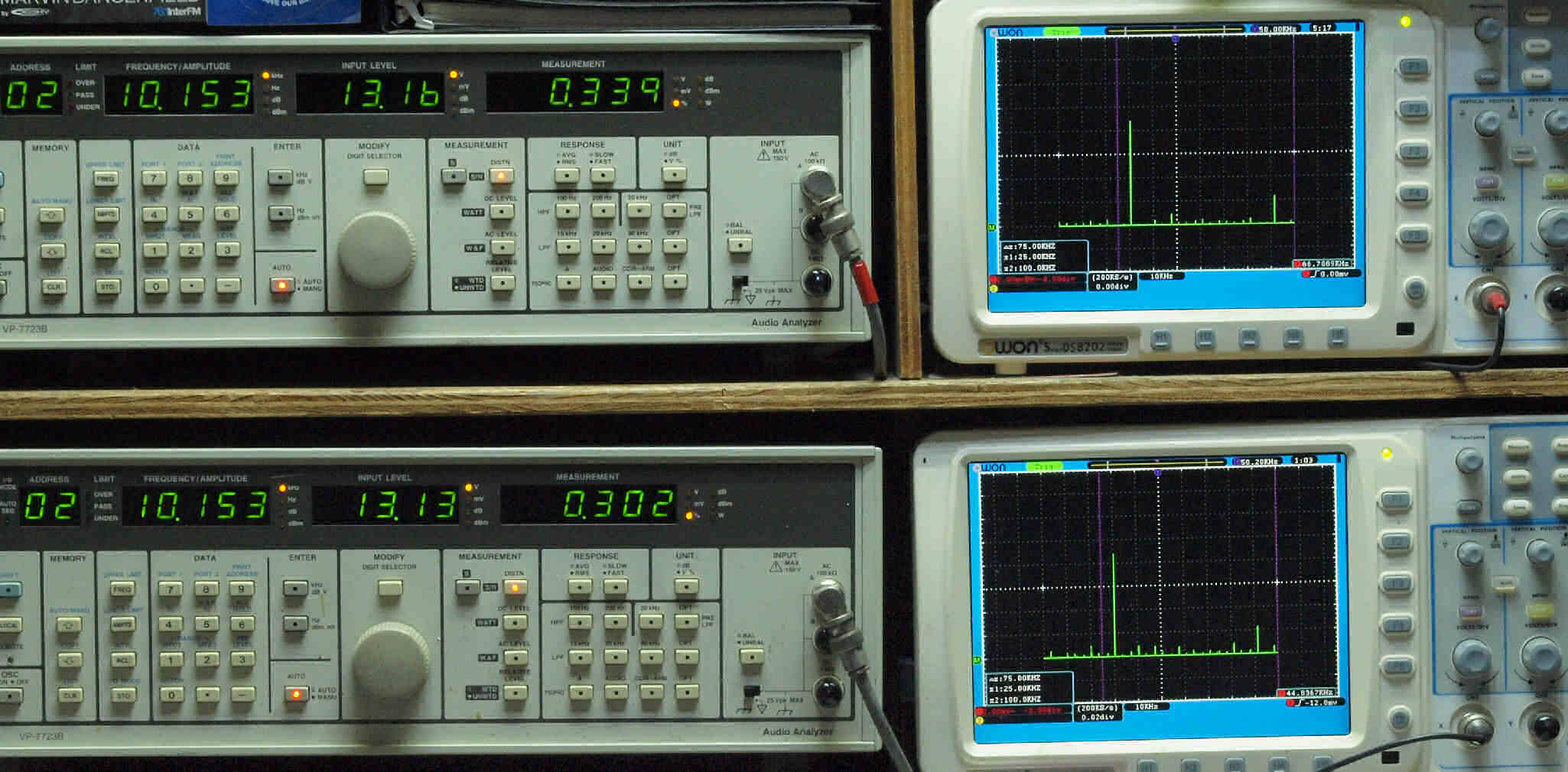 よって、ダイアル設定出力レベルより低くなります。測定機器の仕様や整備の様子はこちら、「VP−7723B」「VP−7201A」。 FFT画面の見方はこちら。