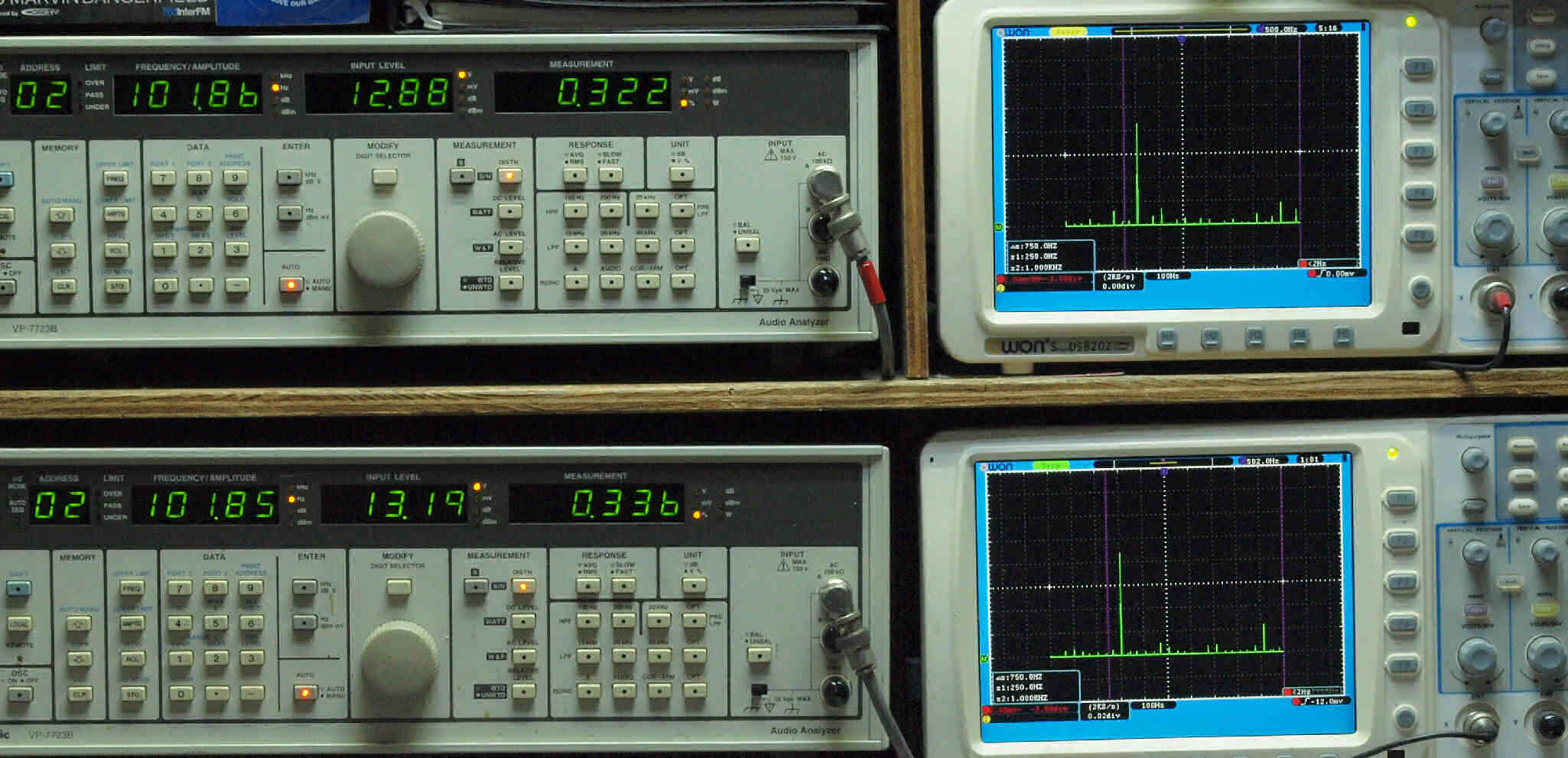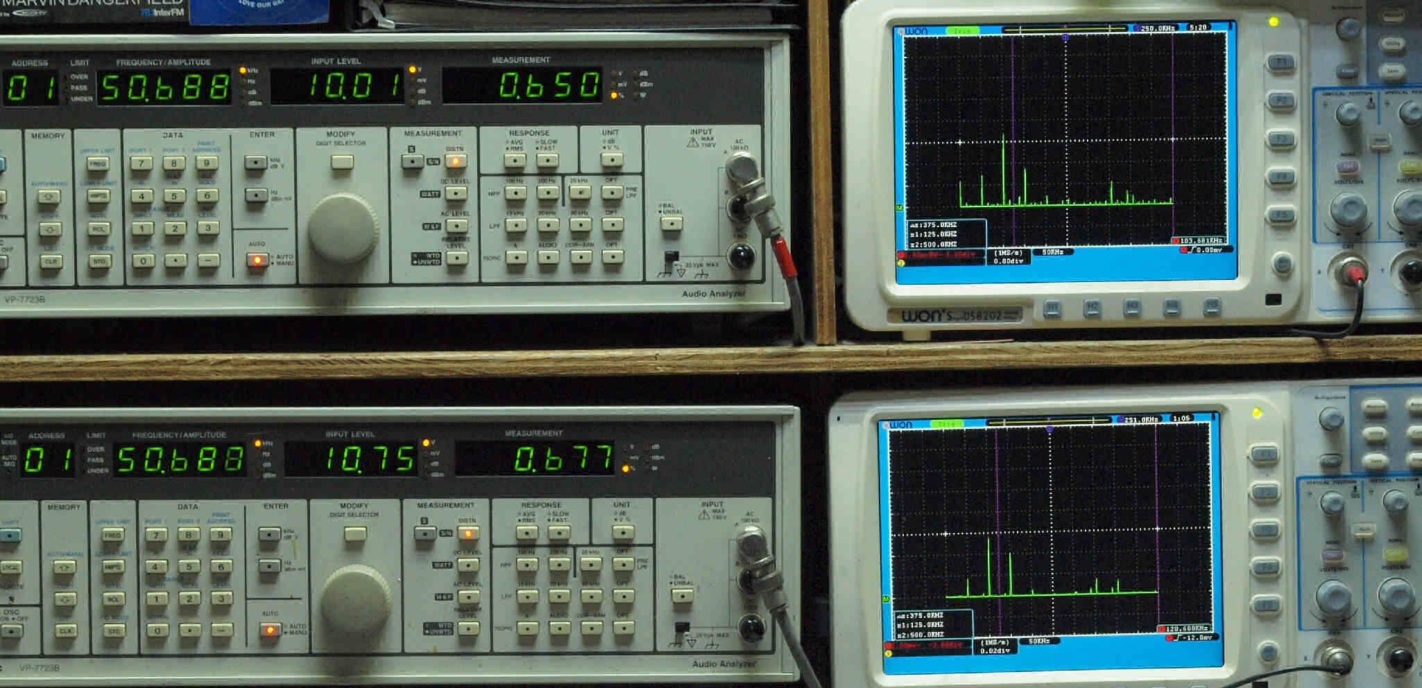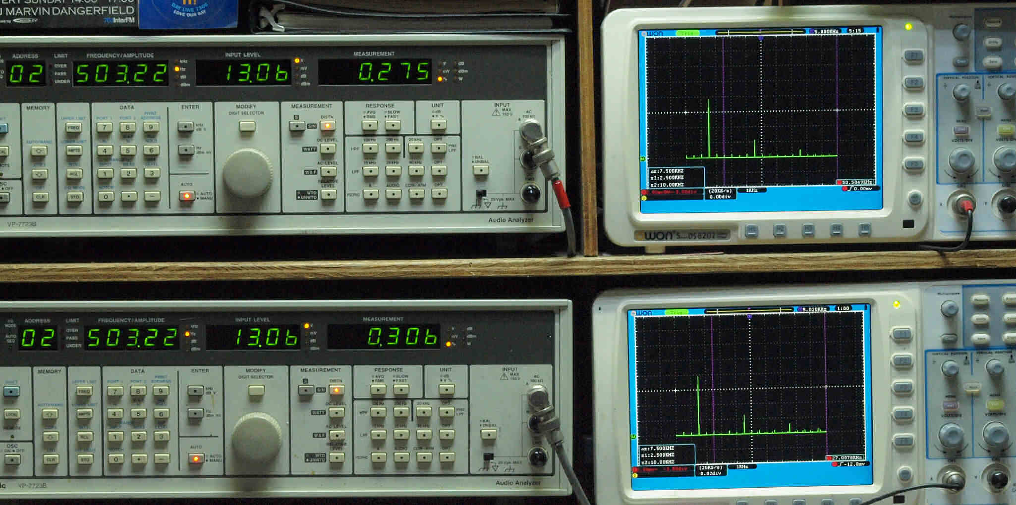 よって、ダイアル設定出力レベルより低くなります。測定機器の仕様や整備の様子はこちら、「VP−7723B」「VP−7201A」。 FFT画面の見方はこちら。
