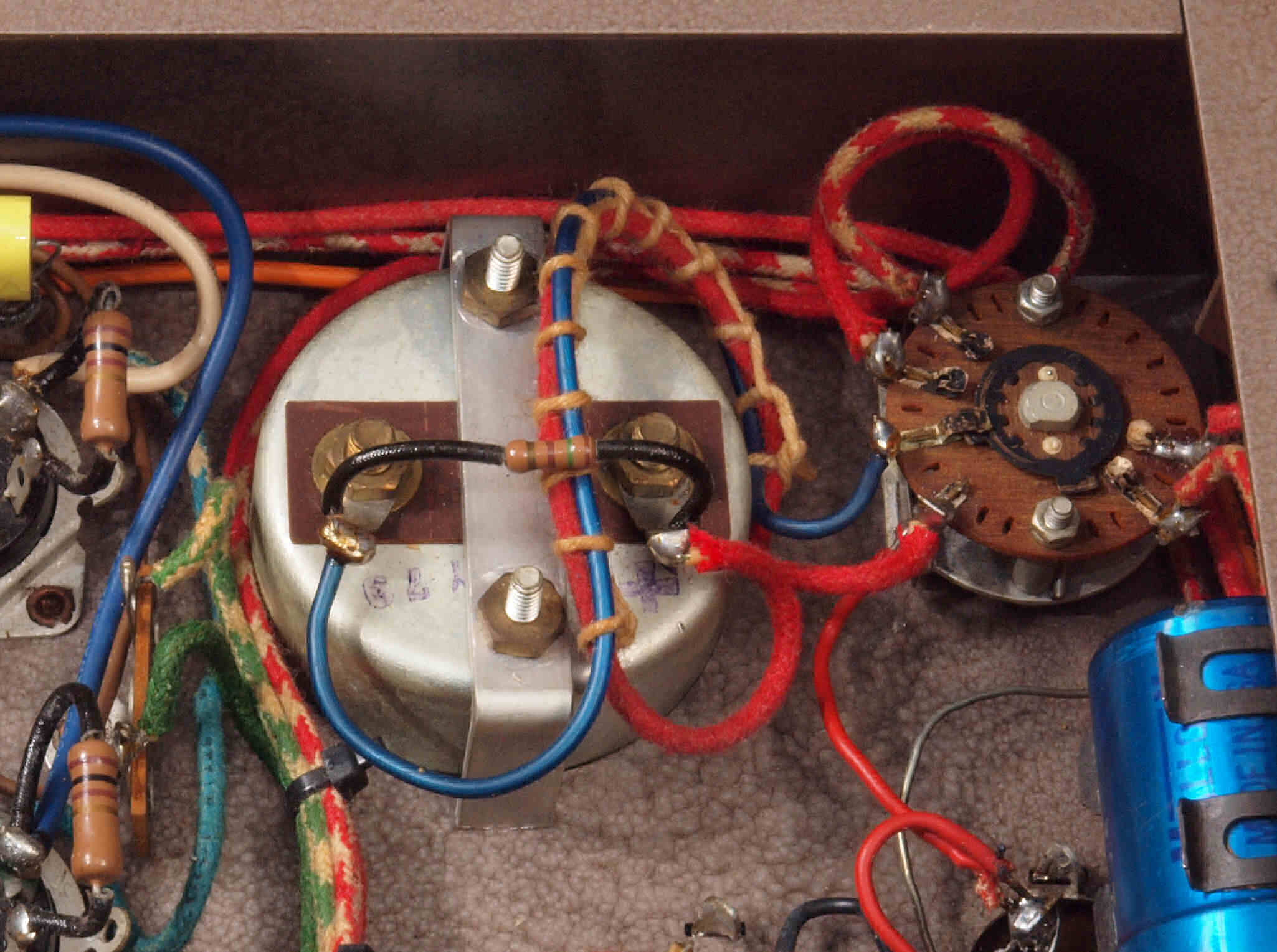 52. 修理後 メーター下配線と6CA7測定切り換えSW。出力トランス保護の為、ヒューズ4本を挿入する。