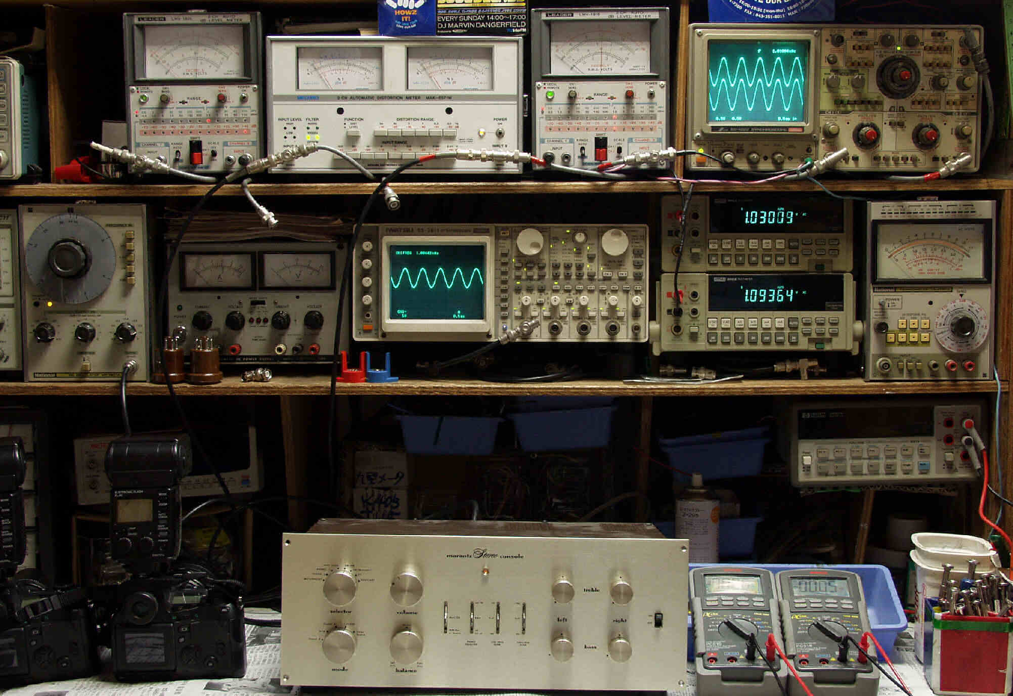 | T. 修理前点検測定 T1. 出力・歪み率測定 <見方> 下段左端 オーディオ発振器より400HZ・1KHZの信号を出し(歪み率=約0.003%)これをAMPに入力し、出力を測定 下段中左 オシロ=入力波形(オーディオ発振器のTTLレベル) 下段中右上=周波数計 上段左端 電圧計=L側出力電圧測定、黒針のみ使用 上段中左 歪み率計=出力の歪み率測定 左メータ=L出力、右メータ=R出力 上段中右 電圧計=R側出力電圧測定、赤針のみ使用 上段右端 オシロ=出力波形 上=R出力、下=L出力(実際にはRL電圧計の出力「Max1V」を観測) 下段中右上 デジタル電圧計=R出力電圧測定 下段中右下 デジタル電圧計=L出力電圧測定 |