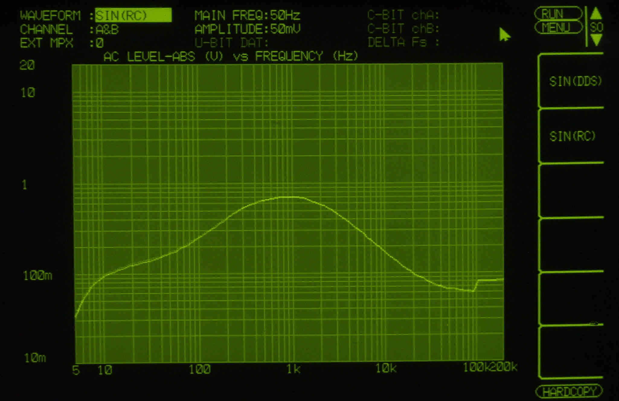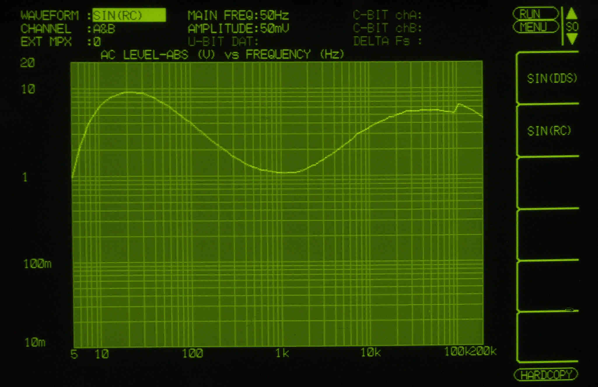 | F15. 入出力特性測定(AUX入力) LowFilter50HZ & HighFilter9KHZ ON。 AUX入力端子へ50mV一定入力 VRはmax 平均で1V出力。 左出力=薄(細い)色 右出力=濃い(太い)色 |