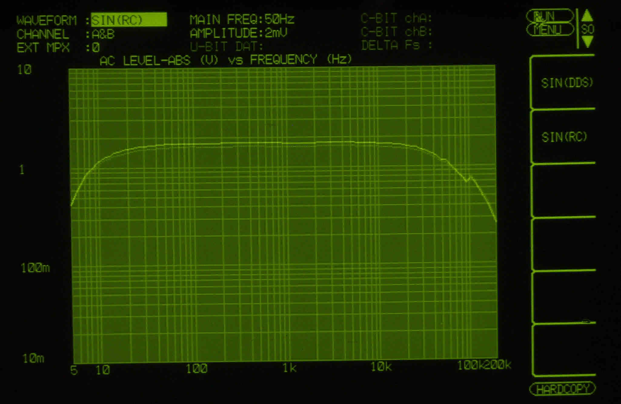 | E41. 出力電圧10V 歪み率=0.9%(測定レンジ=1%) AUX力 1000HZ。 右側は真空管が元気なので、この直ぐ上で飽和する。 | ||||||||||||||||||||||||||||
