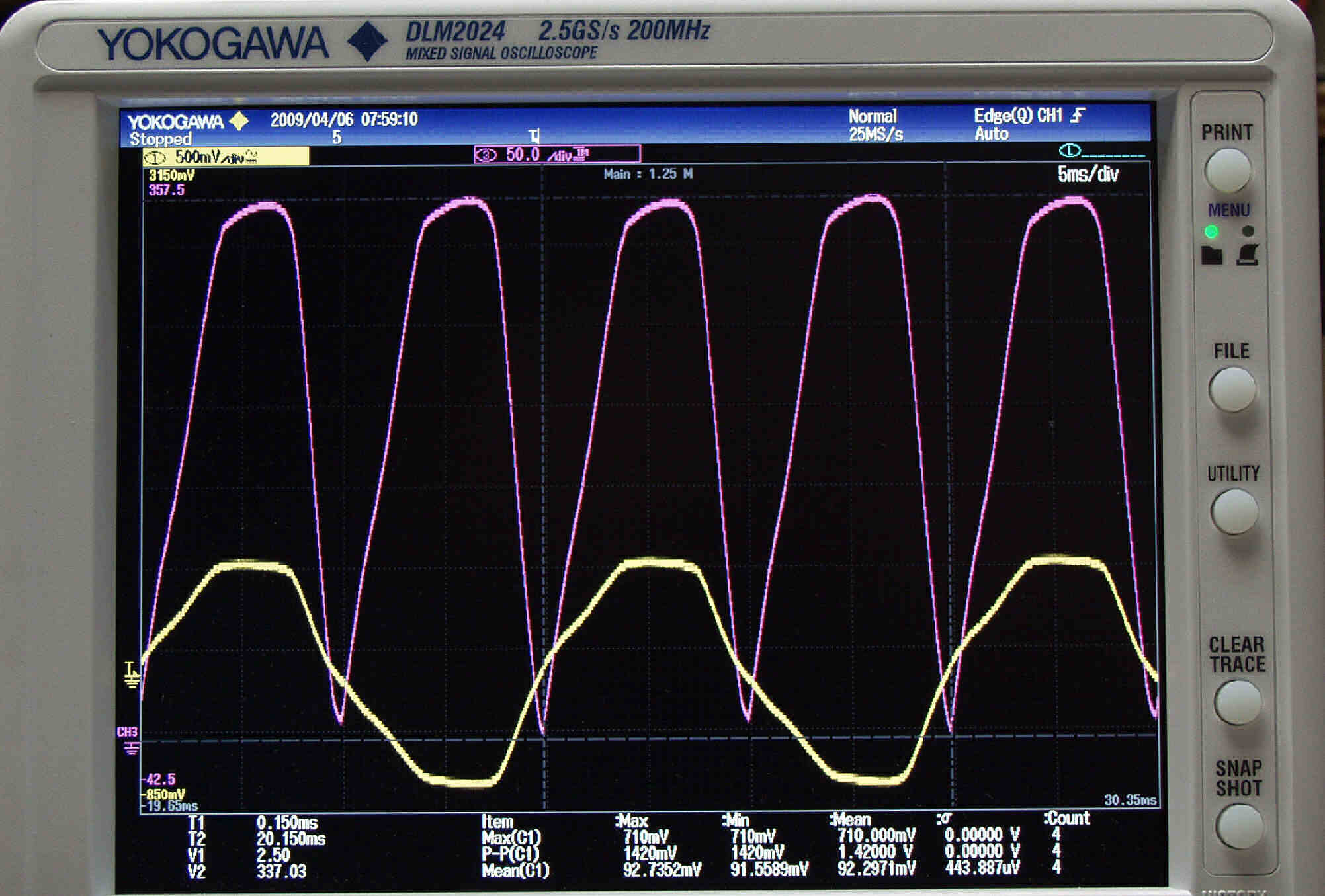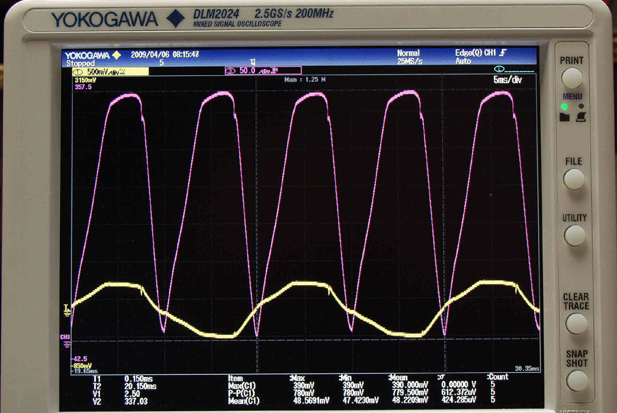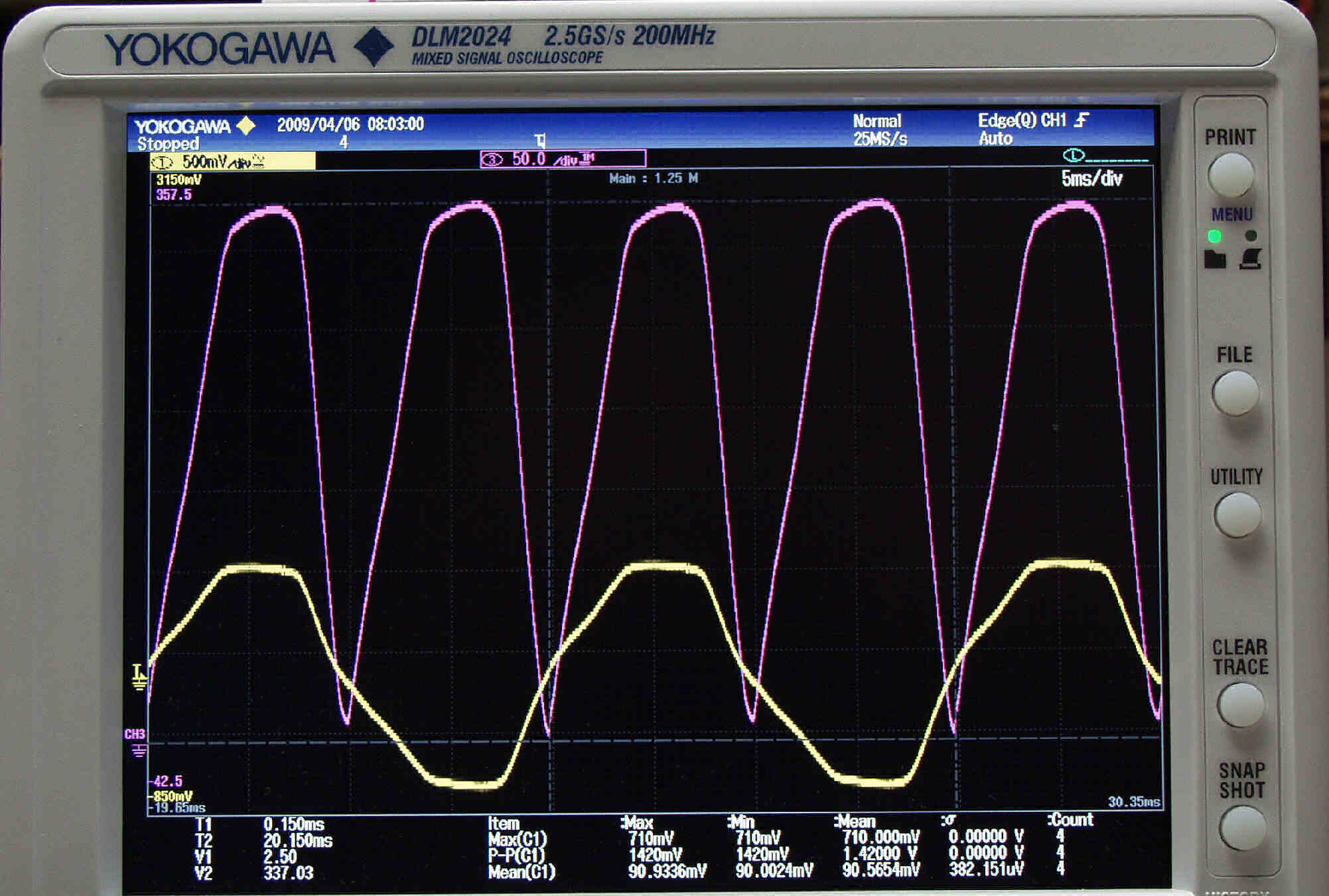 | E42. 出力電圧5V 歪み率=0.9%(測定レンジ=1%) AUX入力 400HZ。 右側は真空管が元気なので、この直ぐ上で飽和する。 | ||||||||||||||||||||||||||||