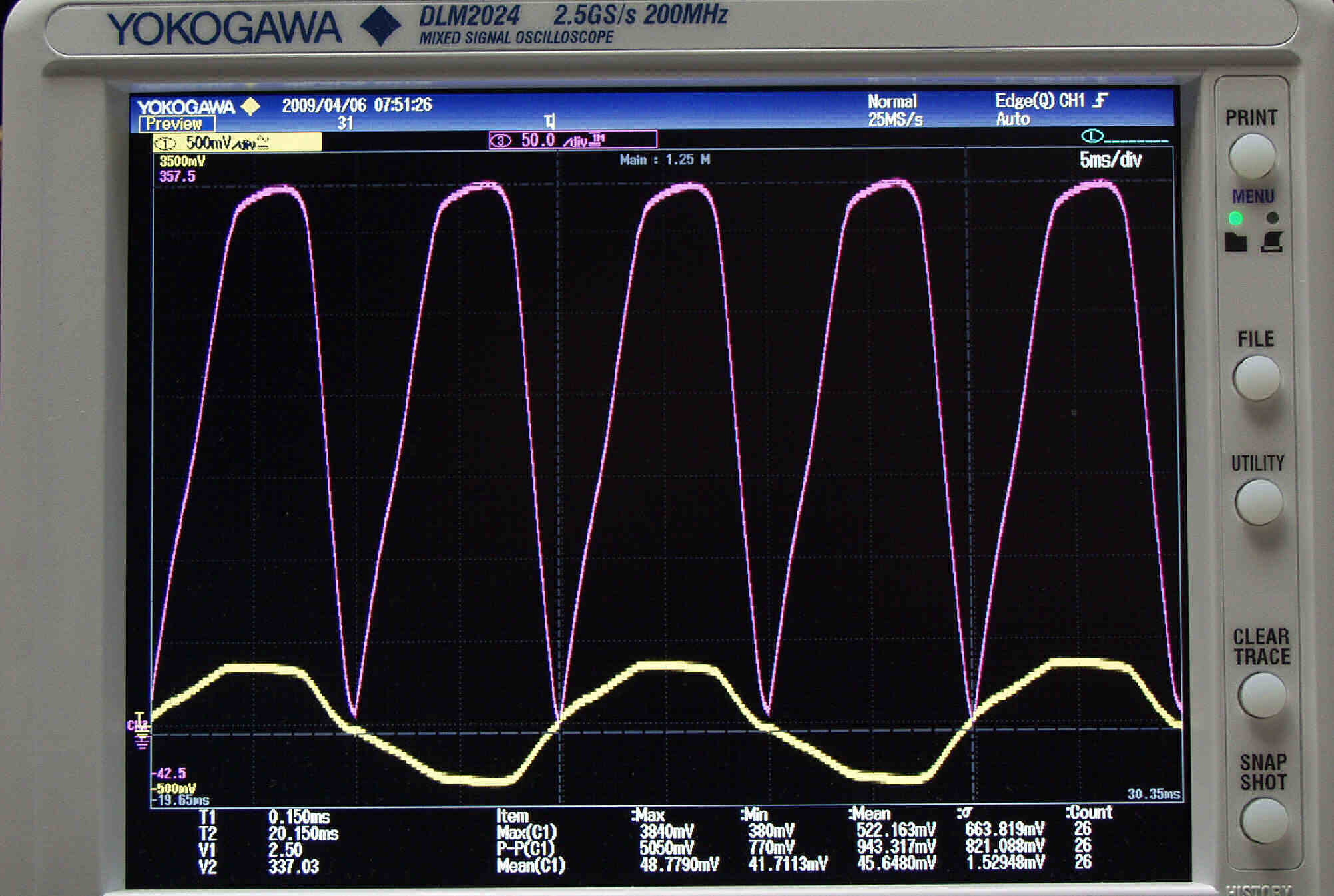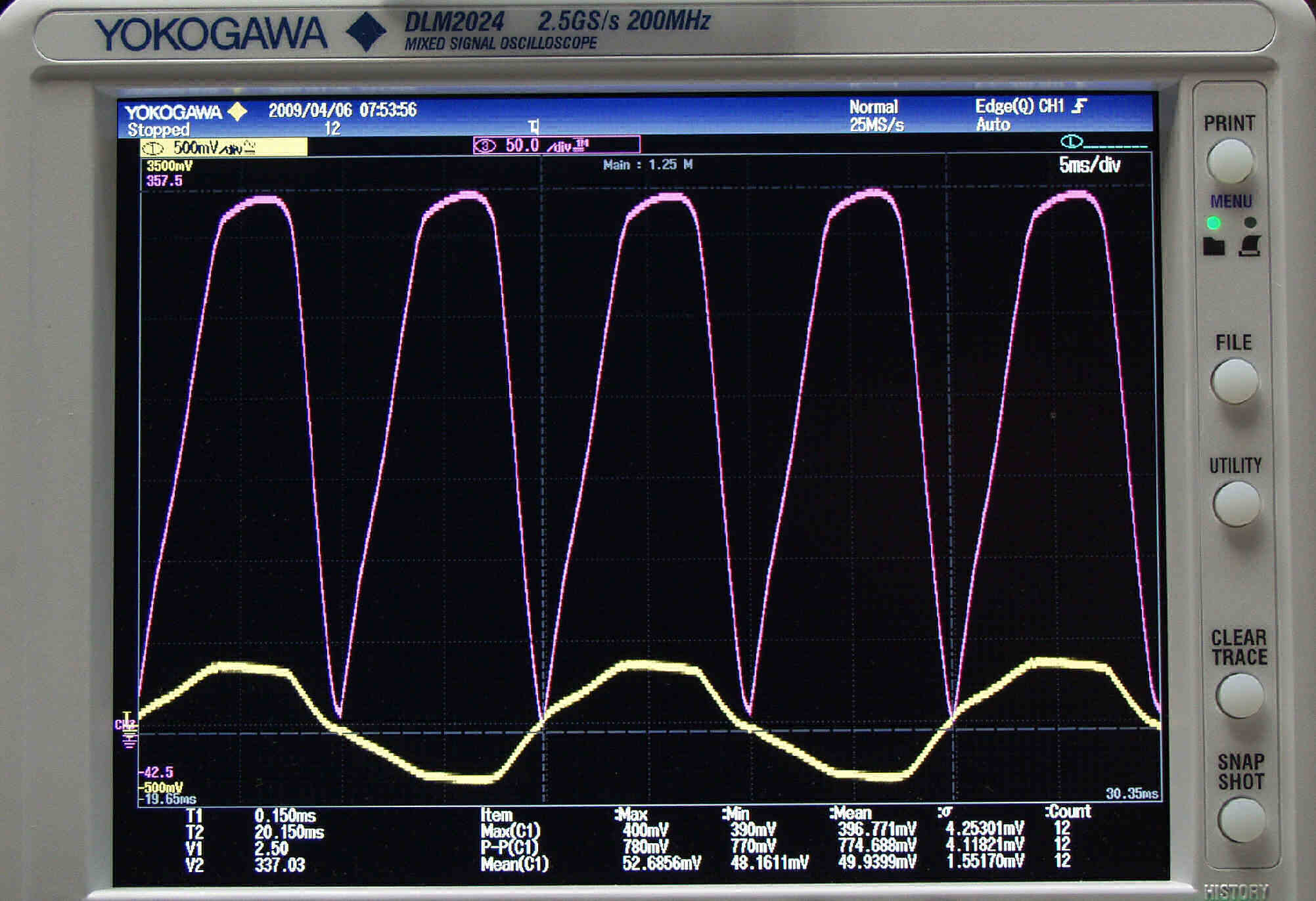 | U63. 付属ECC83「 V6」測定の入出力波形。 赤色=グリッド電圧、黄色=プレート電圧 | ||||||||||||||||||||||||||||