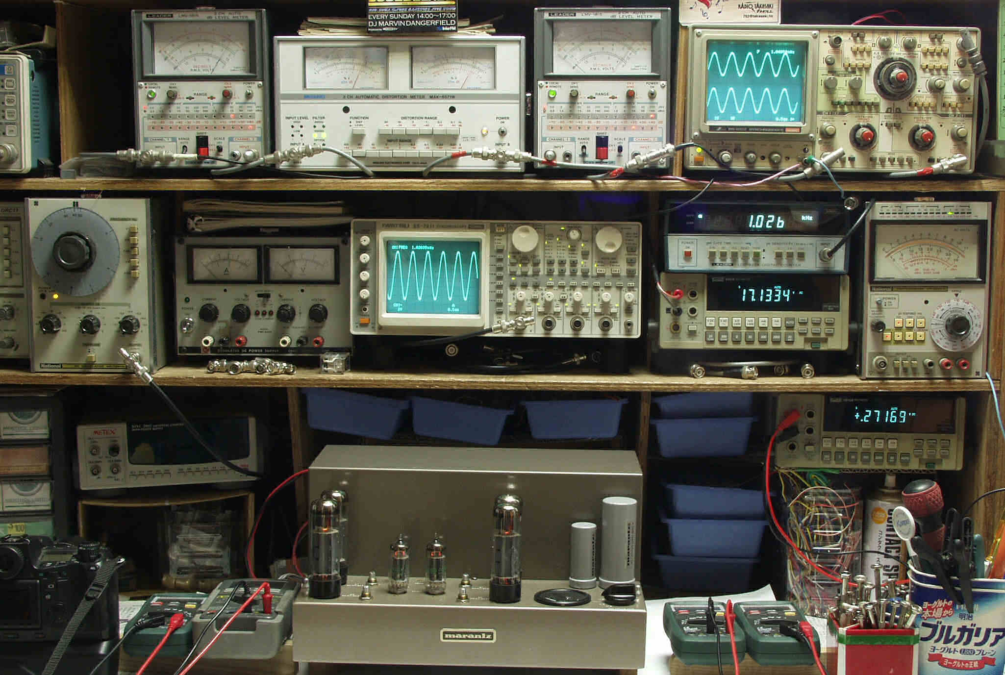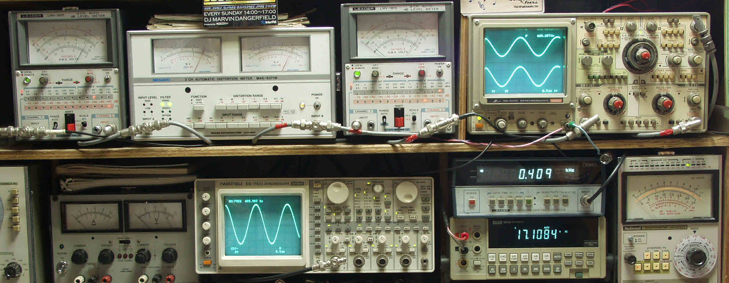 下左オーデオ発振器より400HZ・1KHZの信号を出し(歪み率=約0.003%)これをAMPに入力し、SPからの出力を測定